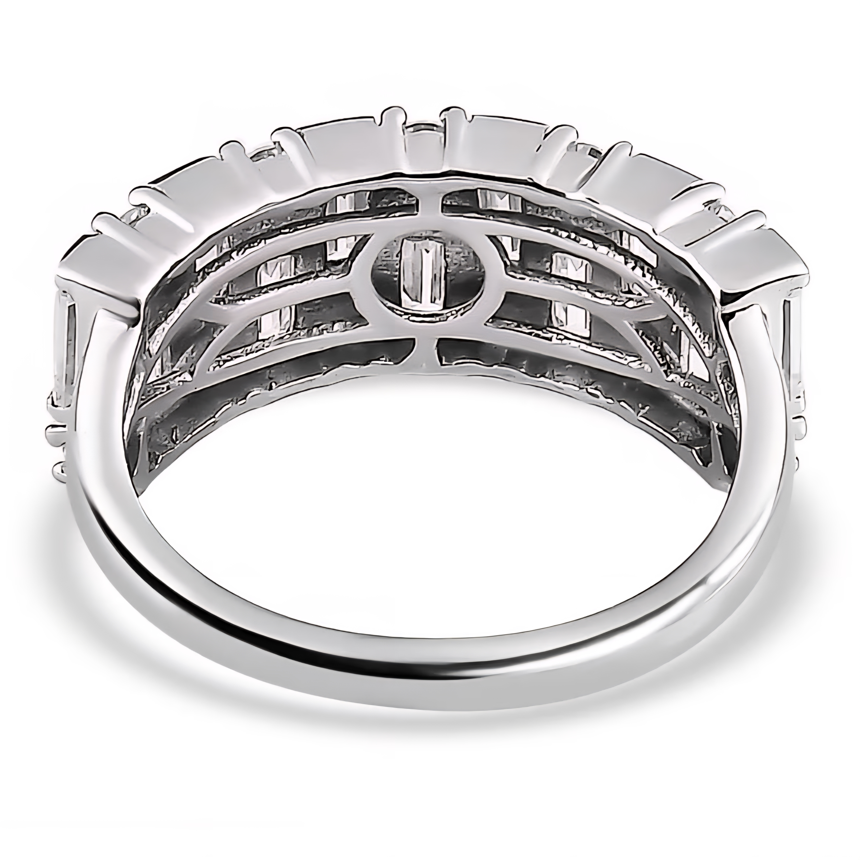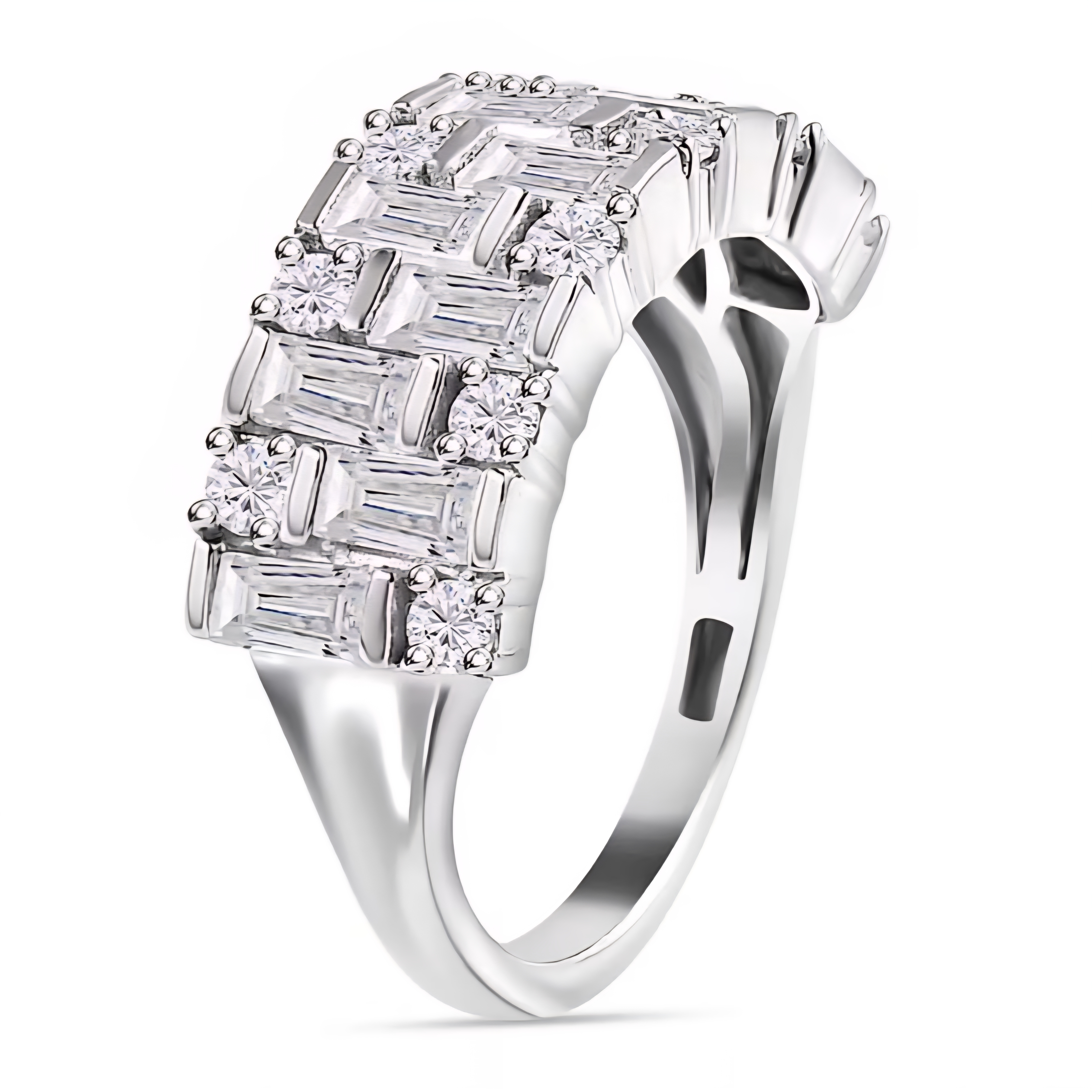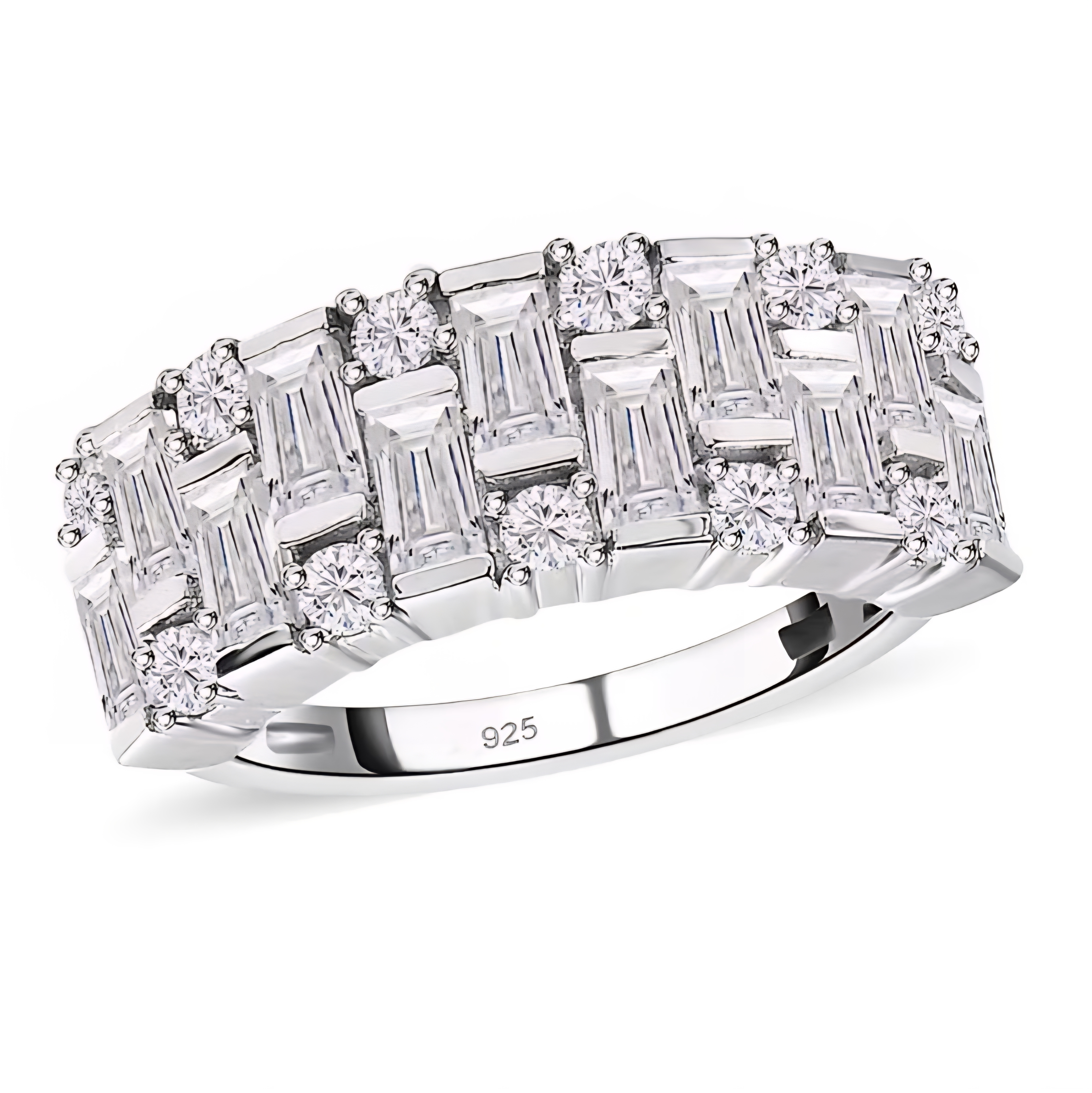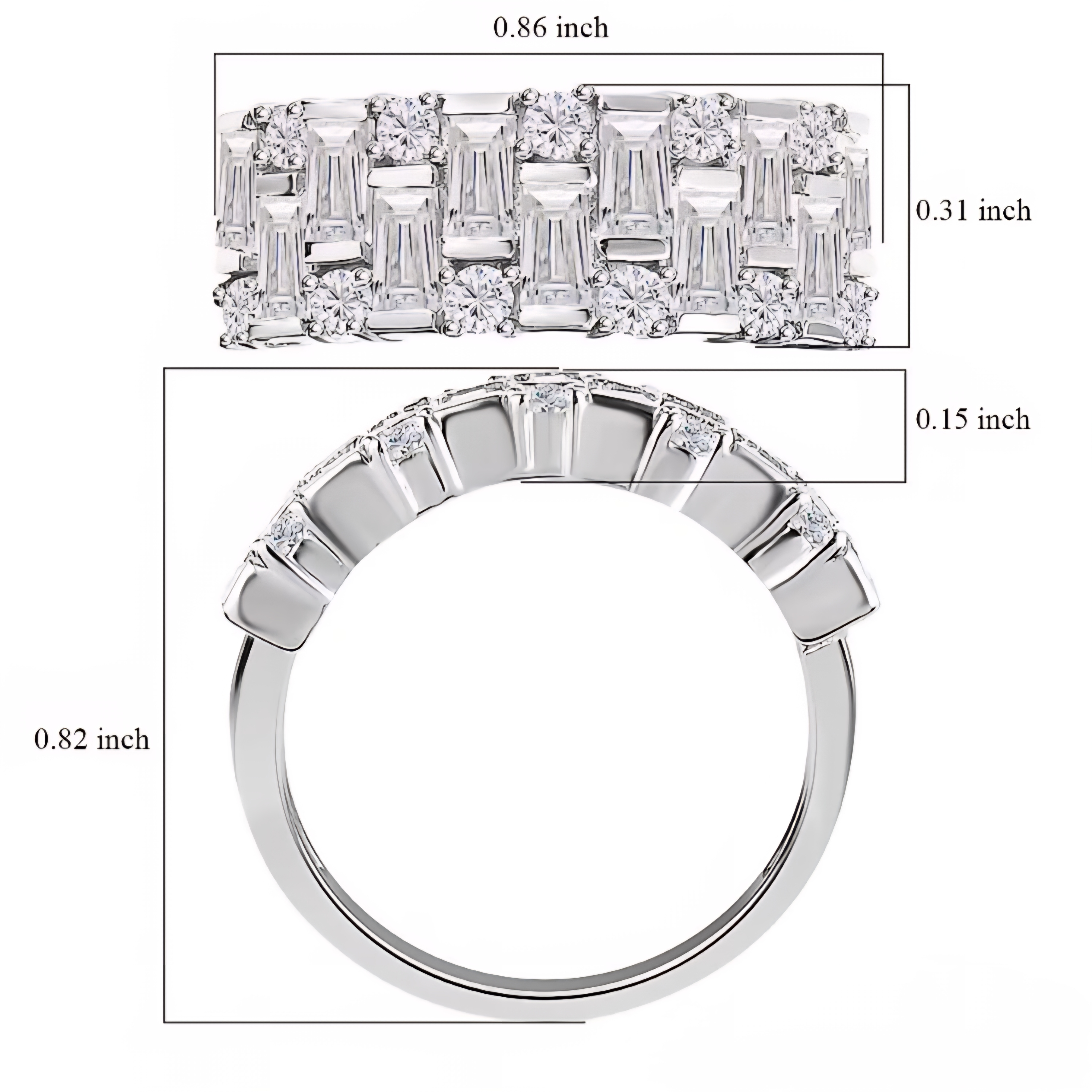 This bold band ring features a structured cluster of colorless baguette cut moissanite, accented with round moissanite for added brilliance and dimension. The mixed shape layout creates a clean, geometric look with strong sparkle across the top of the ring, making it a standout choice for stacking or wearing solo. Crafted in solid 925 sterling silver and finished in rhodium plating, this piece offers a bright white metal finish that enhances the crisp fire and brilliance moissanite is known for.