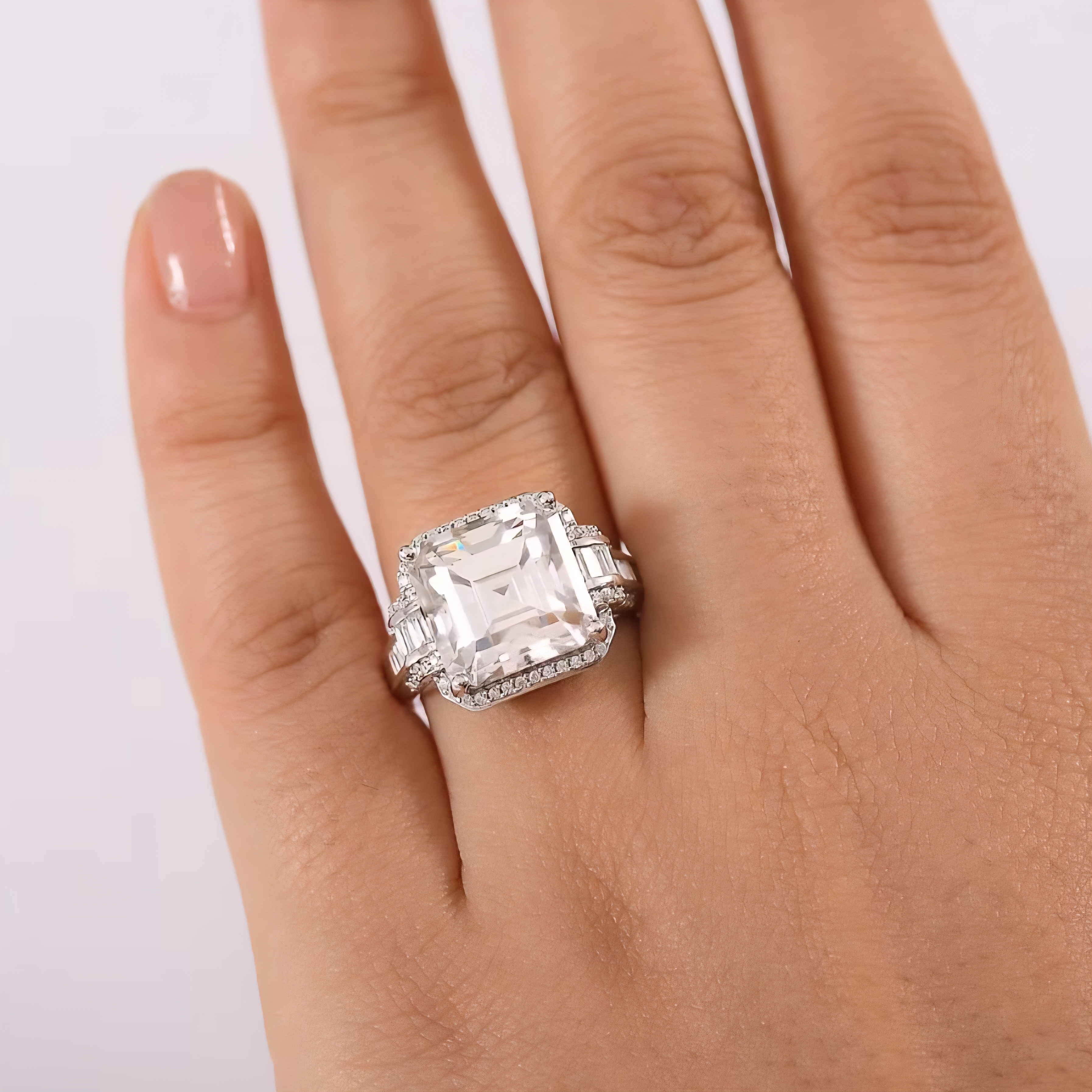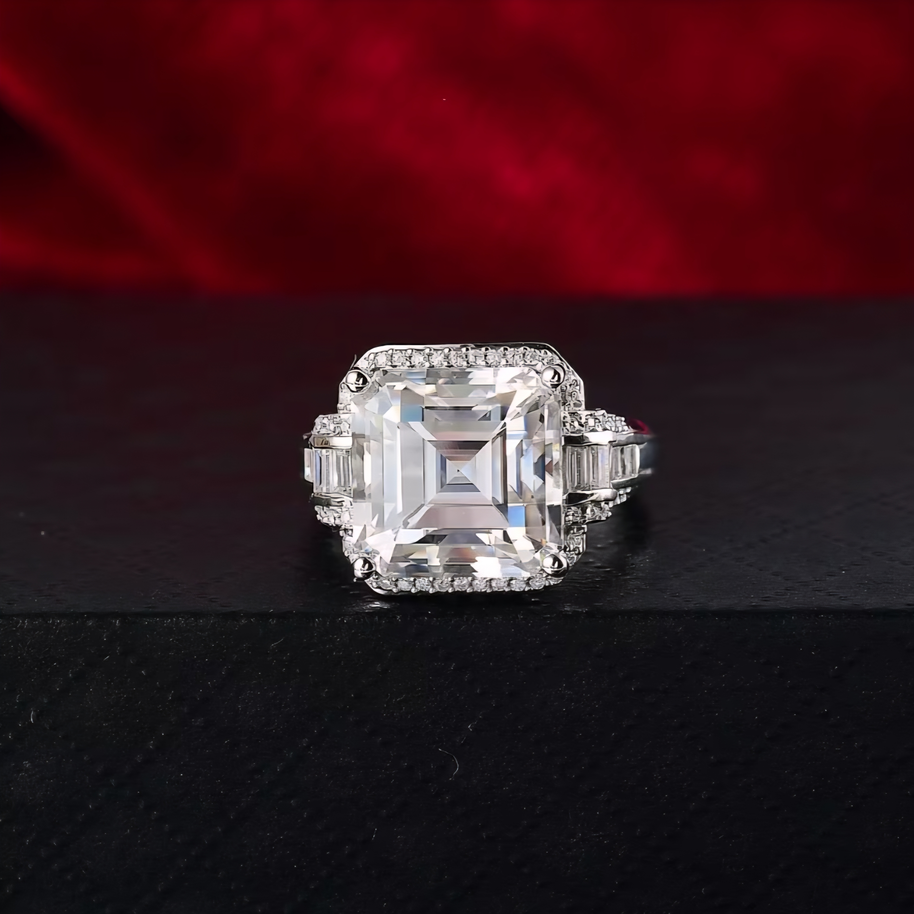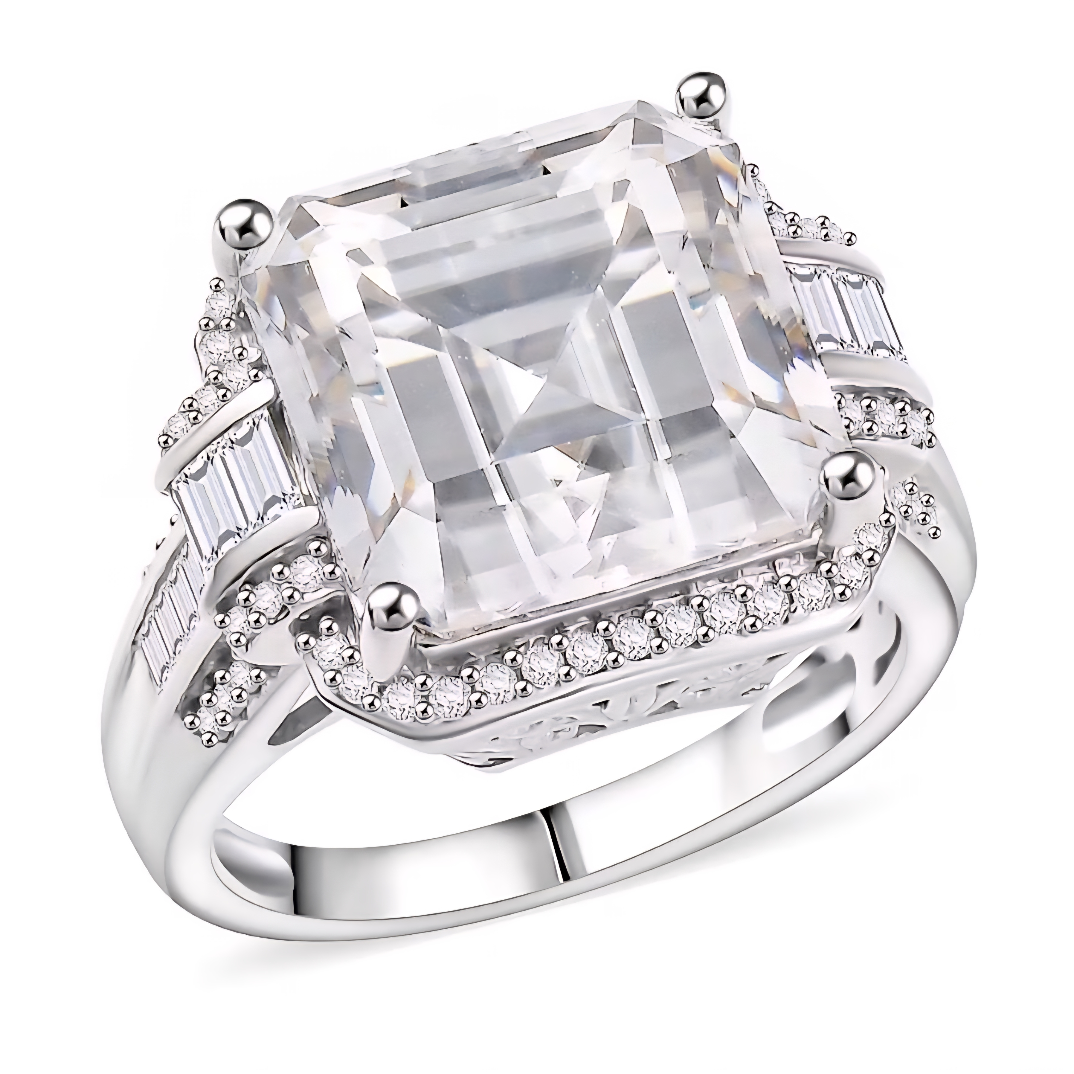 This showstopping moissanite ring radiates pure brilliance from every angle. Centered with a massive 9.09ct square emerald-cut moissanite, the design is elevated by tapered baguette and round-cut moissanite accents that catch and scatter light with diamond-like fire. The geometric layout and clean, high-polish lines evoke modern luxury, while the rhodium-plated sterling silver setting ensures enduring shine and strength. A true statement of clarity and craftsmanship.