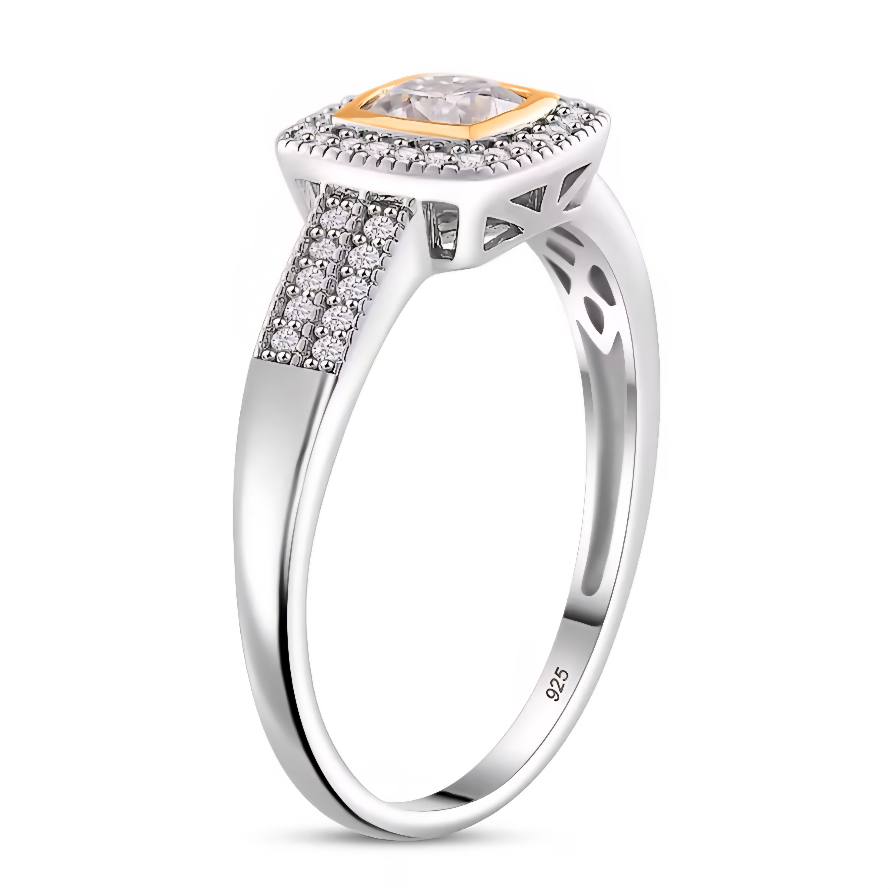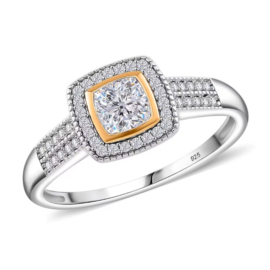 This refined halo ring features a square cushion cut colorless moissanite at the center, framed by a delicate halo of round moissanite for crisp brilliance. The shoulders add extra sparkle and structure, creating a clean, modern silhouette that still feels timeless. Crafted in solid 925 sterling silver with a two tone finish of 18K yellow gold and rhodium plating, this ring balances warm and cool metal tones while highlighting the fire and brightness moissanite is known for.