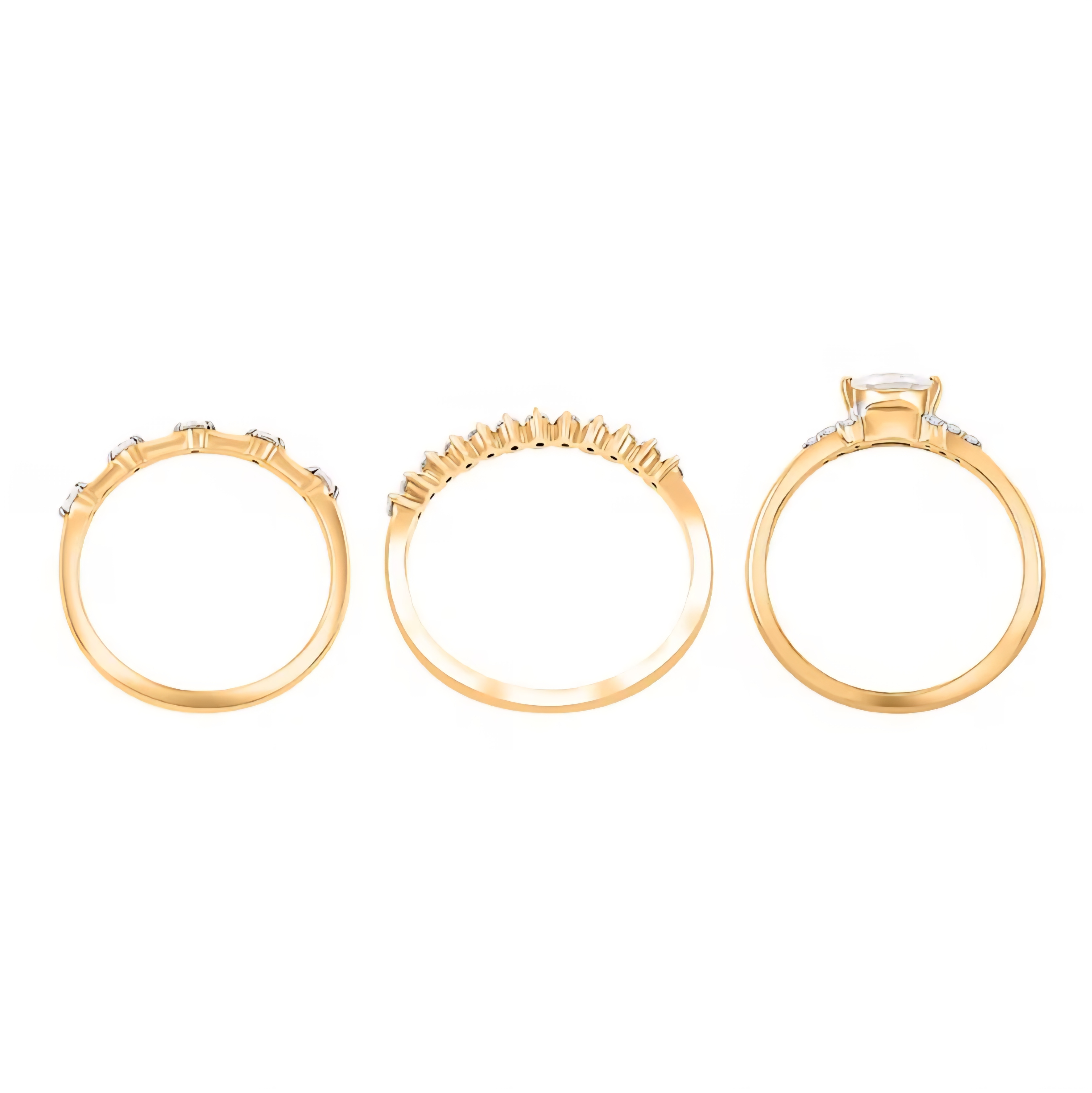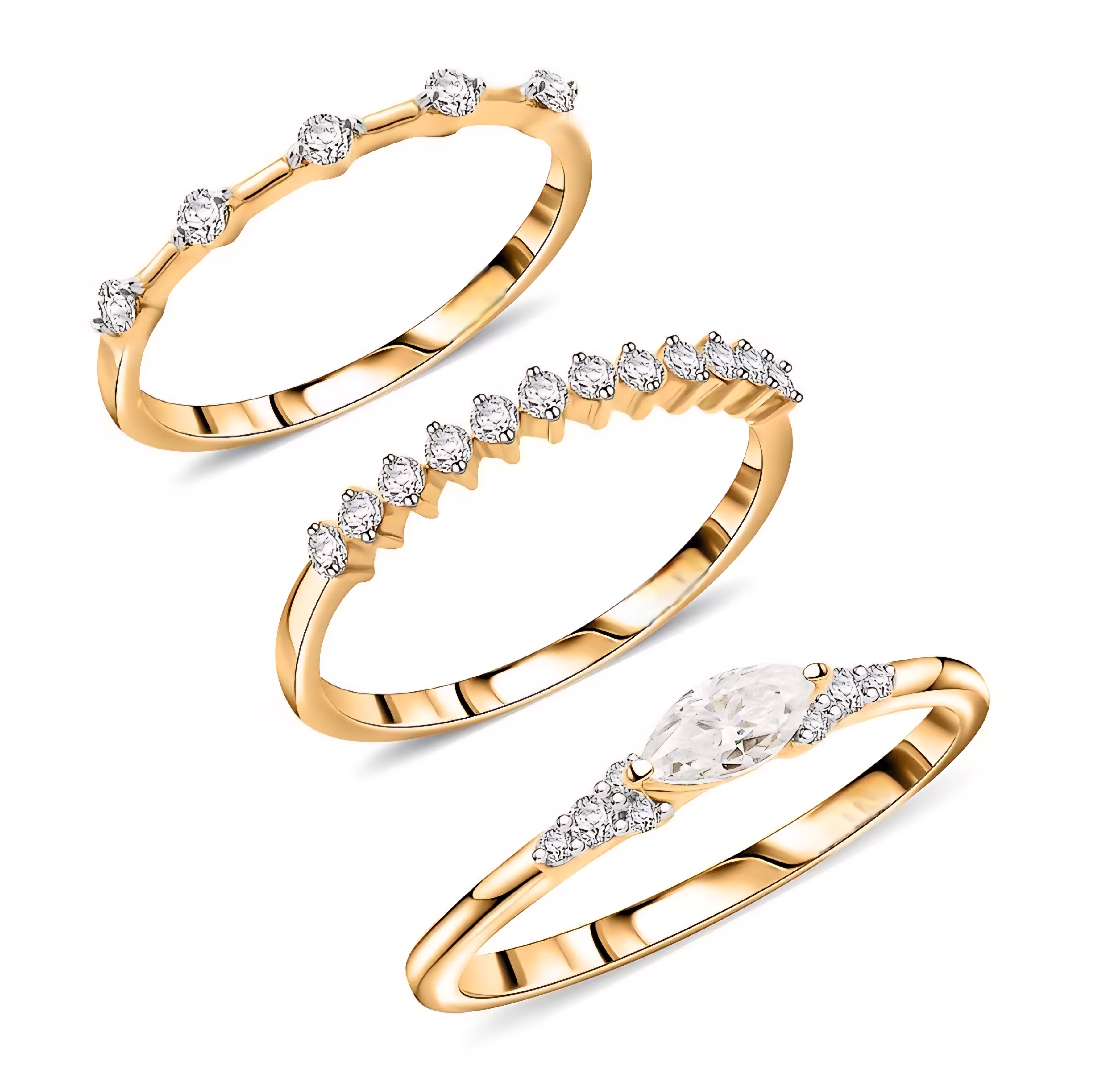 This three ring stack is designed for versatility and refined sparkle. Crafted in solid 10K yellow gold, the set features a marquise cut moissanite center ring paired with two coordinating bands accented with round moissanite stones.