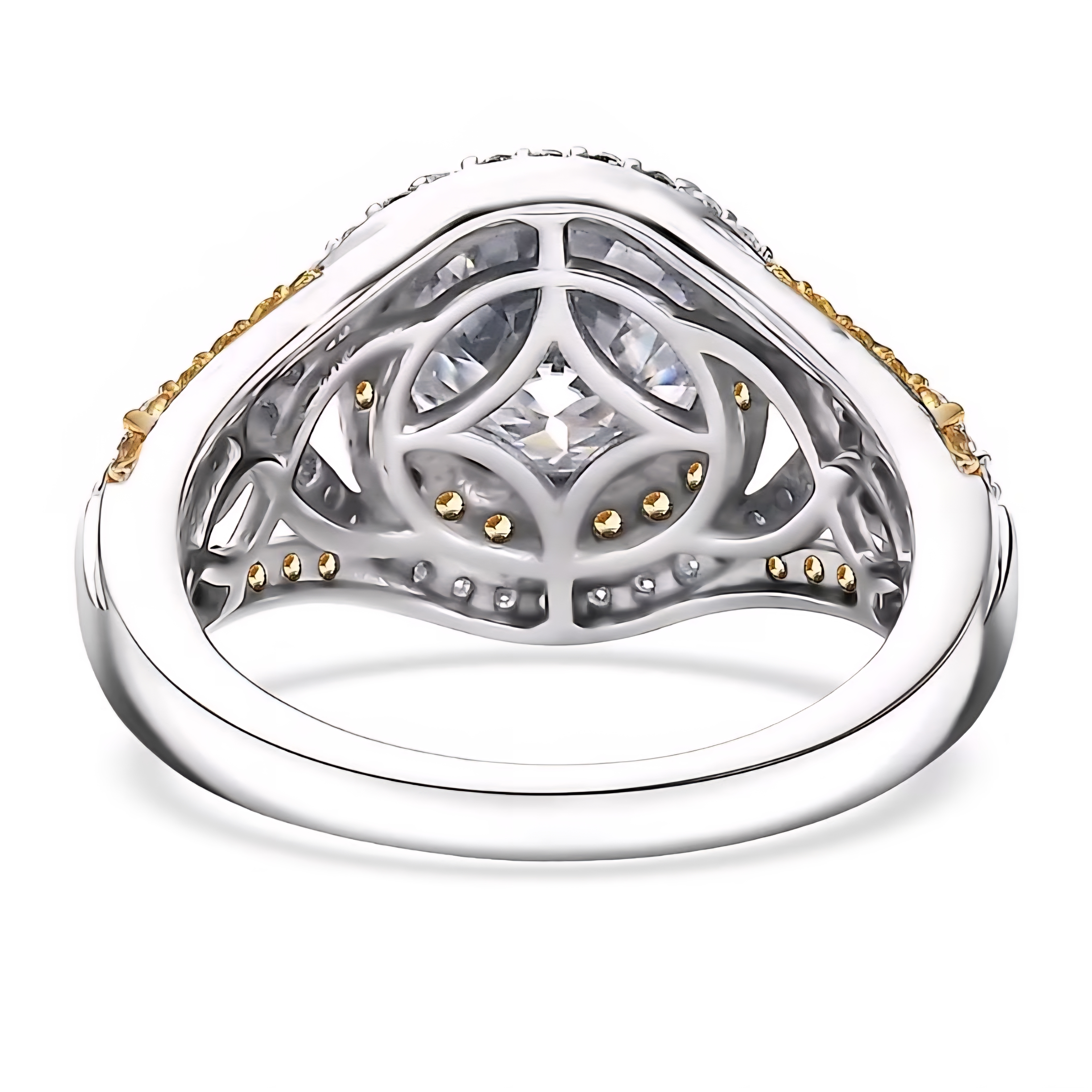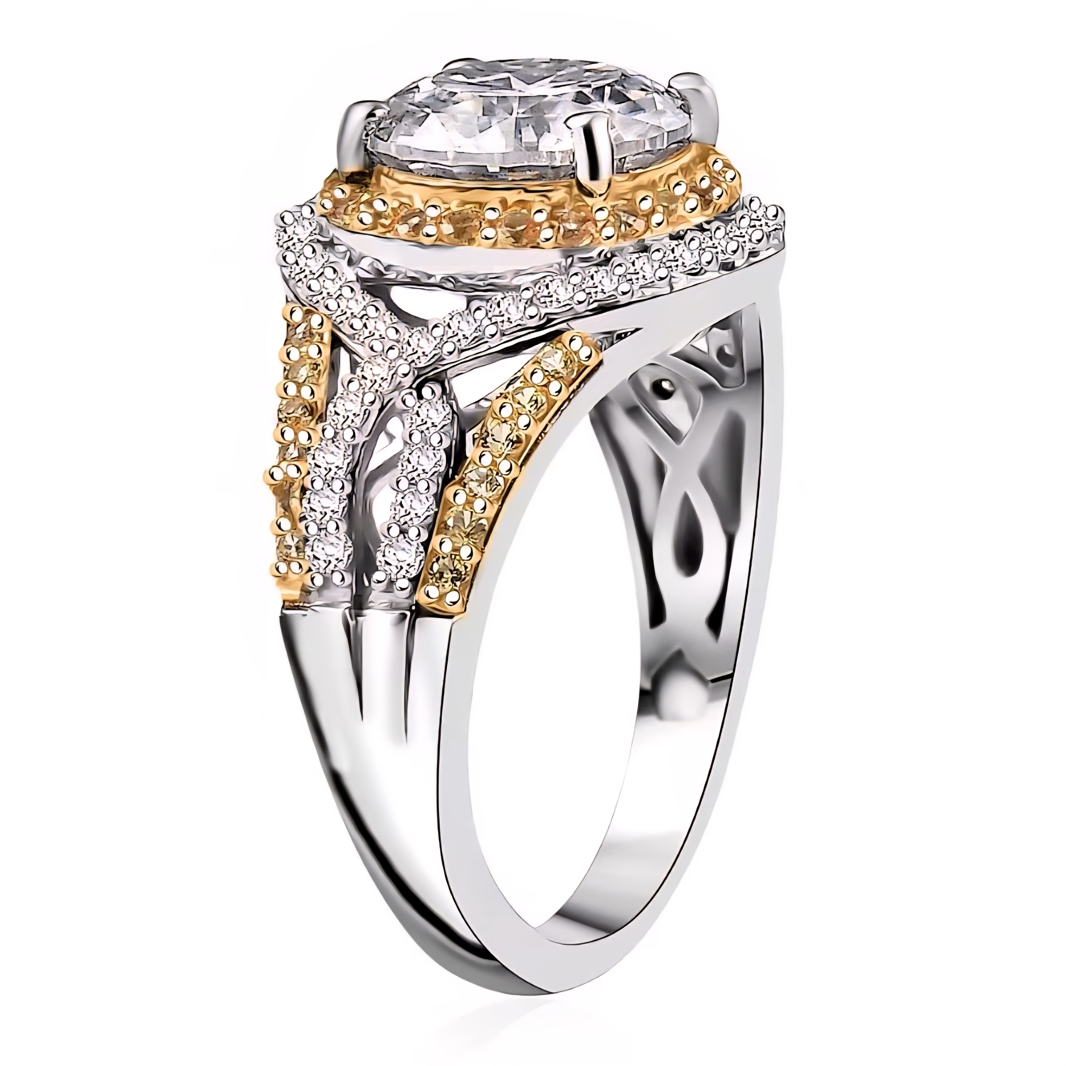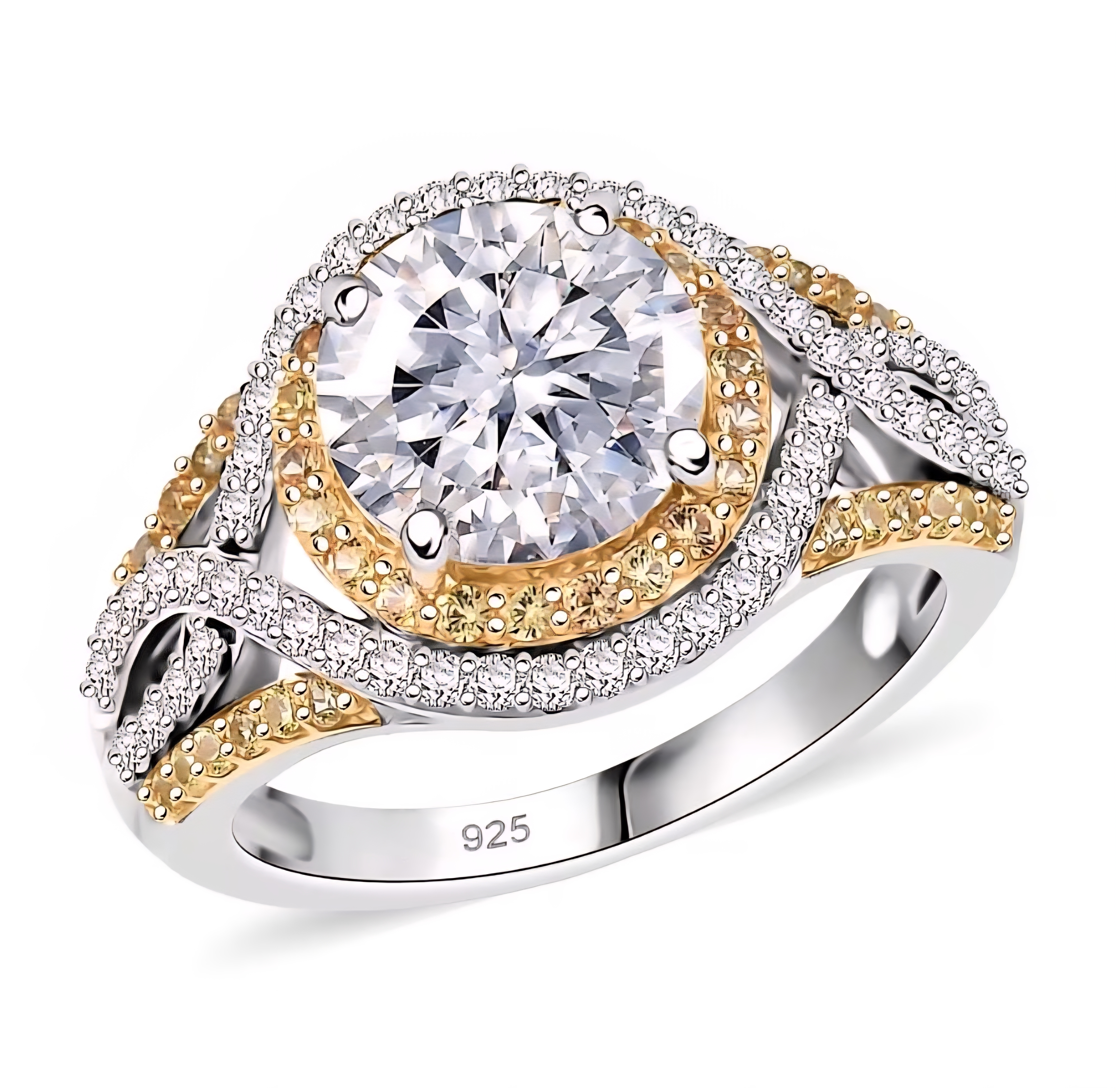 This bold halo ring pairs high-impact sparkle with rich contrast, centered around a brilliant round moissanite framed by vibrant yellow sapphire accents. A sculptural double halo design wraps the center stone in layered dimension, while flowing split shoulders add movement and depth across the band.