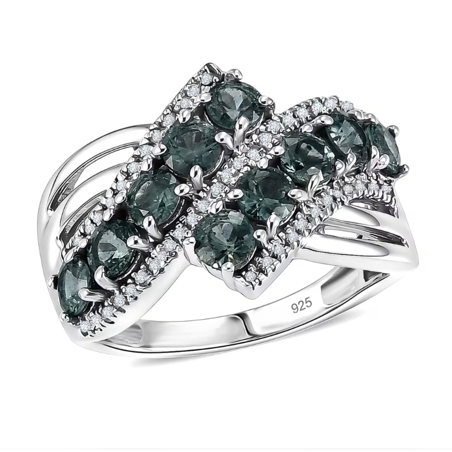 The sapphires show a green-blue color mix, giving the ring depth and natural variation. Between the rows, white zircon accents add brightness and help define each section, creating contrast that keeps the design clear and structured.