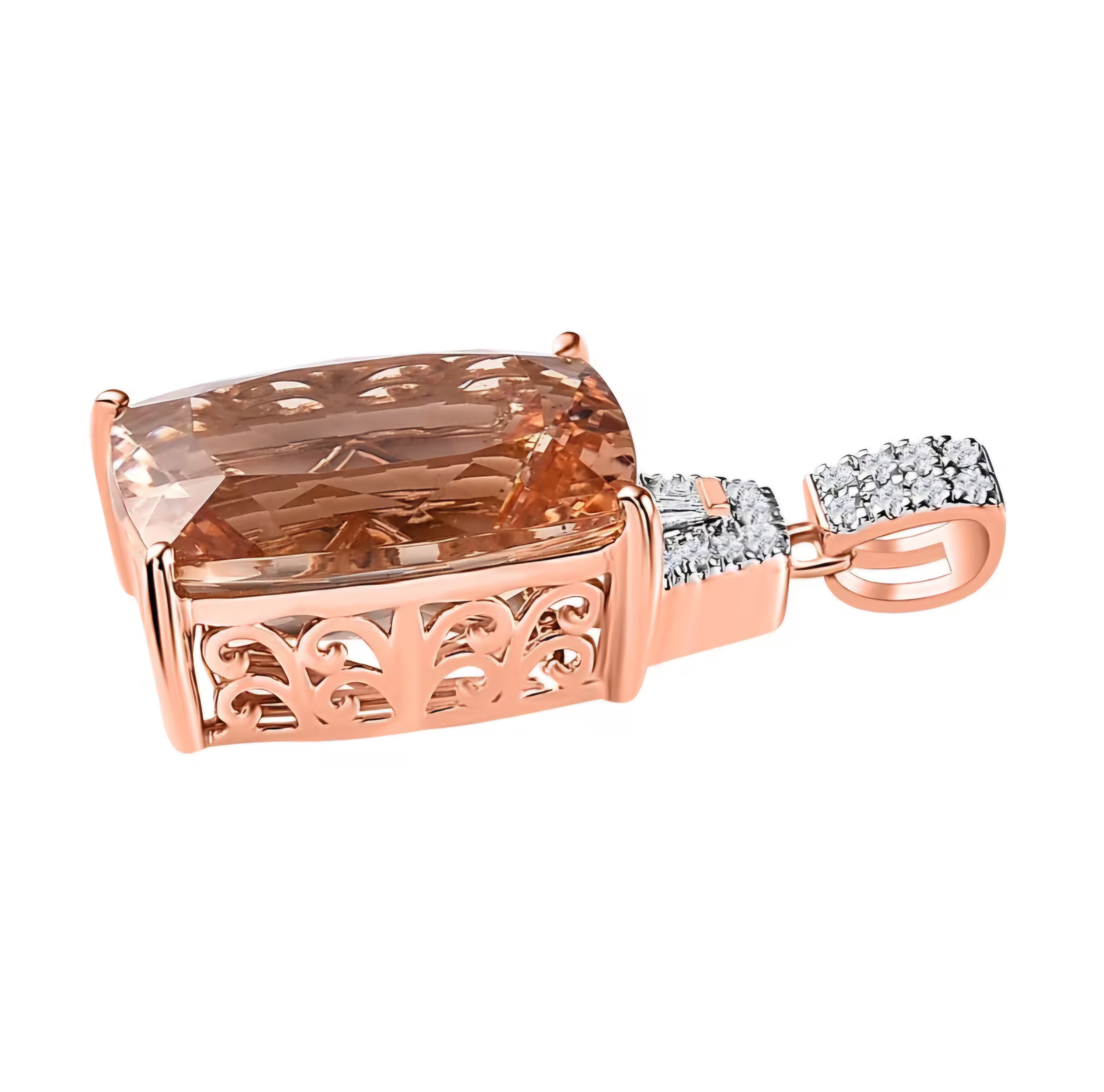 Adorn yourself with the soft, peachy allure of this exquisite pendant. A magnificent cushion-cut morganite, radiating a gentle glow, takes center stage. A geometric design of sparkling diamonds, set in 14K rose gold, enhances the pendant's modern elegance. Customize the chain length to your preference. This pendant is a testament to refined beauty and contemporary design. Design your own blush elegance today.