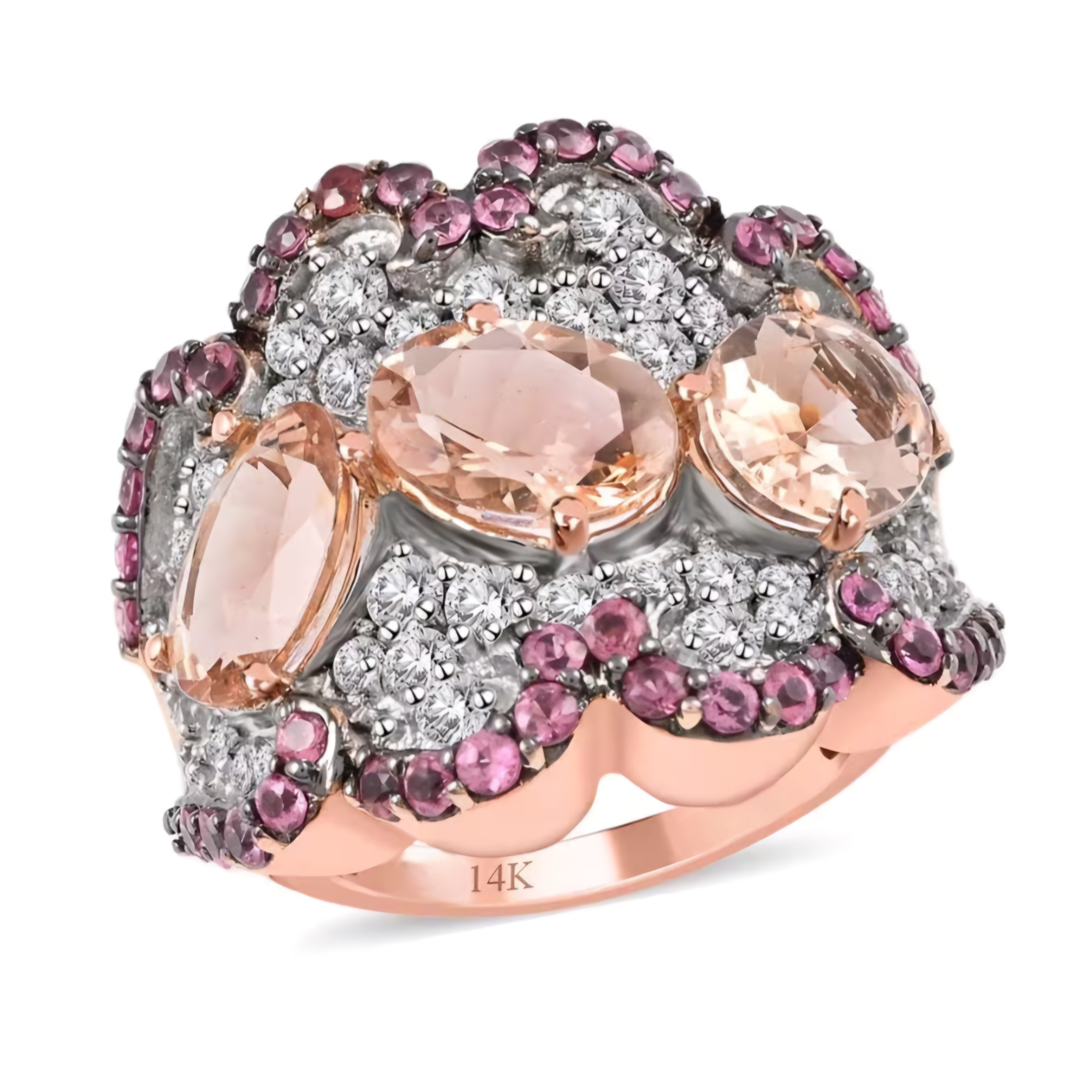 Elevate your jewelry collection with our exquisite Morganite, Pink Tourmaline & Lab White Sapphire Ring In 14K Rose Gold. With a total carat weight of 7.55ctw, this stunning ring is sure to turn heads and spark conversations. The soft pink hues of morganite and tourmaline are beautifully complemented by the brilliance of lab white sapphire, creating a harmonious and luxurious look. Crafted in high-quality 14K rose gold, this ring exudes elegance and sophistication. Treat yourself or a loved one to this timeless piece that will be cherished for years to come.