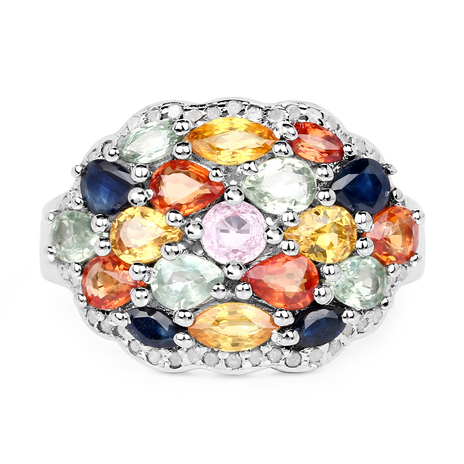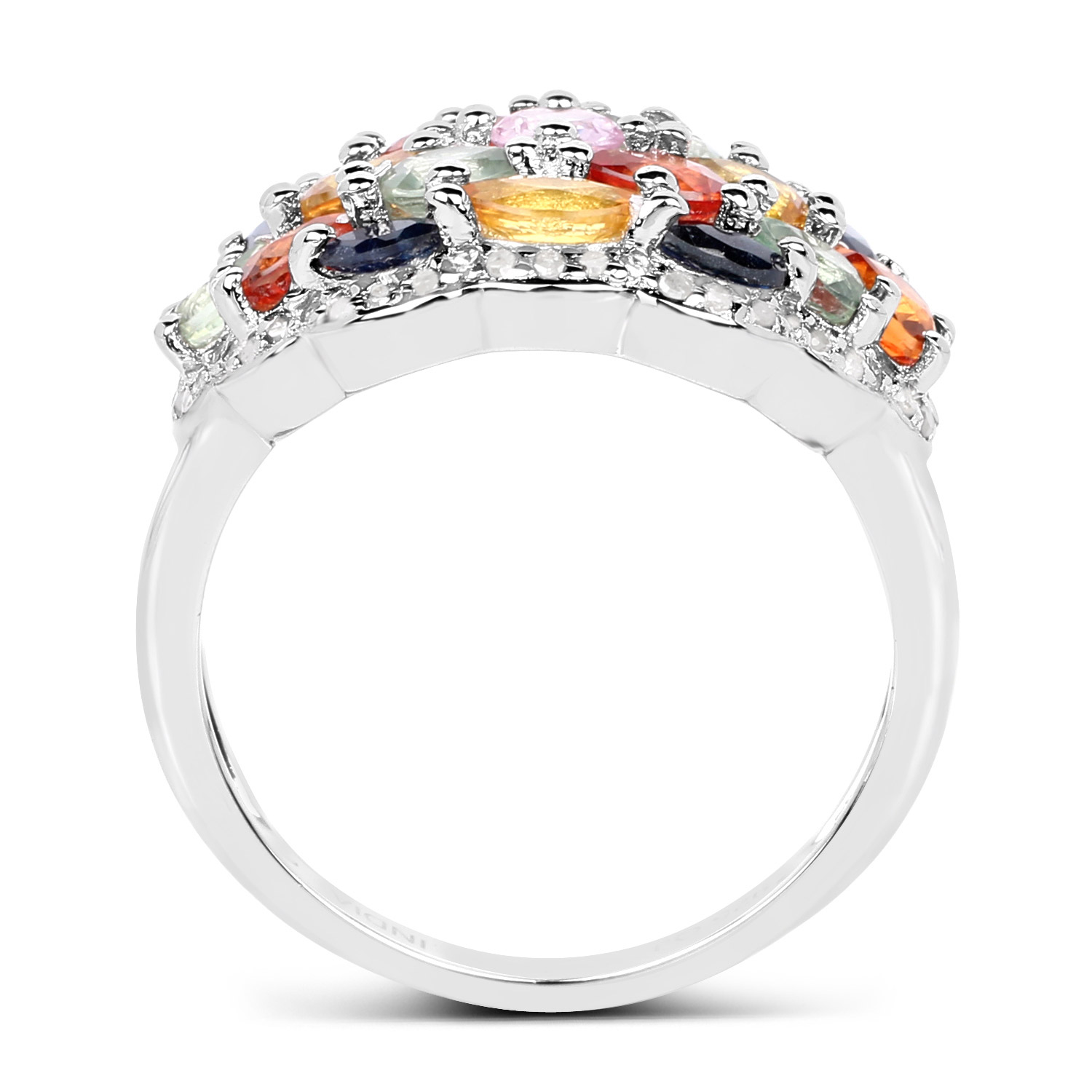 Crafted in rhodium-plated sterling silver, the setting provides a bright, polished finish that highlights both the vivid gemstone colors and the sparkle of the diamonds.