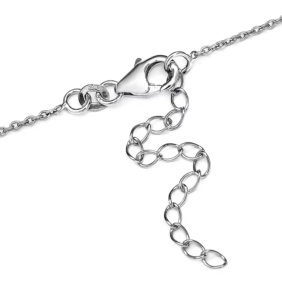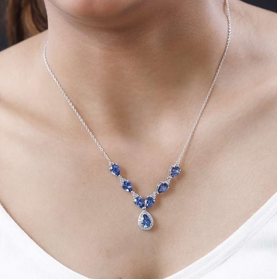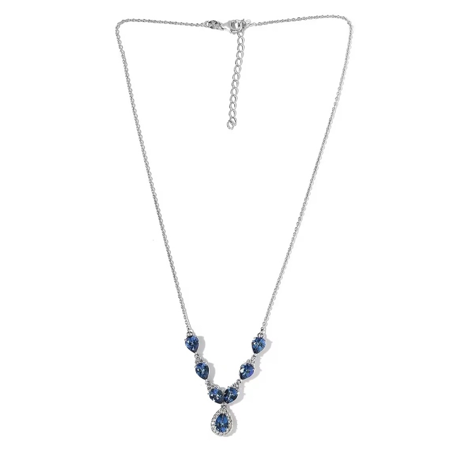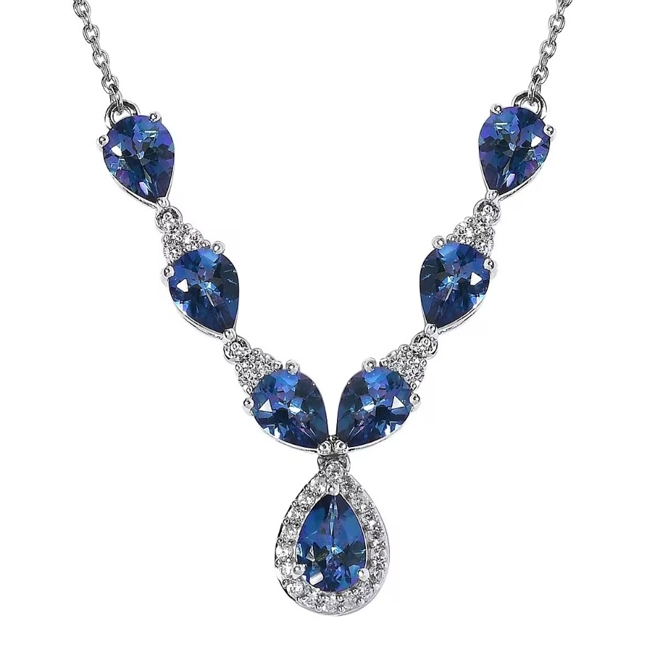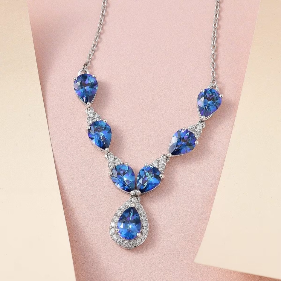 A sleek collar of six faceted pear-cut Mystic Blue Petalites steps toward the center, each linked by petite white zircon spacers for a continuous line of brightness, while a slightly larger pear drop is framed in a zircon halo to finish the piece. Set in rhodium-finished sterling silver, the arrangement sits flush along the neckline with balanced symmetry and refined sparkle—modern, luminous, and ready for evening or elevated day wear.
