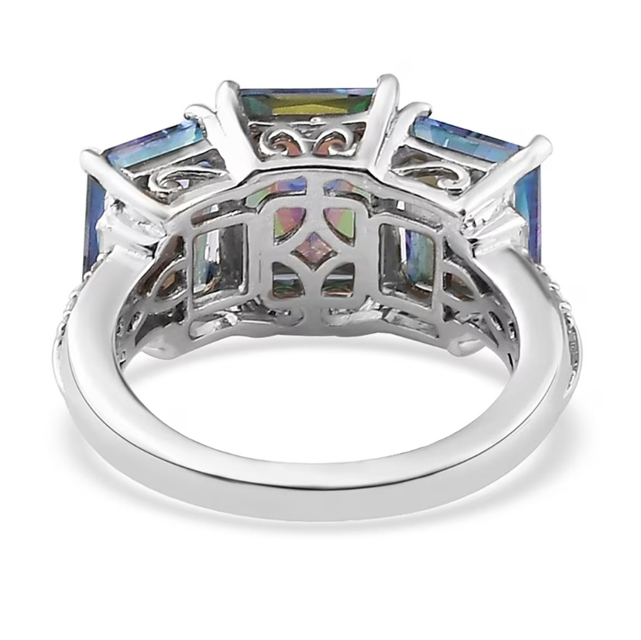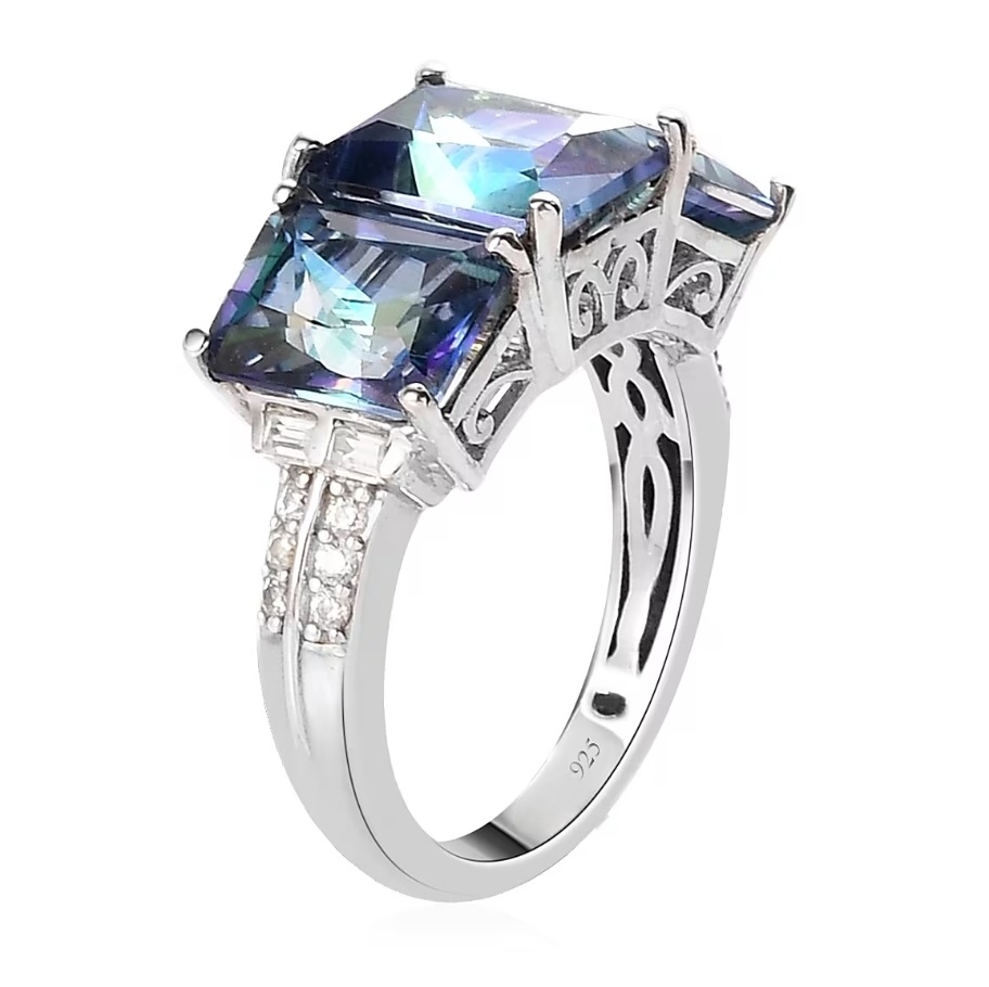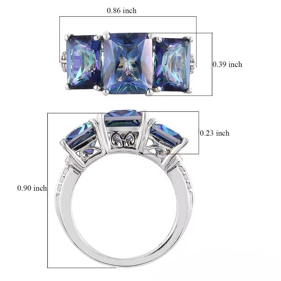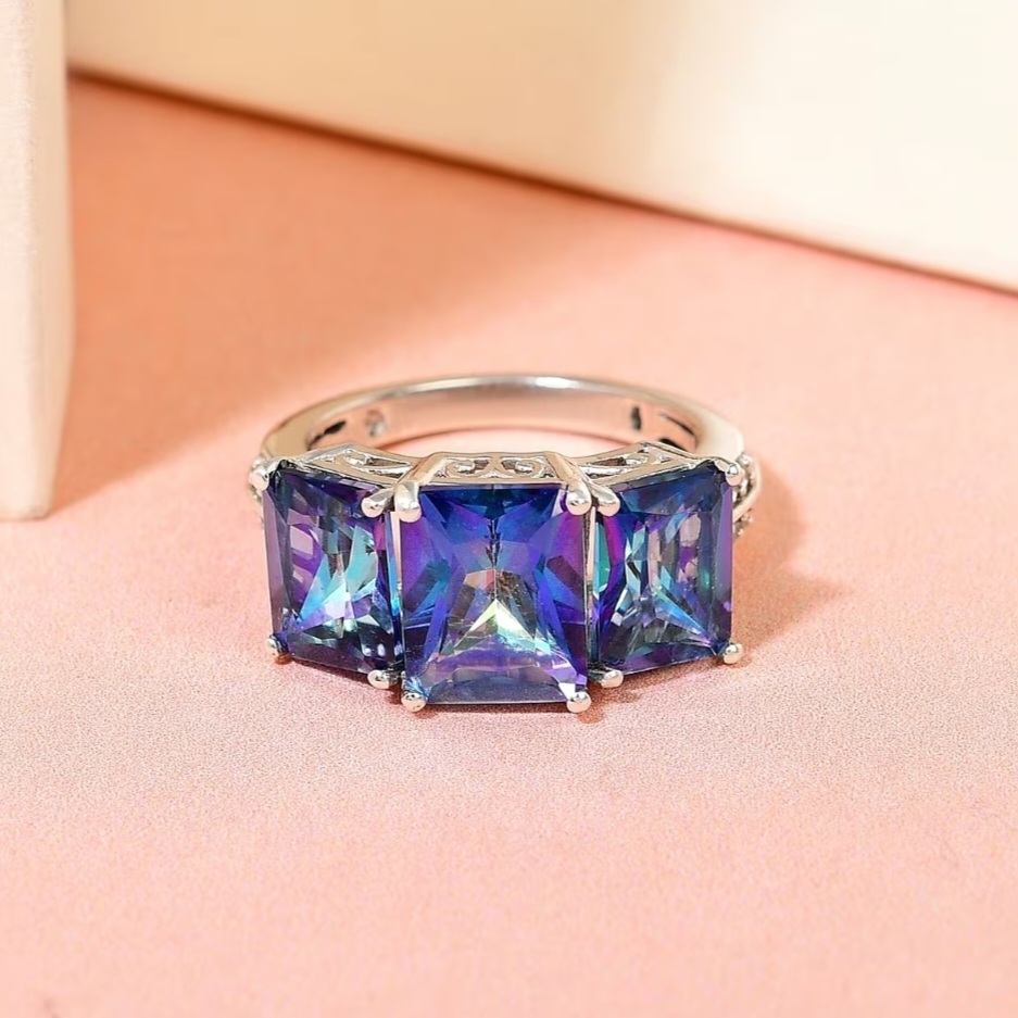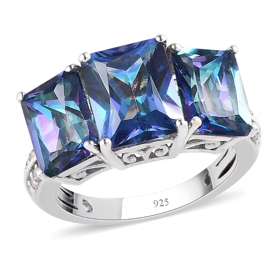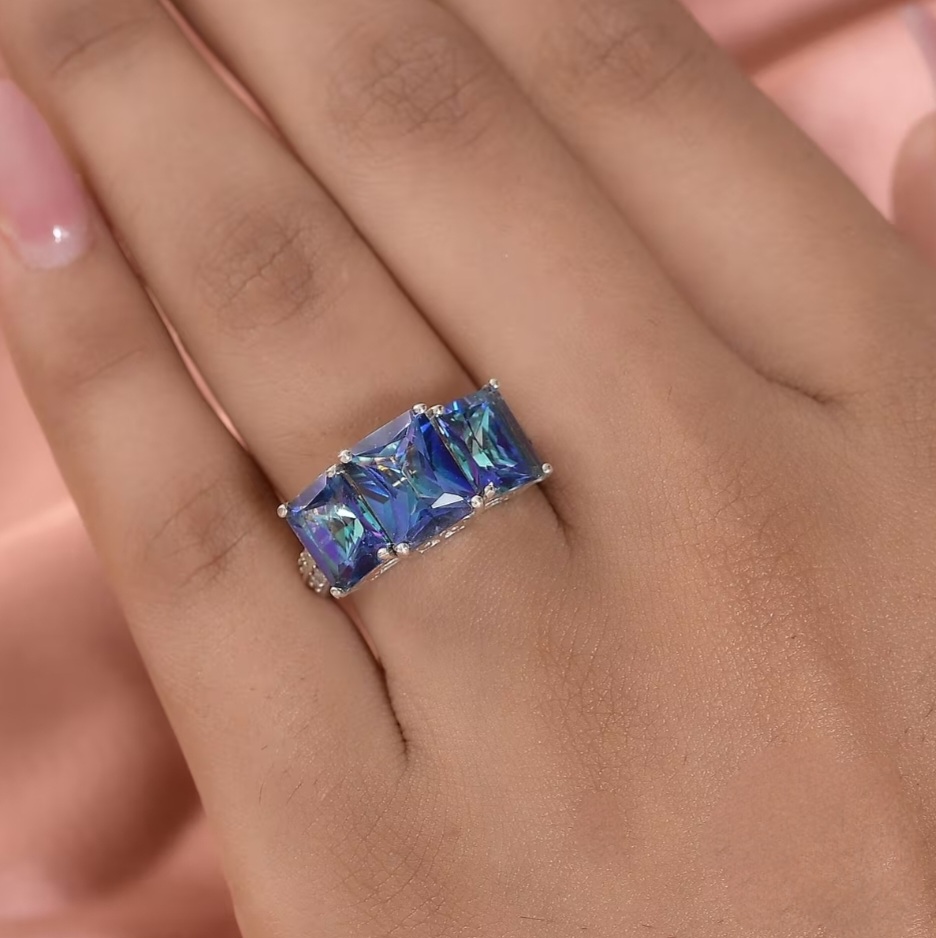 Three radiant-cut Mystic Blue Petalites command attention in a sleek trilogy design, each gemstone flashing vivid blue brilliance across its precisely faceted surface. The stones sit in perfect balance—centered, proportionate, and securely four-prong set—while white zircon accents trace the shoulders in clean geometric lines. The solid sterling silver mounting gleams with high-polished rhodium plating, creating a crisp contrast that enhances the Petalite’s color play. Refined, dimensional, and built for those who appreciate precision, this ring embodies effortless modern luxury.