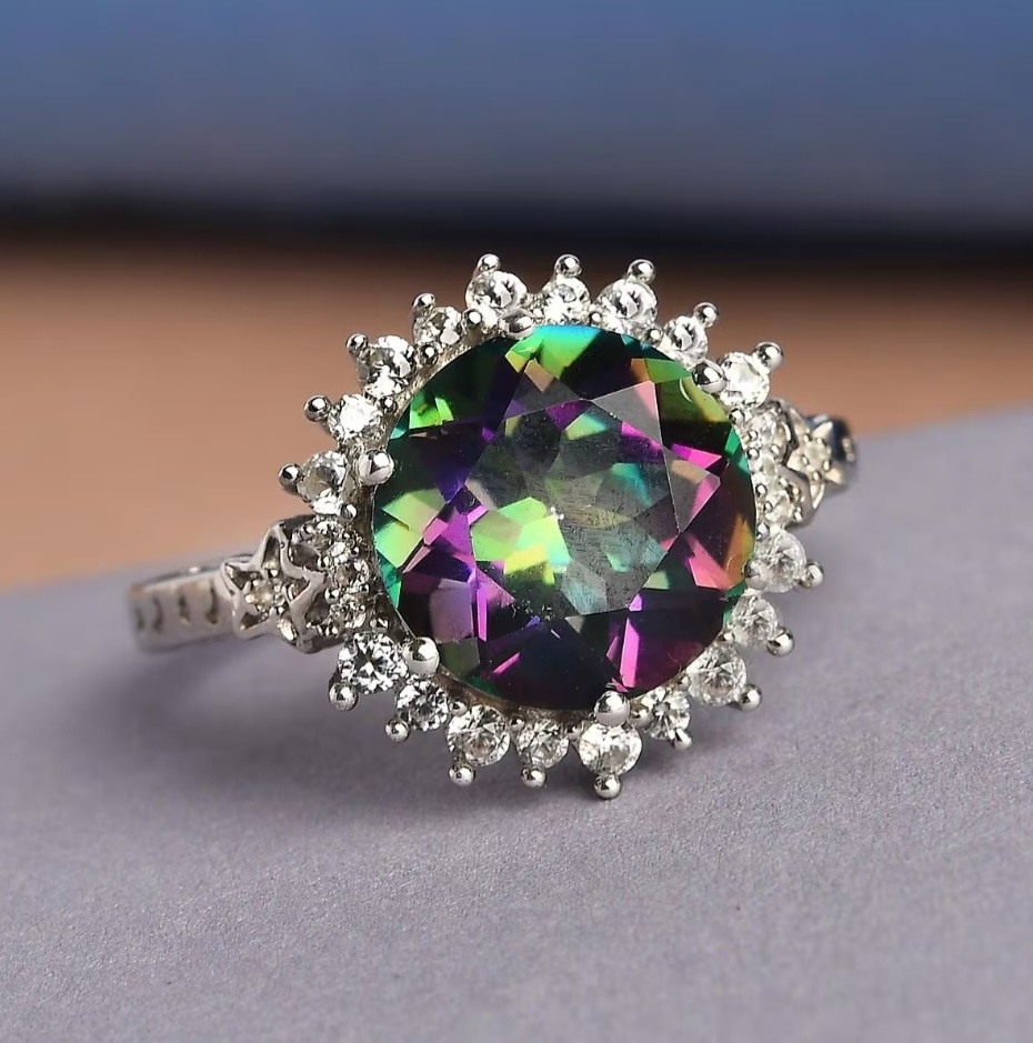 This ring centers on an 11mm round Mystic Topaz weighing 5.92 carats. The CVD surface treatment creates a shifting spectrum of green, violet, blue, and magenta, giving the stone a dynamic, otherworldly glow.