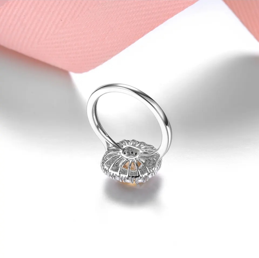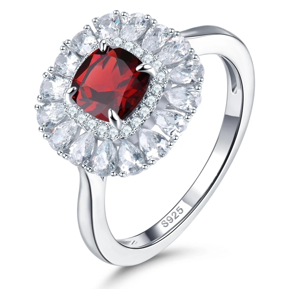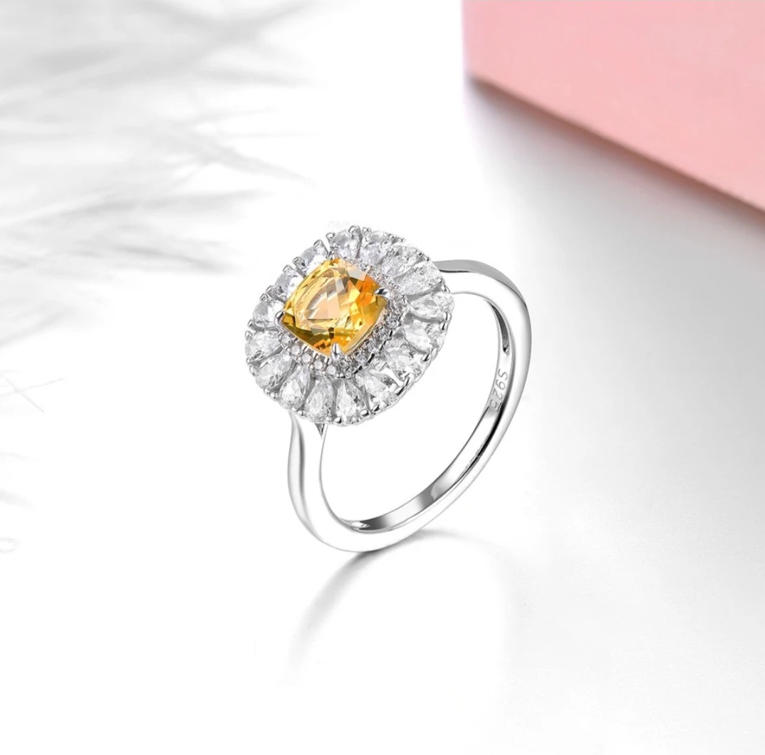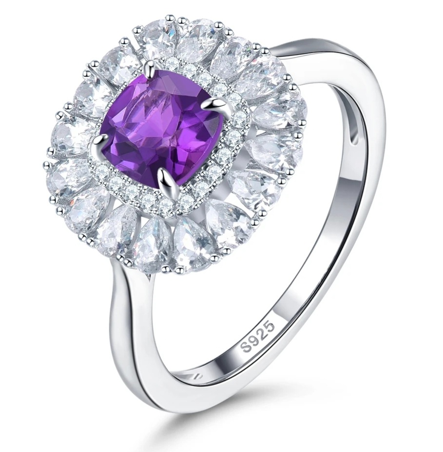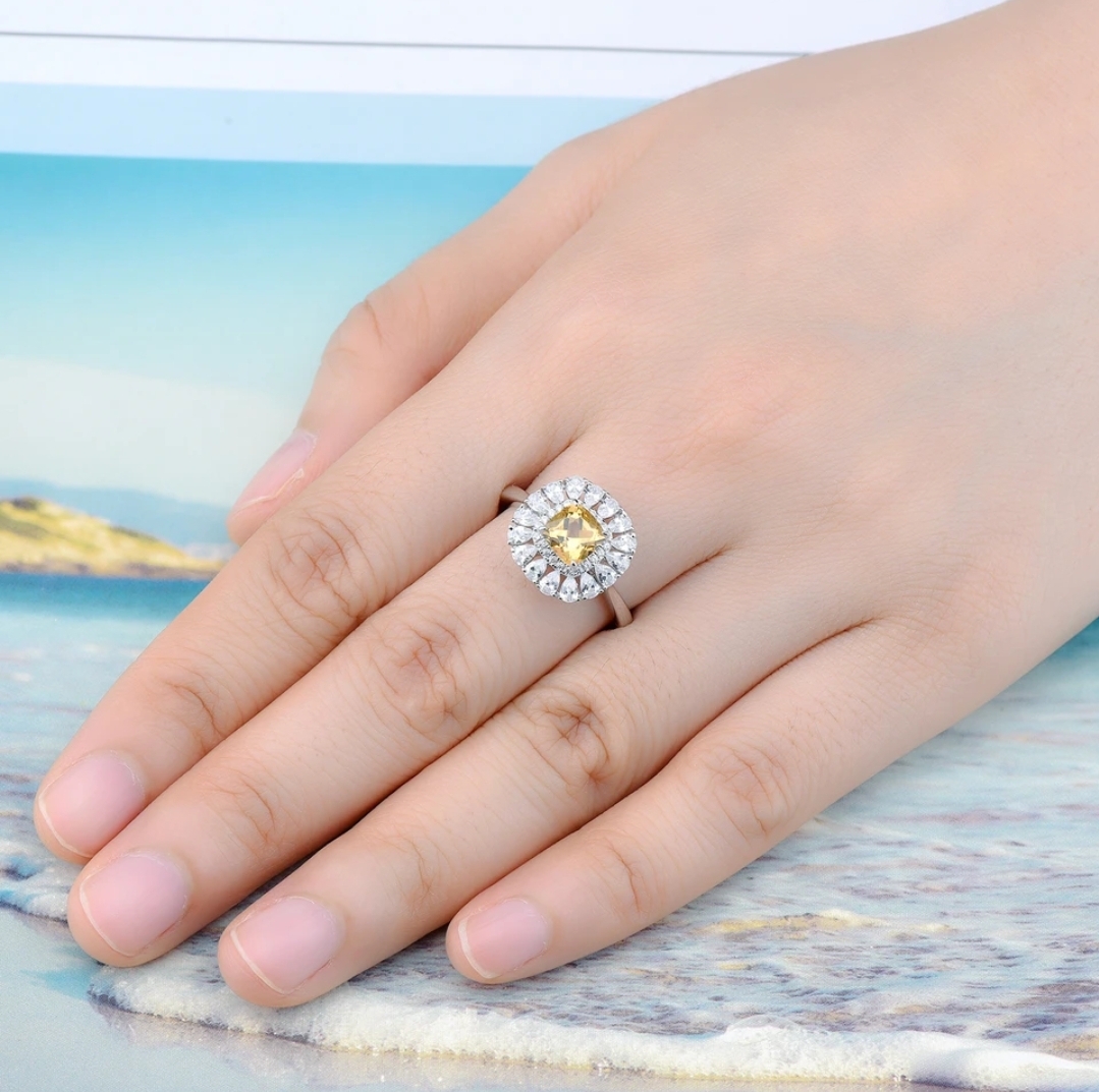 We wanted to design a ring that we know she will love. Offered in your choice of natural Citrine, Aquamarine, Garnet, Peridot or Amethyst. Each center stone is a 6mm square cushion and surrounding it you have a double halo of natural White Zircon rounds and pears. Crafted in solid 925 Sterling Silver with your choice in Rhodium Plating, 18K Yellow Gold Over or 18K Rose Gold Over.