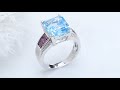 Hosted at the center of this ring you have a natural 12x10mm emerald cut Sky Blue Topaz. Bezel set along the shoulders you have natural Rhodolite Garnet 4x2mm baguettes 8.65ctw. Crafted in solid 925 Sterling Silver with your choice in Rhodium Plating, 18K Yellow Gold Over, or 18K Rose Gold Over 6.9g