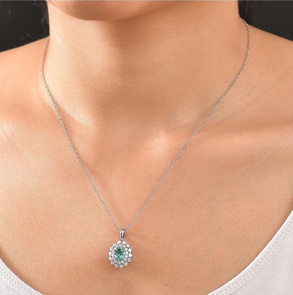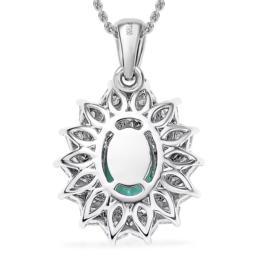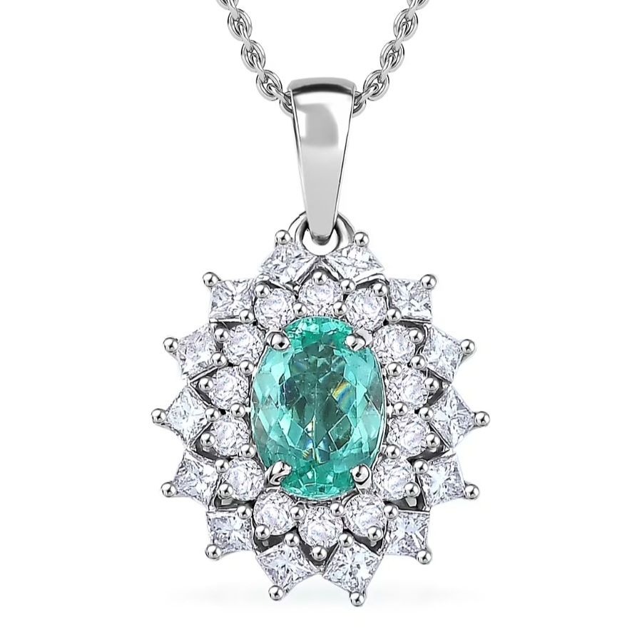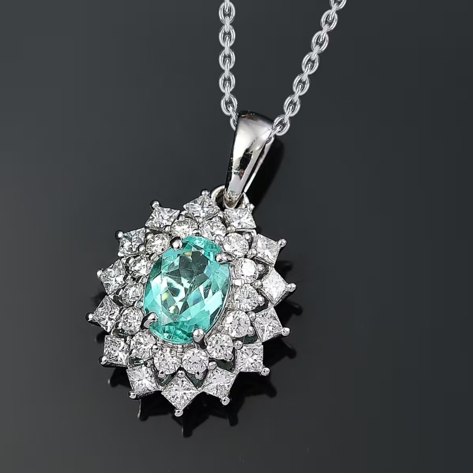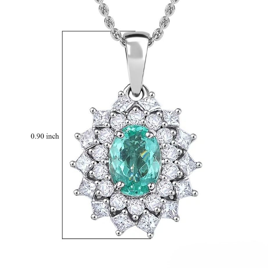 A radiant oval Paraiba tourmaline glows at the heart of this platinum pendant, encircled by two precision-cut halos of fine VS diamonds. The vivid blue-green fire of the Paraiba contrasts perfectly with the icy brilliance of platinum and diamond, creating a centerpiece that commands light from every angle. Crafted in solid 950 platinum and finished with rhodium for mirror-like luster, this design captures rare beauty and enduring strength in one flawless composition. Available with your choice of chain length.