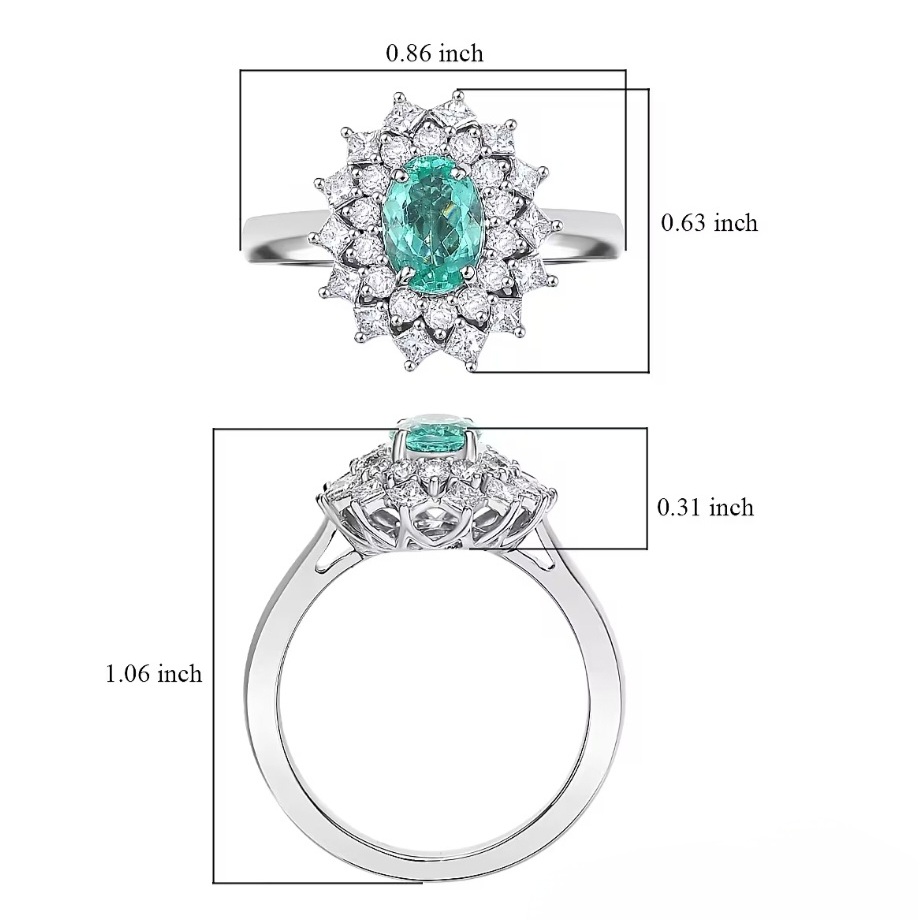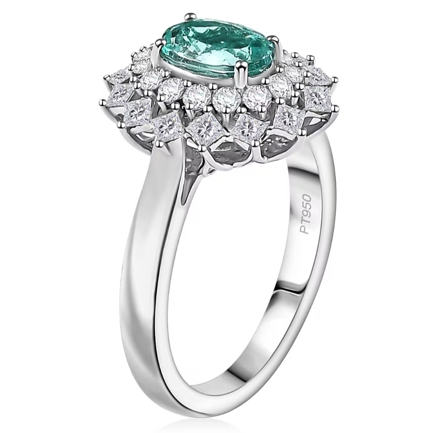 A masterpiece of light and precision. This platinum ring centers a vibrant oval Paraiba tourmaline surrounded by two shimmering halos of fine VS diamonds. Each facet ignites with electric blue-green brilliance—the signature glow that defines true Paraiba. The design blends bold presence with perfect proportion, crafted in solid 950 platinum and finished in rhodium for enduring shine. A timeless symbol of rarity and refinement, built for collectors who know the difference.