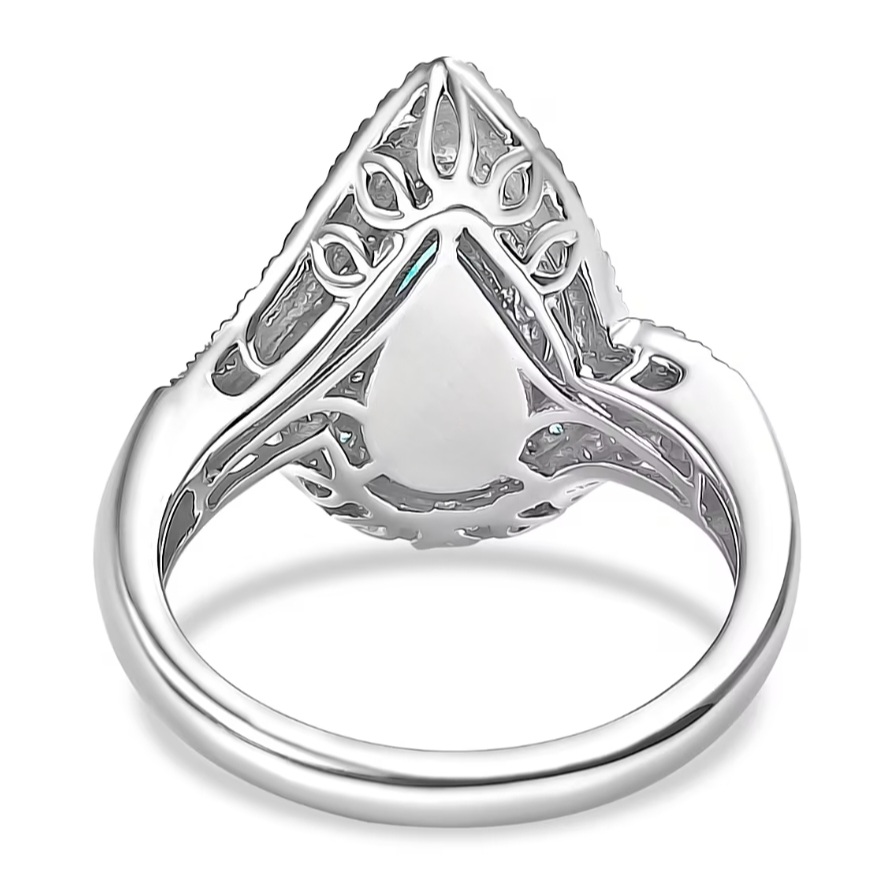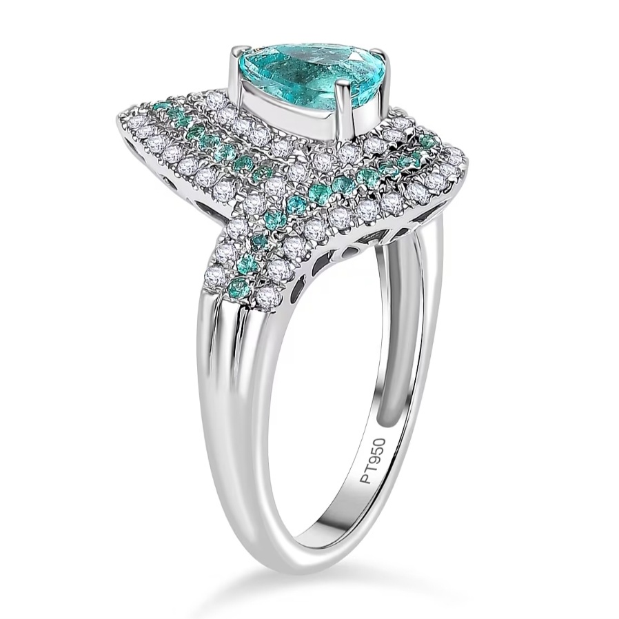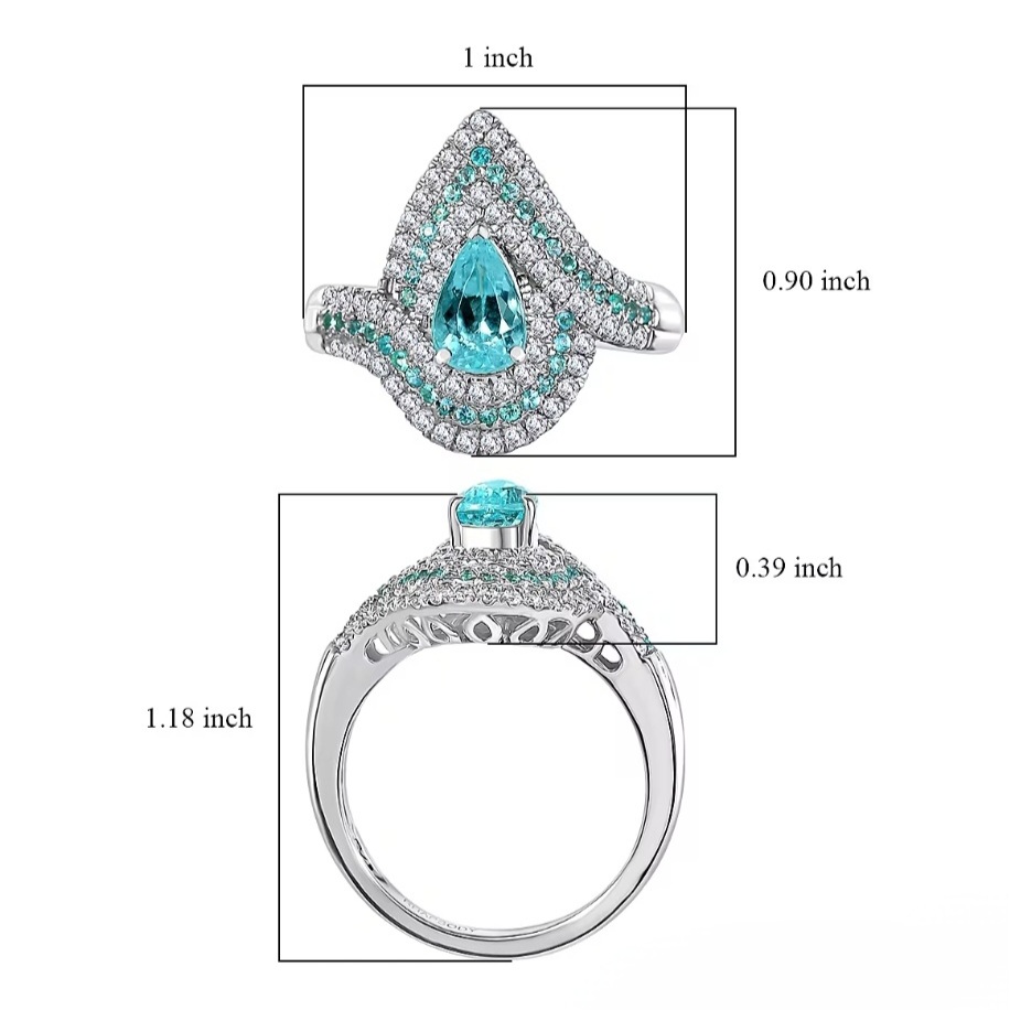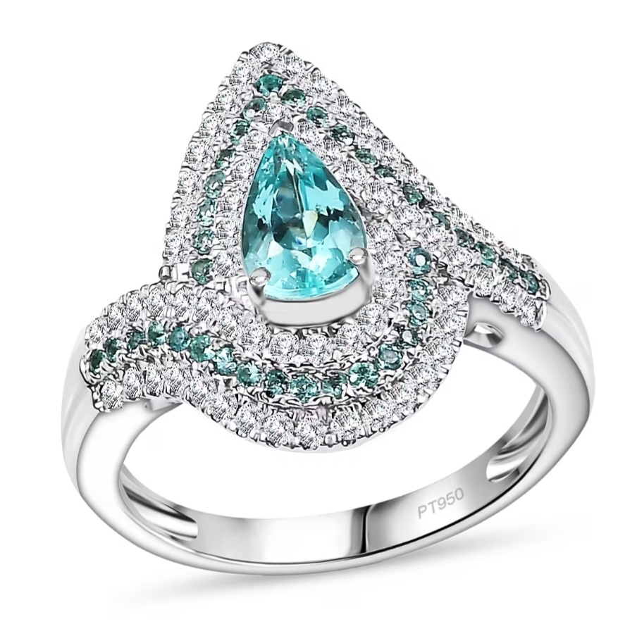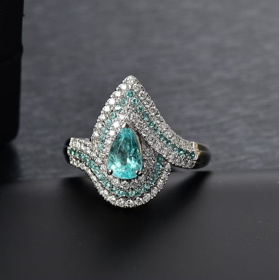 An electric expression of rare beauty. This bypass halo ring features a vivid pear-shaped Paraiba tourmaline, radiating neon blue-green fire wrapped in twin halos of diamonds and matching Paraiba accents. Crafted in solid 950 platinum and finished in rhodium, its fluid bypass design symbolizes motion and energy—capturing the essence of a gemstone born from volcanic perfection. Sophisticated, sculptural, and alive with color, this ring defines modern luxury without compromise.