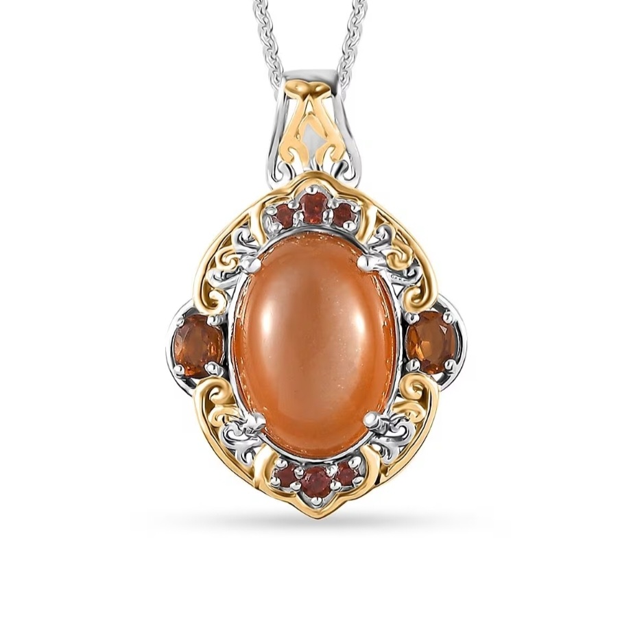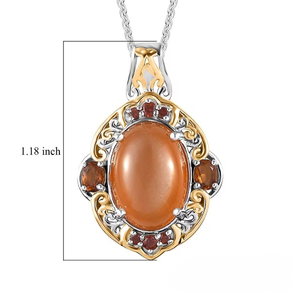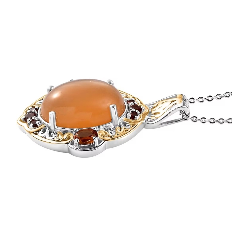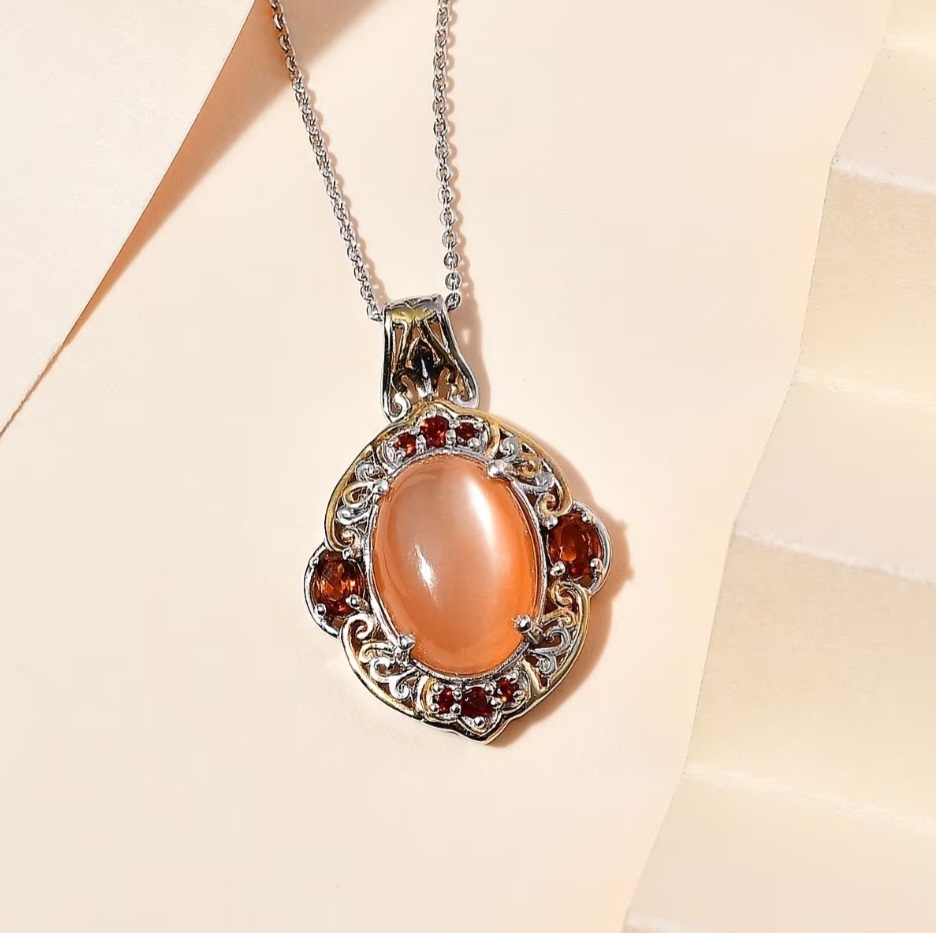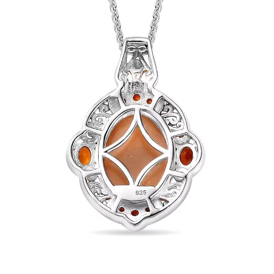 At the center is a glowing peach moonstone cabochon, polished to a smooth finish that highlights its soft inner shimmer and warm orange-peach tone. The oval shape gives the pendant a bold presence, while the cabochon cut keeps the look classic and luxurious.