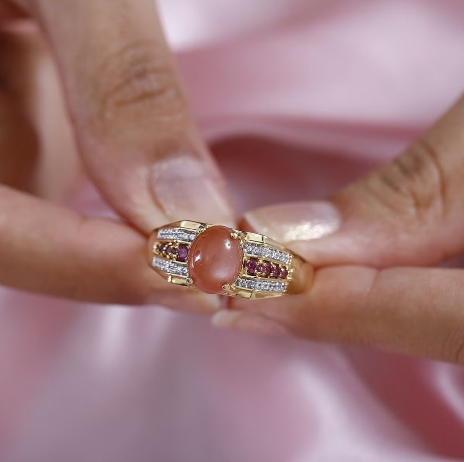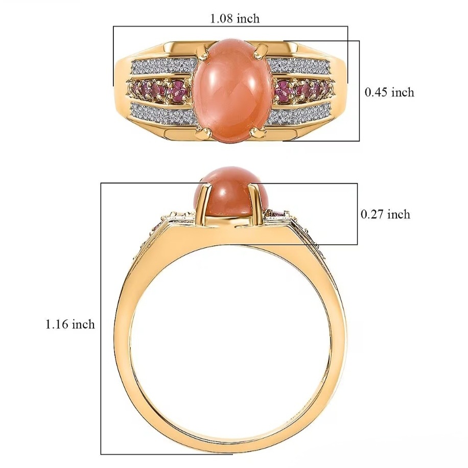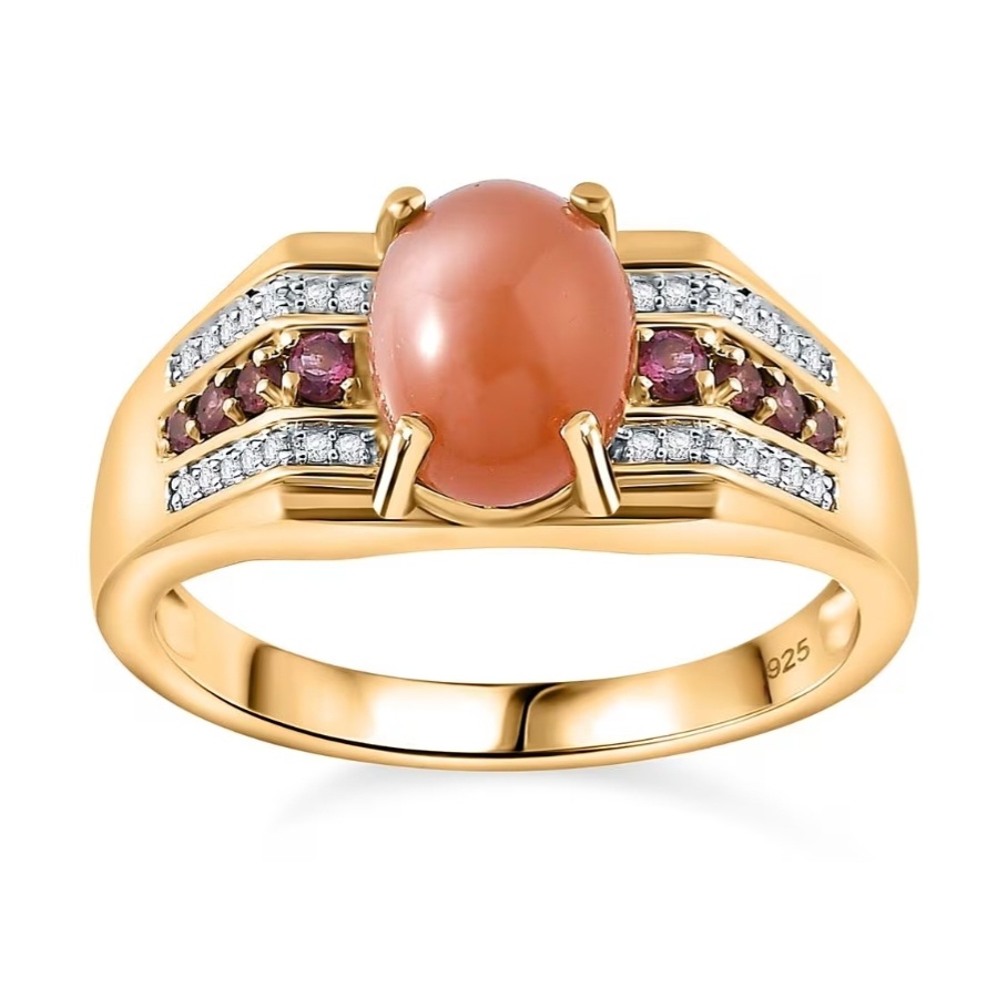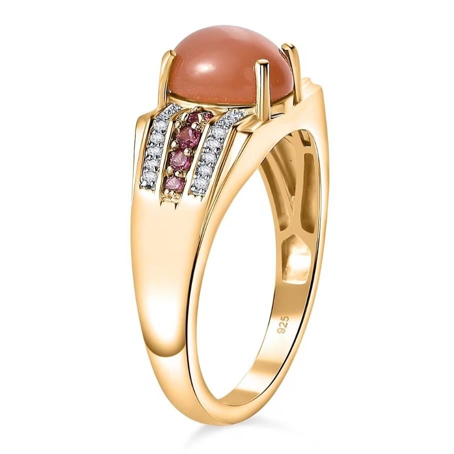 At the center is a polished peach moonstone cabochon, chosen for its warm orange-peach tone and its soft natural glow. The smooth cabochon cut gives the stone a sleek, classic look with a luminous presence that feels refined rather than overly flashy.