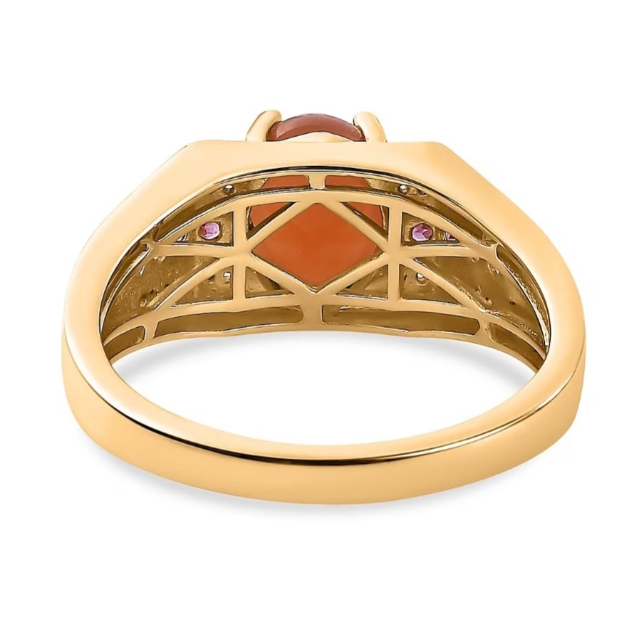 Along the shoulders, rhodolite garnet accents bring deep red-purple contrast, while fine white zircon detailing adds crisp brightness and sharp definition across the top of the ring. The design is symmetrical and structured, giving it a confident, substantial look on the hand without feeling bulky.