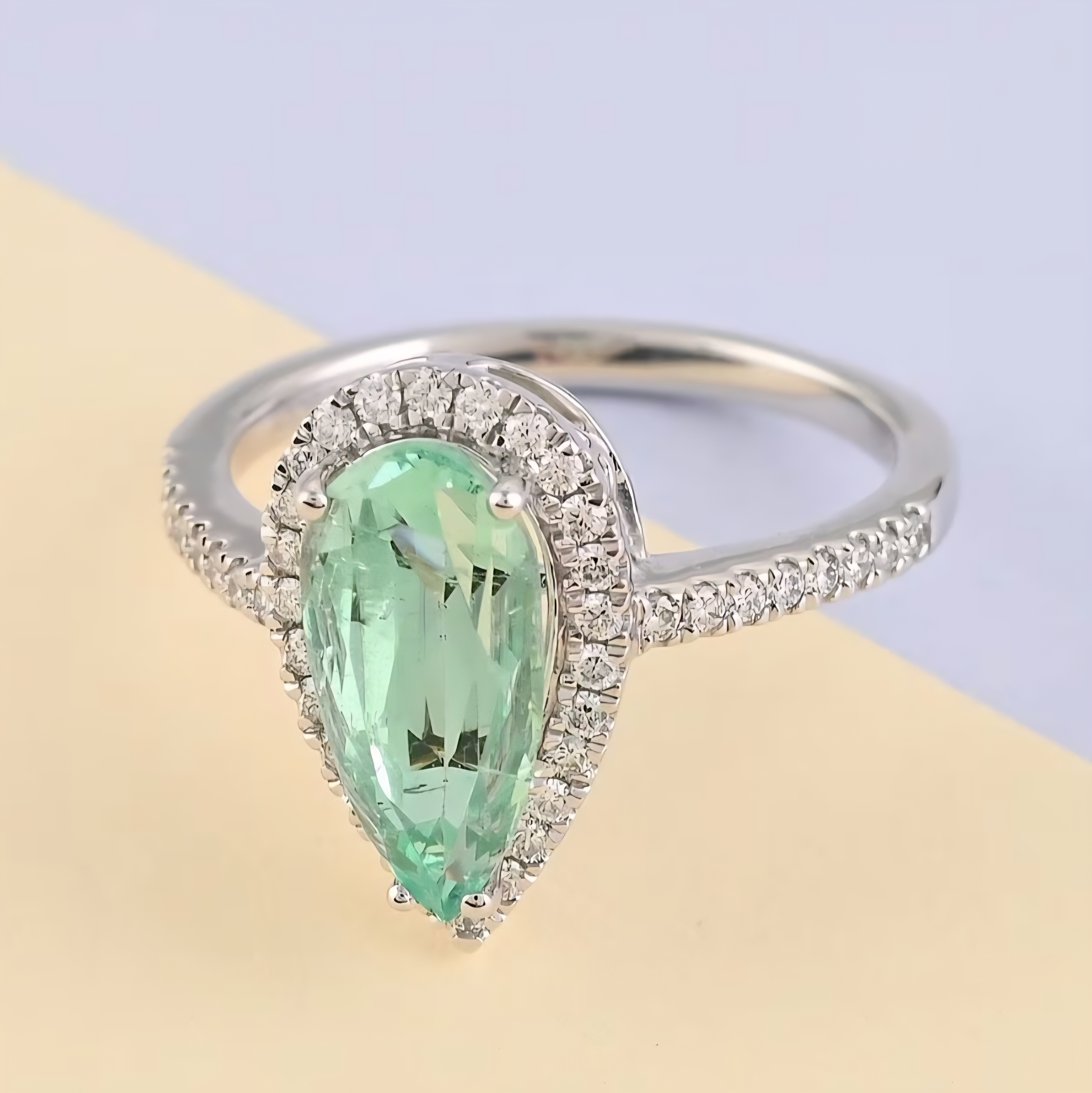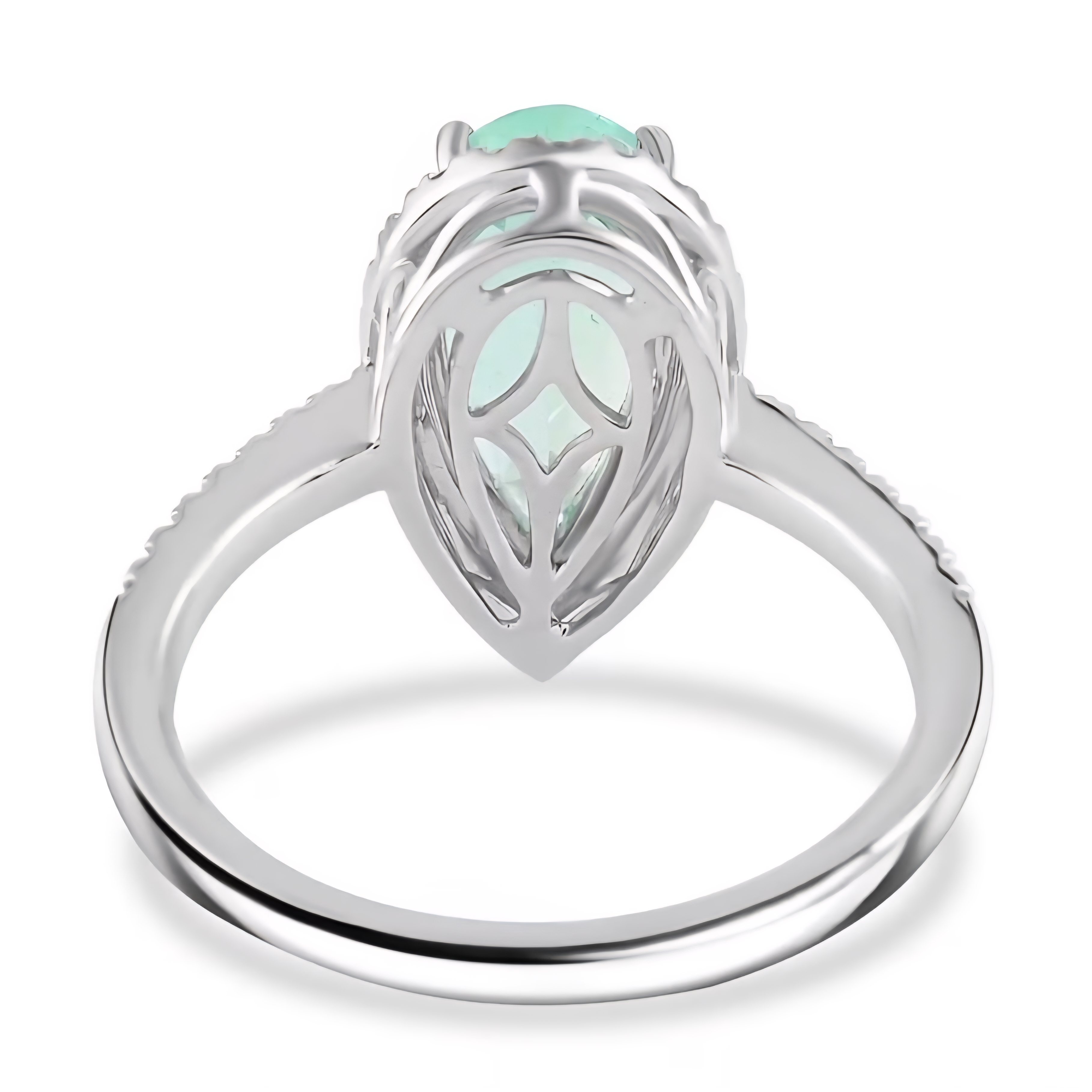 A striking 2.26 carat pear-shaped Colombian emerald commands this refined platinum setting. Measuring an impressive 16x6mm, the elongated silhouette enhances the stone’s vivid green saturation and elegant proportions.