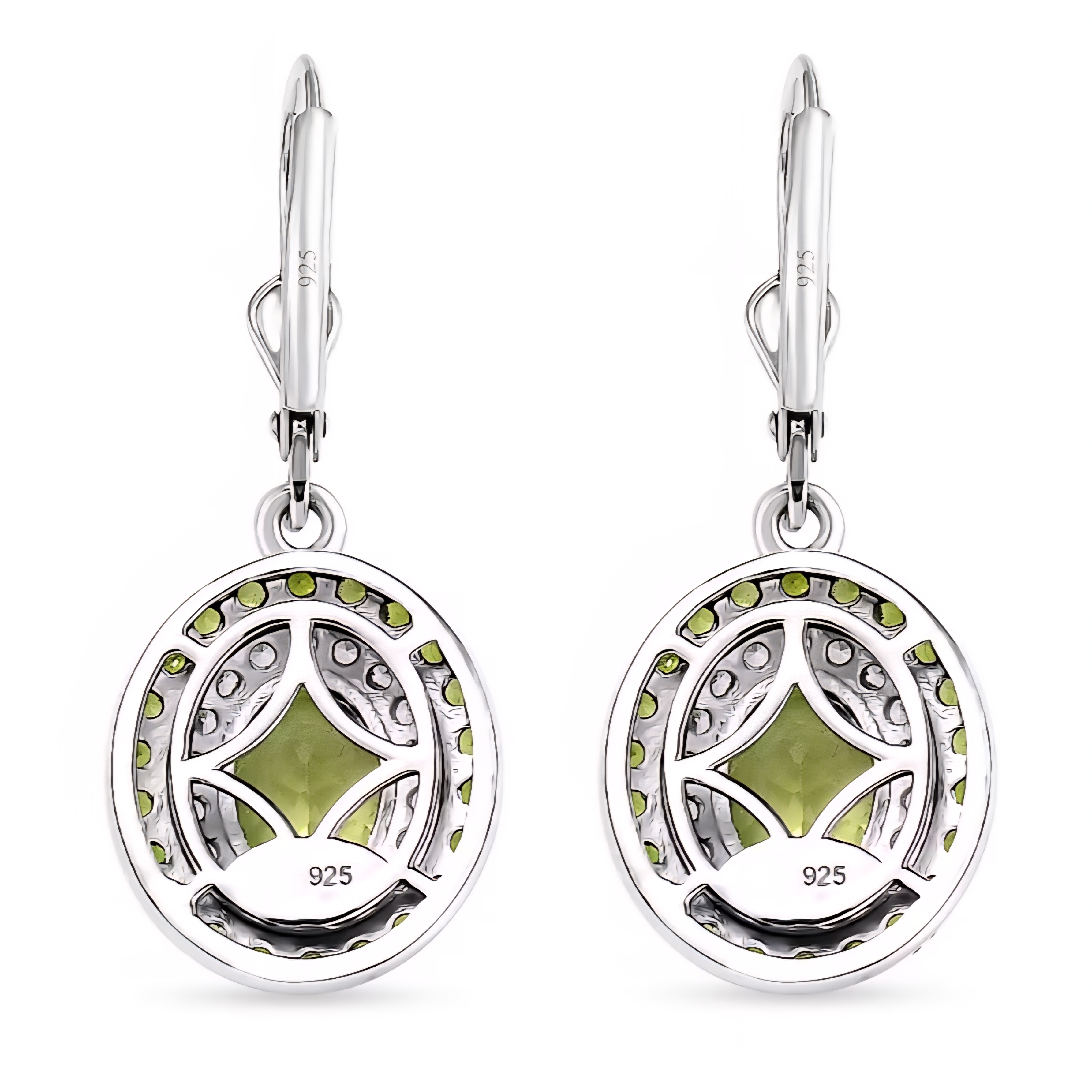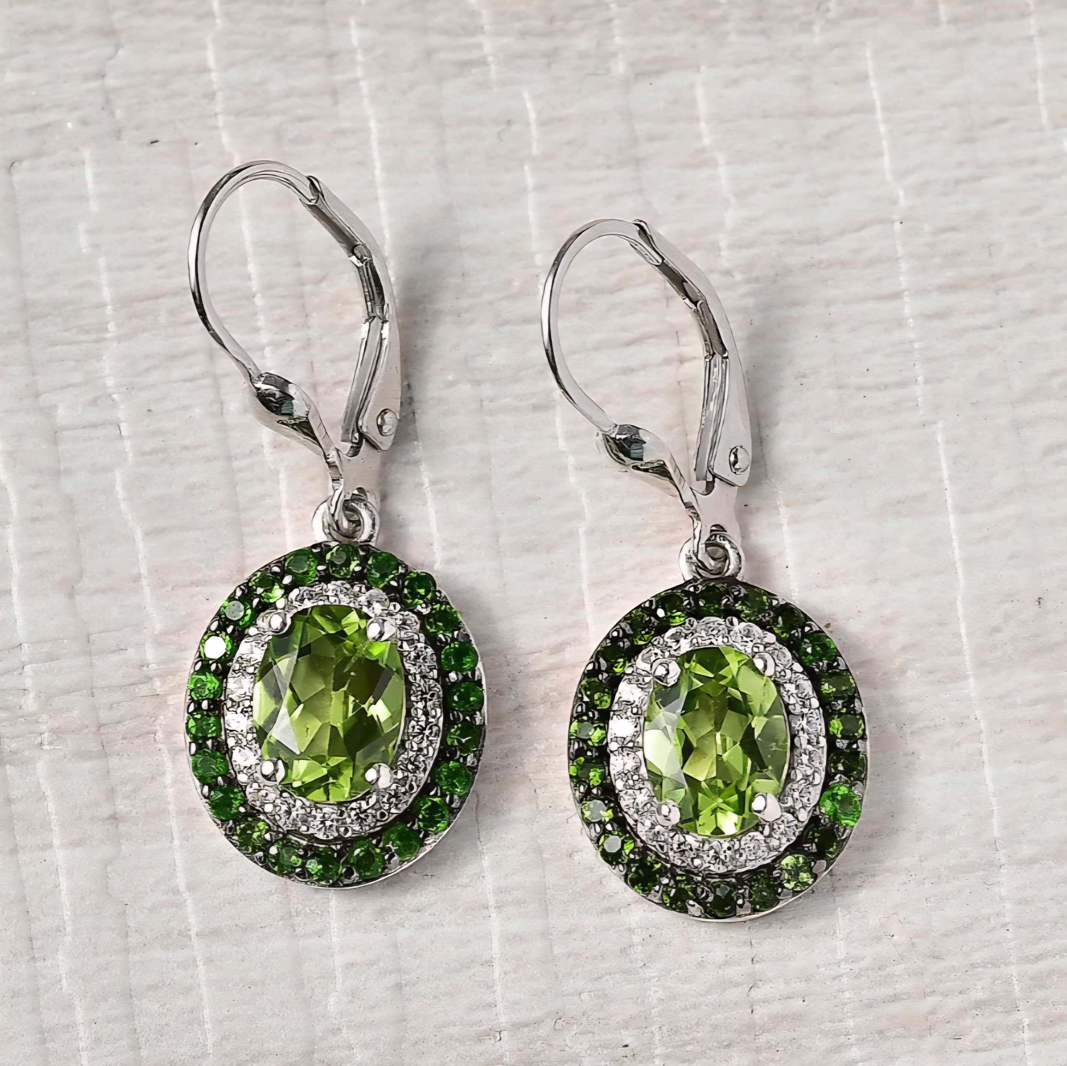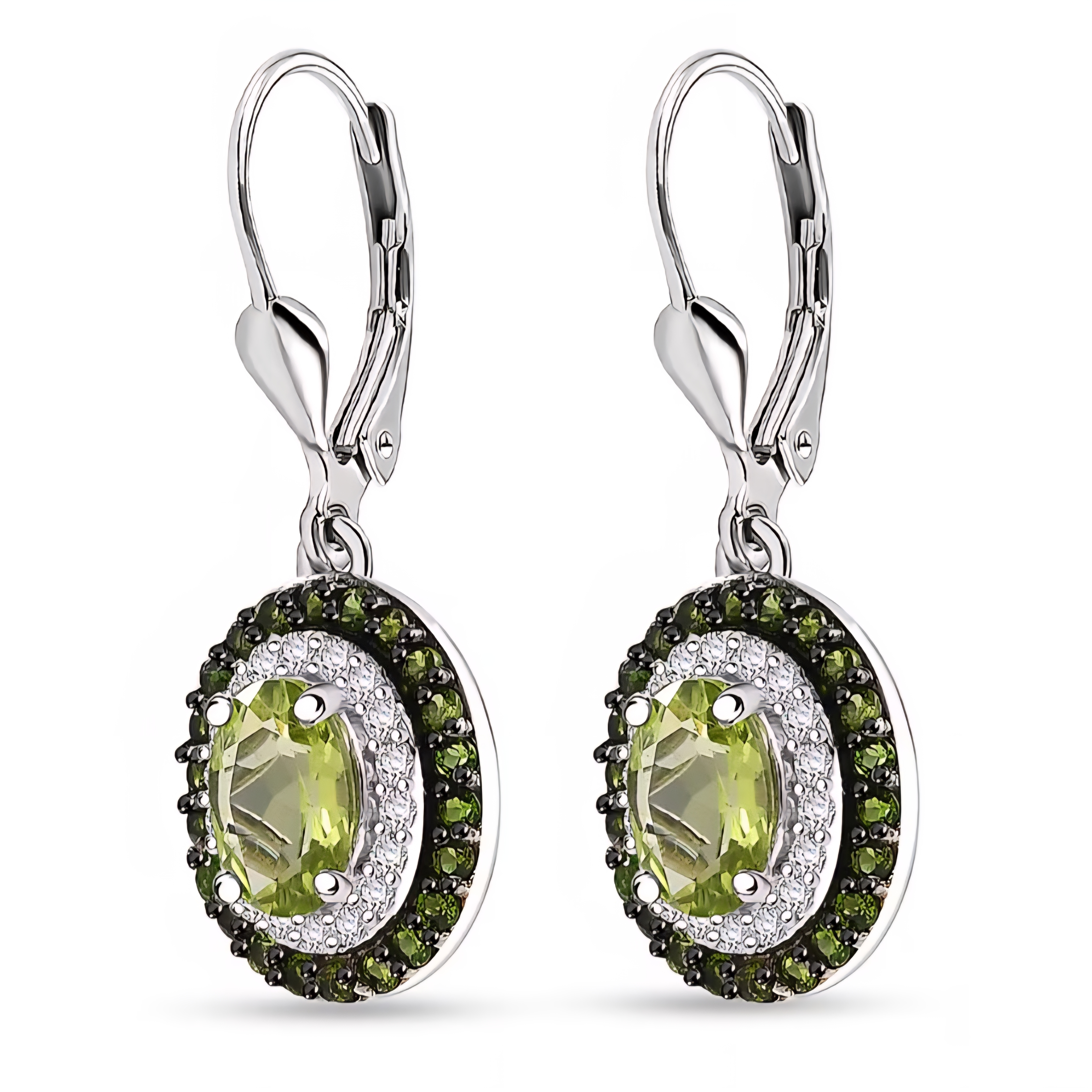 Fresh green fire that moves with you. Each earring showcases an 8×6mm oval peridot (2.98ctw total) glowing with crisp, golden-green light. Surrounding each stone, white zircon halos (0.43ctw) deliver clean sparkle, while chrome diopside accents (0.79ctw) intensify the richness of color and frame the design with depth. Crafted in solid 925 sterling silver with black and white rhodium, these 4.20ctw leverbacks bring brilliance, contrast, and comfort — the perfect finish to the peridot and chrome diopside suite.
