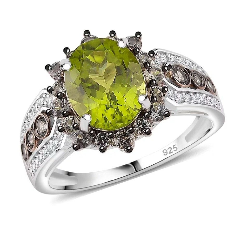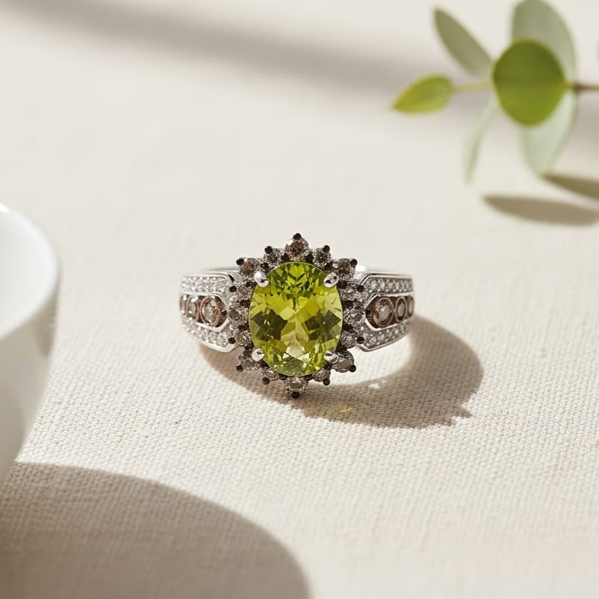 This peridot ring is centered on a bright oval stone with strong, saturated green color, creating a bold and lively focal point. The peridot sits prominently at the center, giving the design immediate presence and clarity.