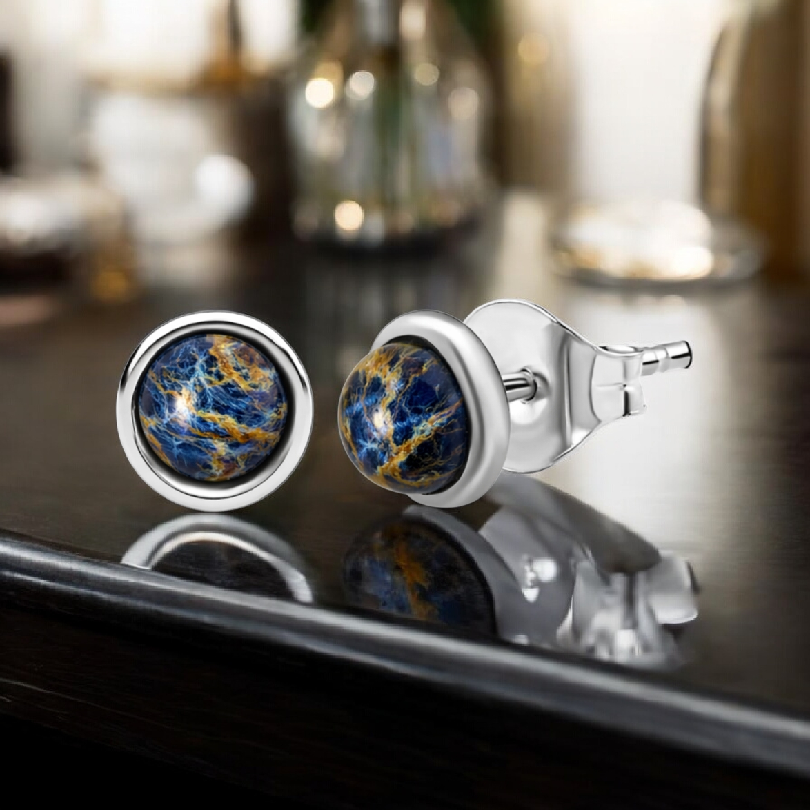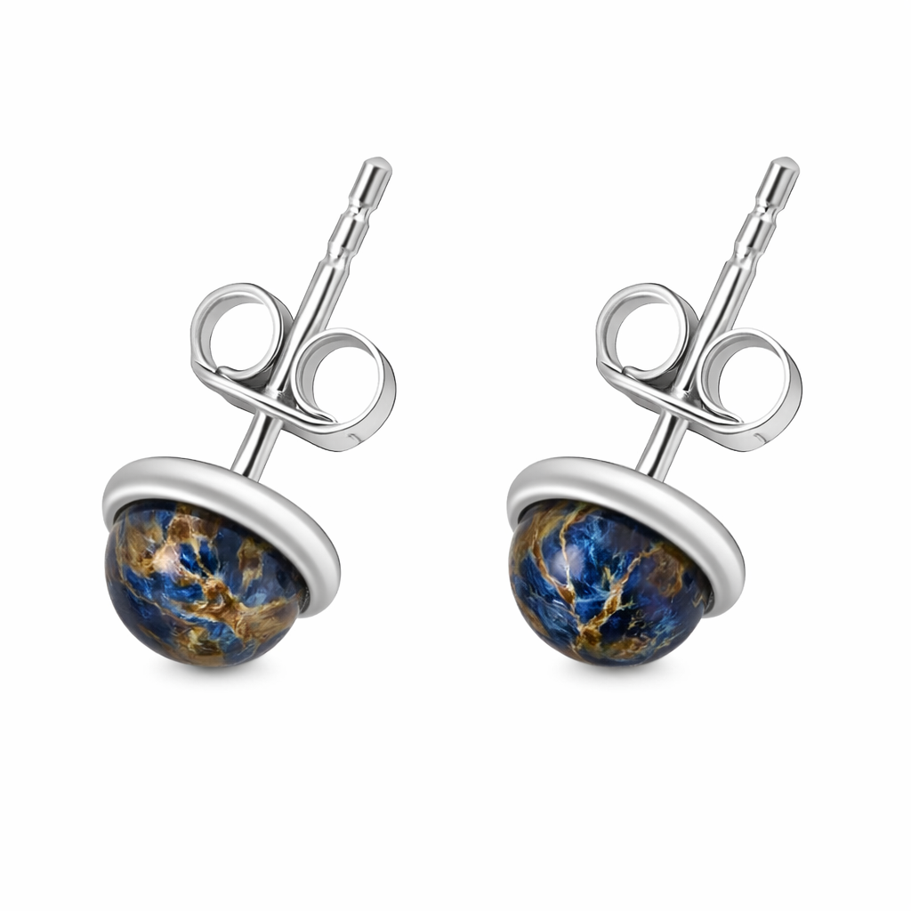 Each earring features a round pietersite cabochon, polished to reveal the gemstone’s natural storm-like patterning. Deep blues are layered with flashes of gold and smoky movement, creating a surface that shifts subtly as light changes. No two stones are alike, giving the pair a sense of organic individuality rather than uniform shine.