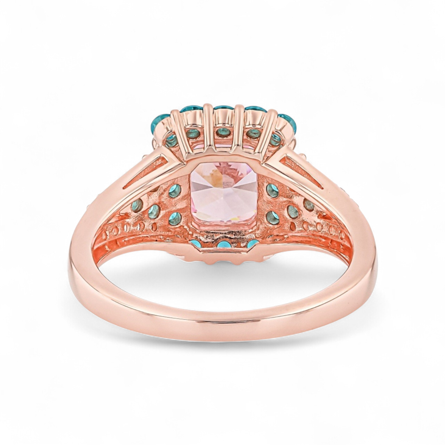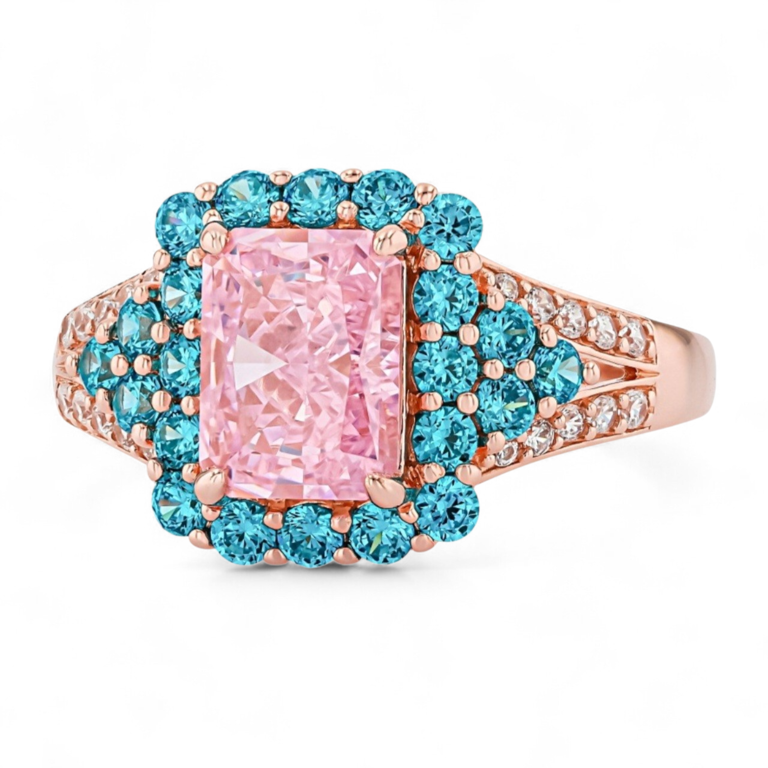 This bold halo ring features a pink emerald cut cubic zirconia at the center, surrounded by a vivid blue halo that creates high contrast and intense sparkle. White cubic zirconia accents along the shoulders add an extra layer of brilliance, giving the design a polished, multi color look with strong presence. Crafted in solid 925 sterling silver and finished in 18K rose gold plating, this ring combines warm metal tone with bright gemstone color for a striking statement style.