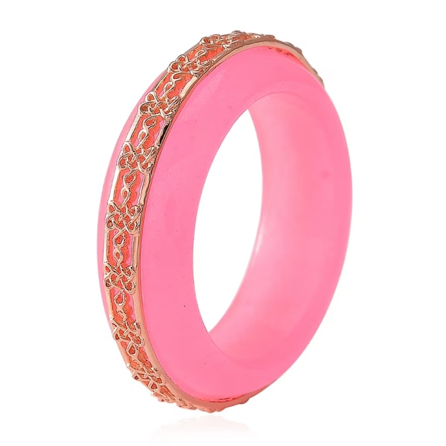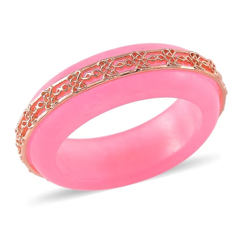 A full, sculpted band of lovely pink jadeite carved into a smooth free form ring, wrapped in 18k vermeil rose gold over sterling silver detailing. The rich gold scrollwork sits like a crown along the top edge, adding structure and contrast without taking away from the stone itself.