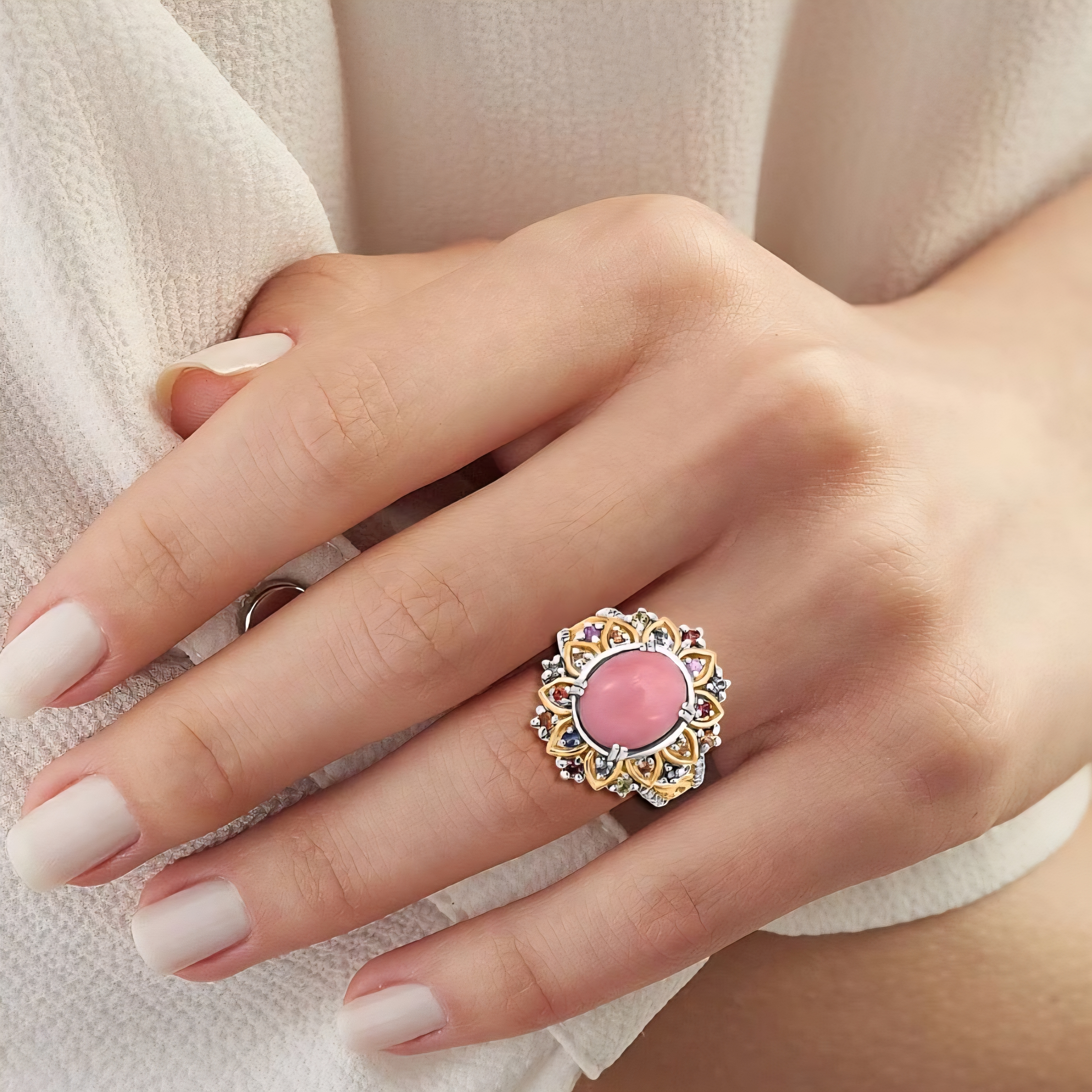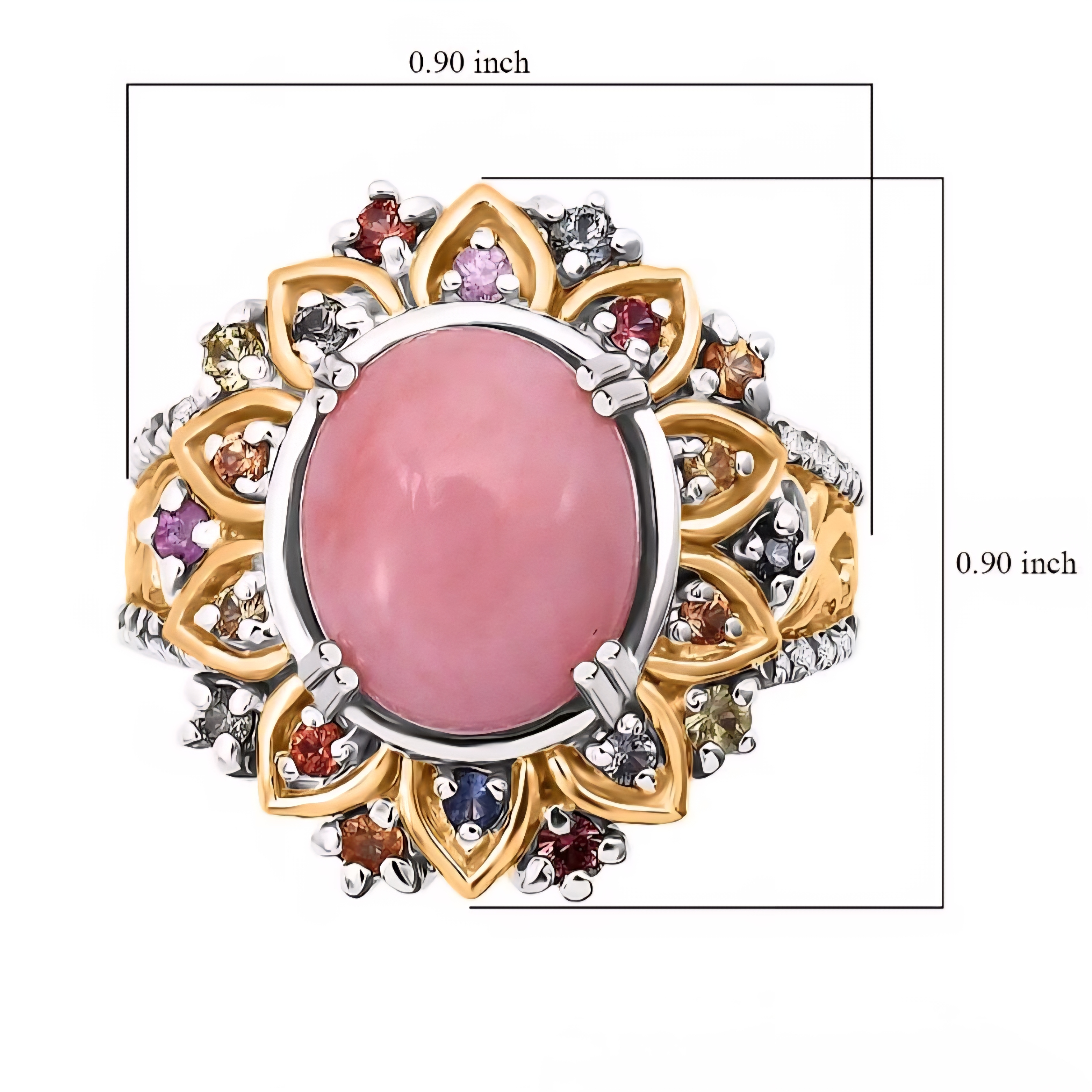 This statement ring centers a soft, luminous pink opal cabochon with a smooth oval profile and natural pastel glow. A floral-inspired halo of multicolor sapphires wraps the center stone in saturated bursts of pink, orange, yellow, and blue, while fine white zircon accents add crisp contrast and sparkle. Finished in a striking mix of 18K yellow gold and rhodium over solid sterling silver, this piece blends organic softness with bold, architectural detail.