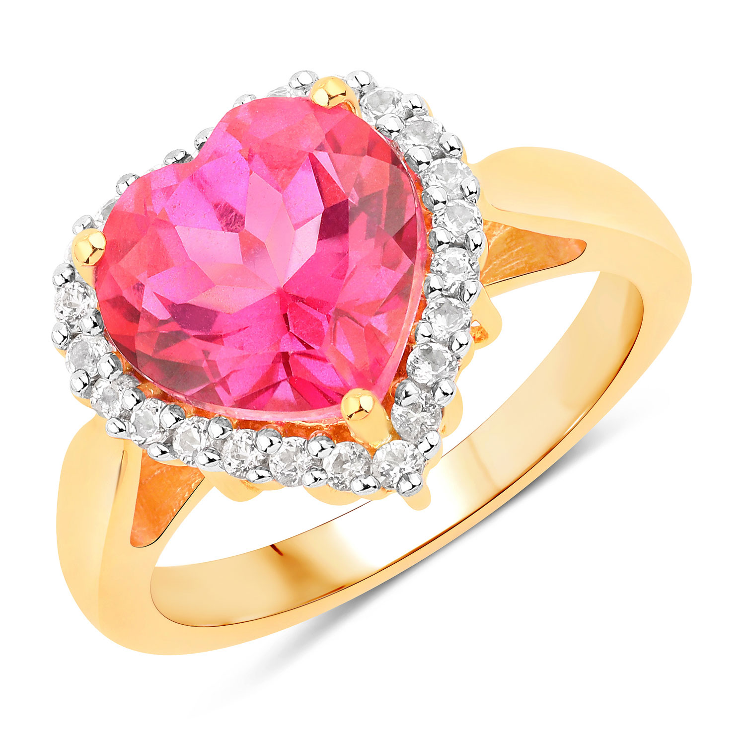 A halo of white topaz surrounds the center, adding brightness and enhancing the overall sparkle. Set in 18K yellow gold vermeil over sterling silver, the warm tone of the metal complements the vivid pink gemstone while providing a smooth, polished finish.