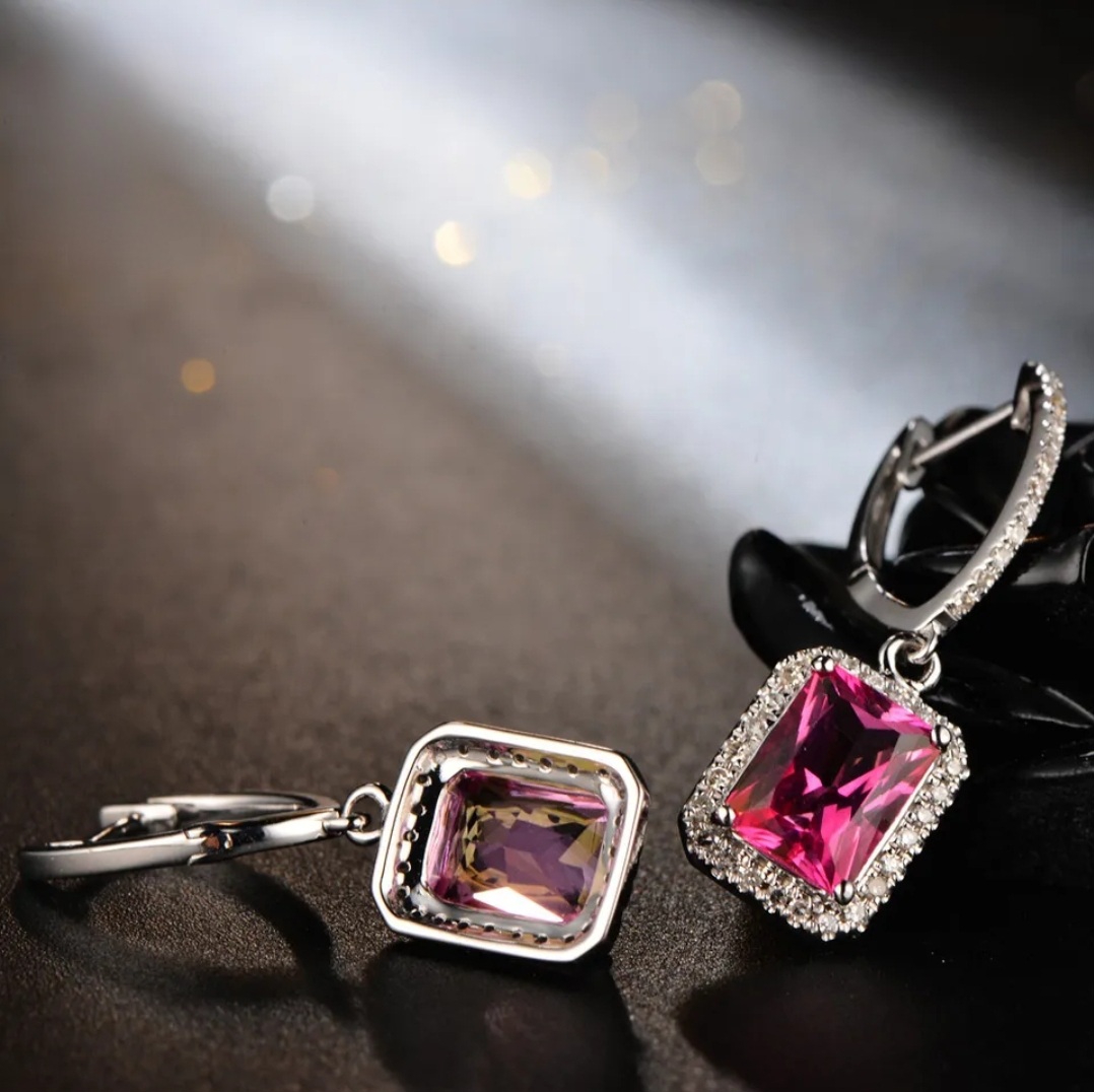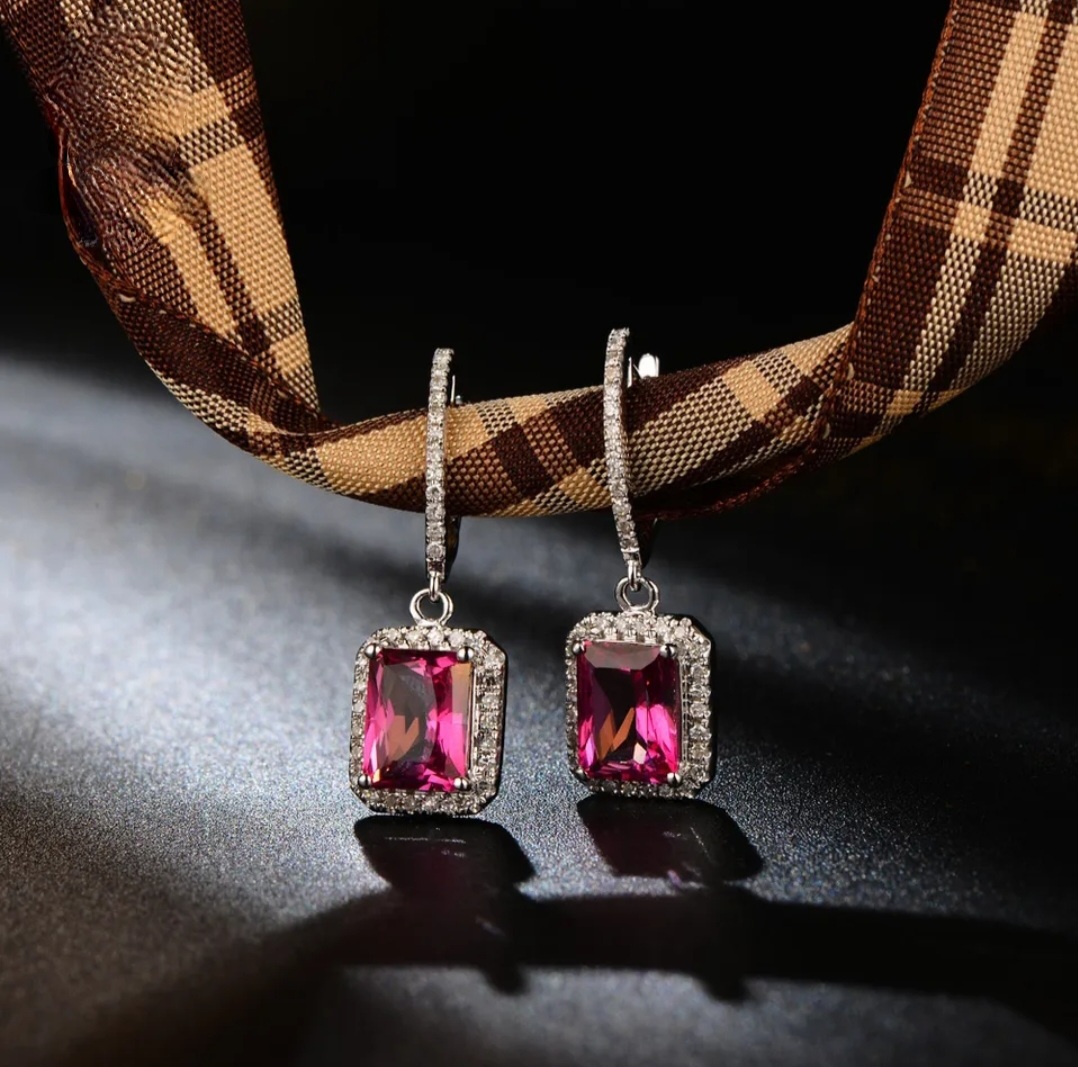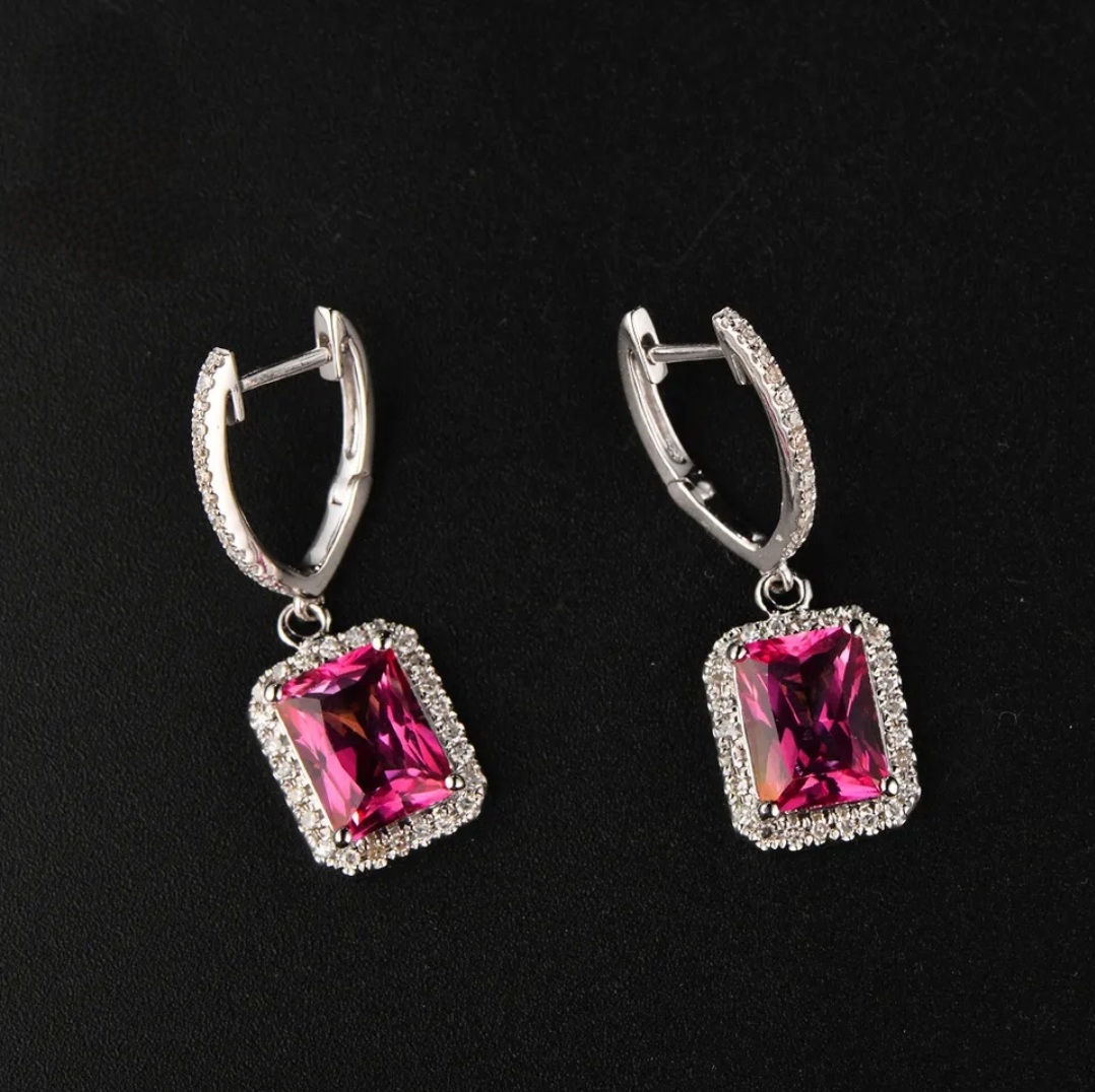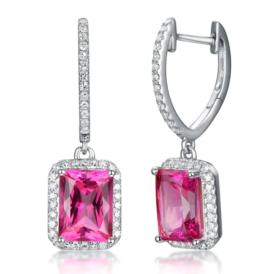 Step into a world of luxury with our 14K White Gold Pink Topaz Emerald Cut & Diamond Halo Dangle Earrings. Each earring hosts a Hot Pink Topaz, expertly cut in the traditional Emerald Radiant style, ensconced within a radiant halo of Diamonds. These earrings tastefully blend classic style with an aura of contemporary glamour. A testament to refined taste and exquisite craftsmanship, these earrings are a must-have addition for every woman seeking a touch of sublime elegance.