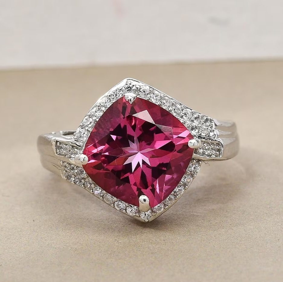 Bold geometry meets radiant color in this Pink Topaz Cushion Halo Ring. The vibrant center stone glows with saturated rose-pink brilliance, cut to reveal depth and symmetry from every angle. Surrounding it, a glimmering frame of white zircon emphasizes each facet, adding an elegant contrast that enhances the ring’s natural luminosity.