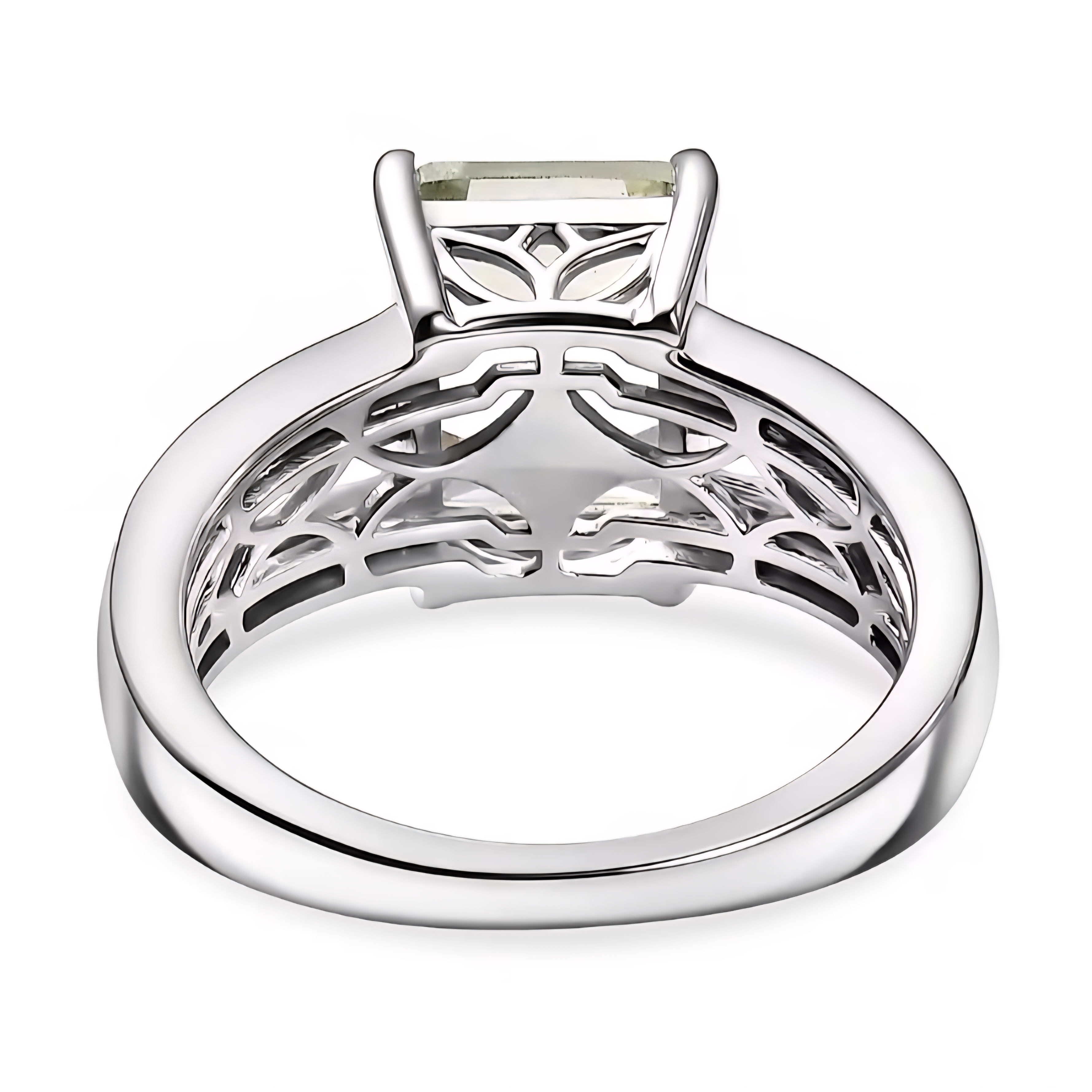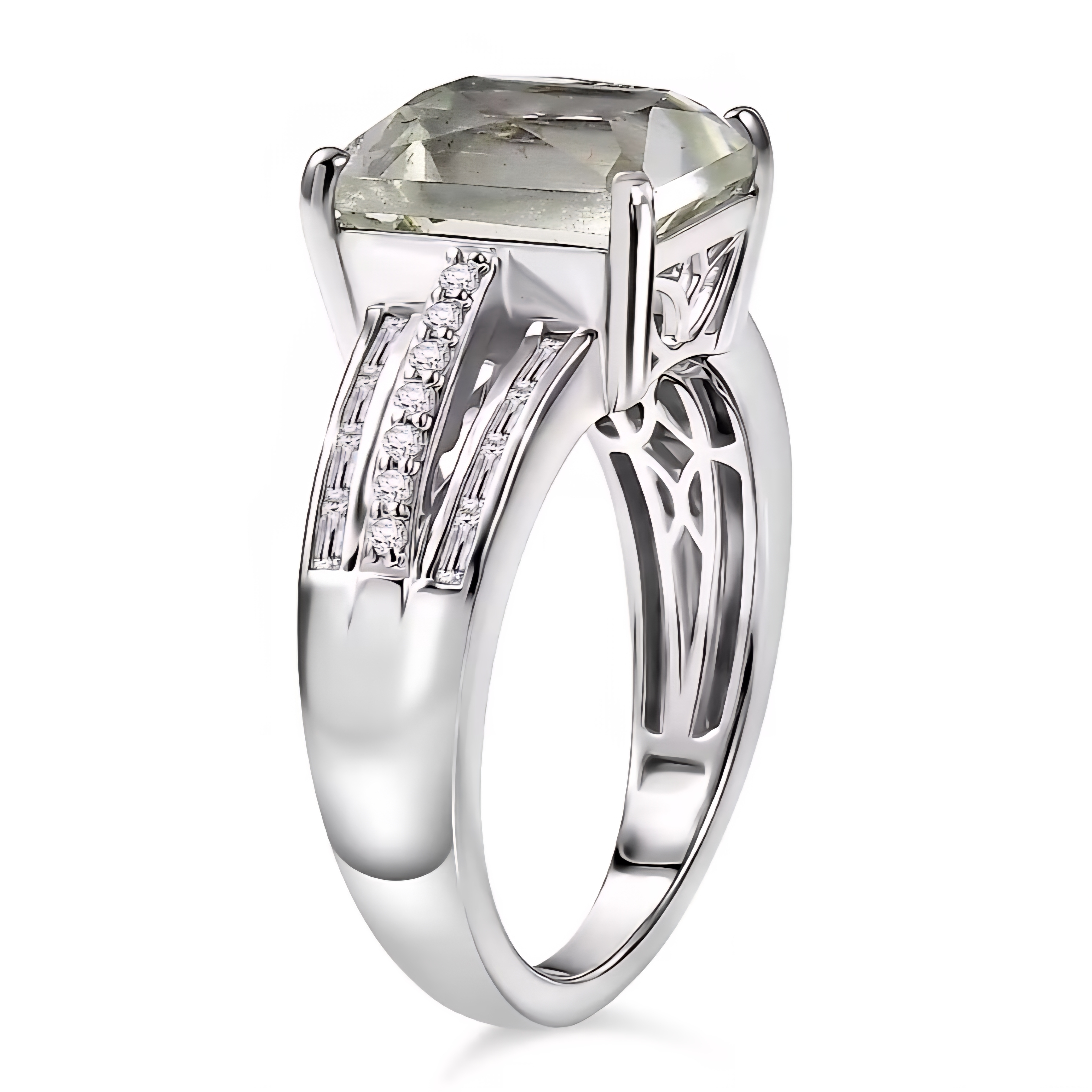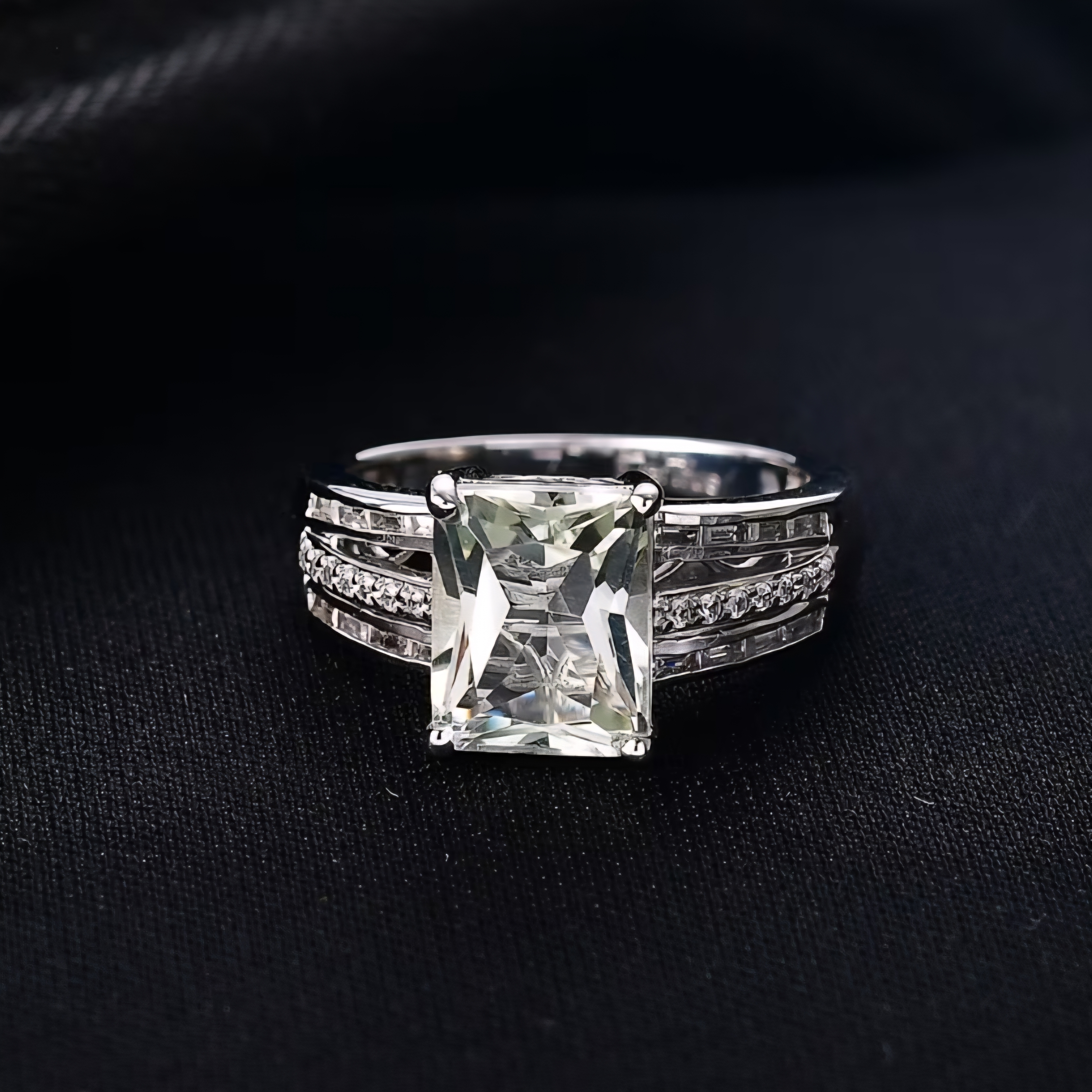 The center is a radiant cut prasiolite in a bright mint-green tone, sized at a bold 10x8mm. Radiant cuts are perfect for prasiolite because they don’t just show color, they throw light back like crazy, so the stone looks alive instead of flat.