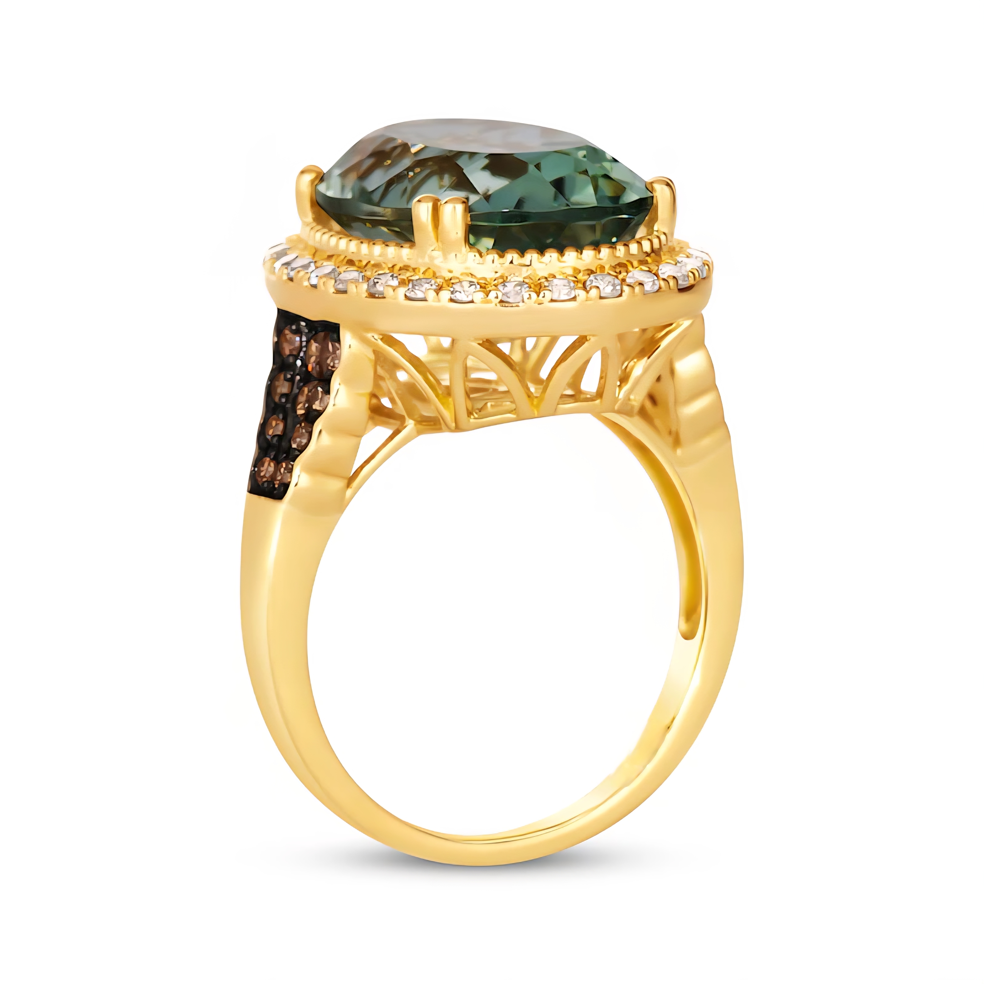 This oversized halo ring is built to stun. At the center, an 11 carat prasiolite gleams with its green brilliance. Surrounding it, a halo of crisp white diamonds intensifies the glow, while rich brown diamonds line the shoulders for contrast and depth. Crafted in solid 14K yellow gold and finished with black rhodium accents, it’s a powerhouse blend of light, color, and luxury.