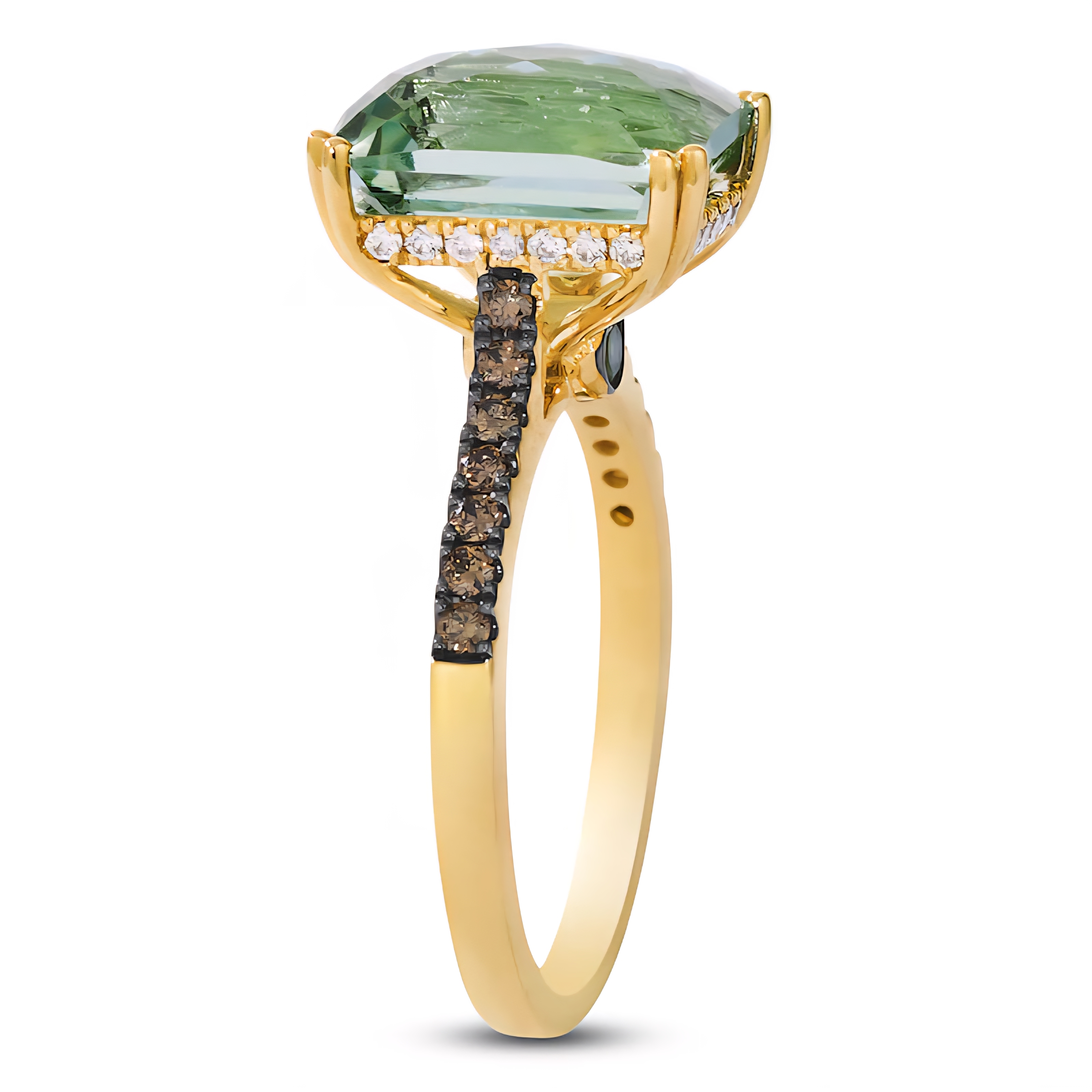 A luminous cushion-cut prasiolite is set in a sculpted mount edged with white diamonds, giving the center stone a radiant frame of light. Along the band, rich brown diamonds add warmth and depth, contrasting beautifully with the crisp green quartz. From the side, two tsavorite garnets ignite the profile — a bold detail that elevates the ring from every angle. Finished in 14K yellow gold with black rhodium accents, this design is all about dimension, contrast, and unapologetic brilliance.