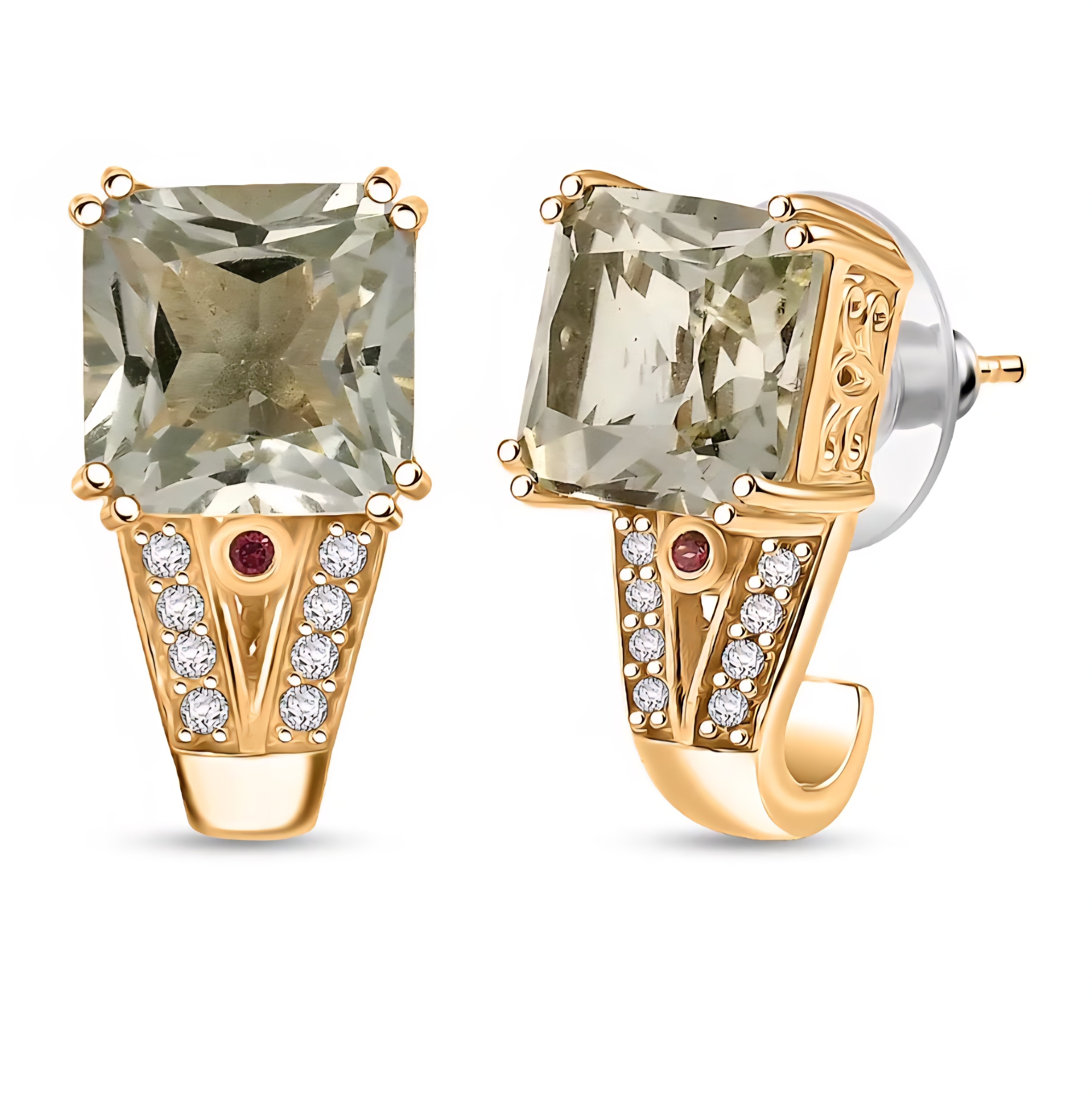 Then Gallery Gems-level details take over: bright white zircon accents add sharp brilliance down the front, and a tiny rhodolite garnet is set like a hidden signature. That little flash of deep purple-red against the gold is exactly what makes these feel intentional and high-end instead of basic “big stone” studs. Finished in 18K yellow gold plating over solid 925 sterling silver, these are statement earrings you can actually wear all day long!