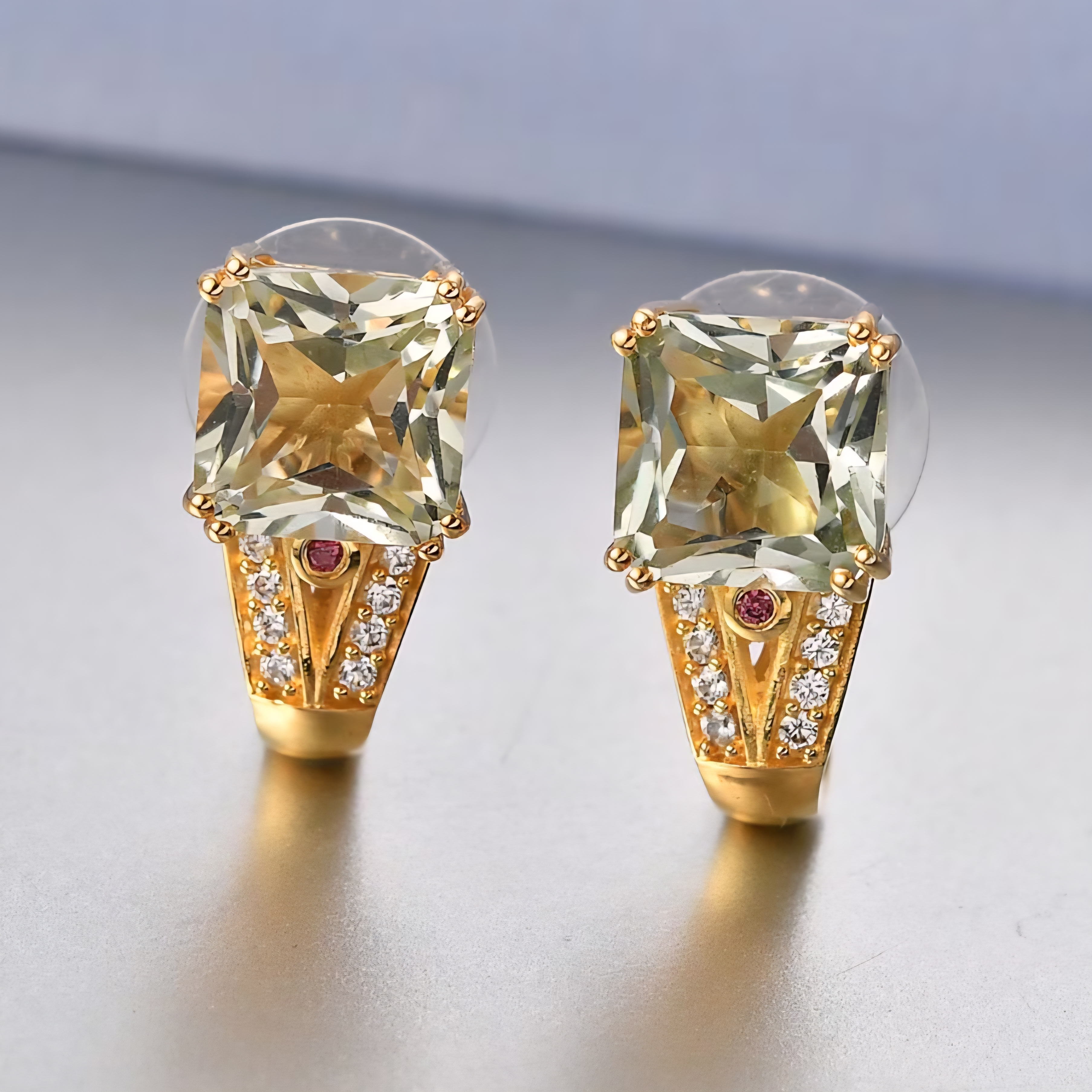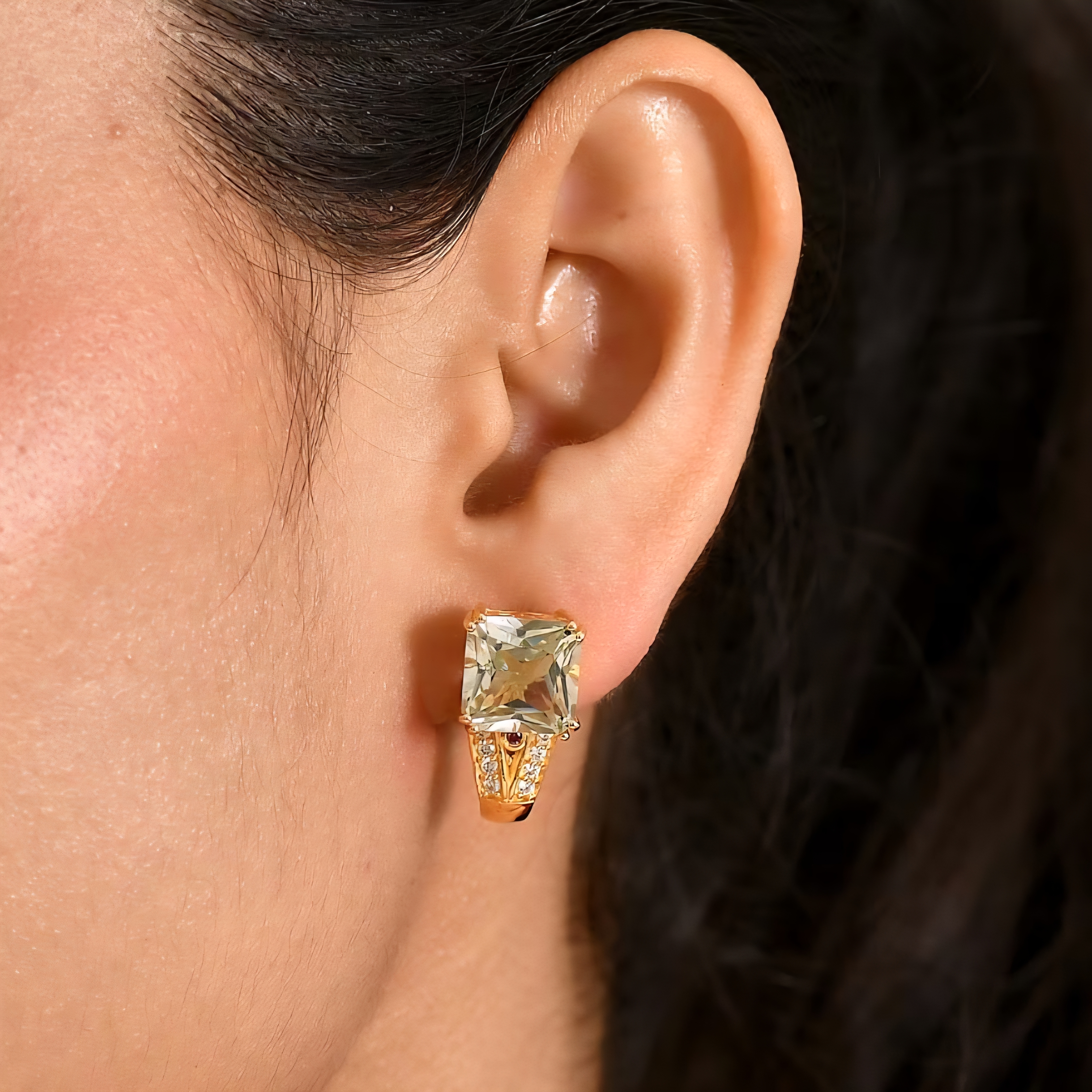 These earrings are clean, bold, and well designed. Each one features a huge 10mm square-cut prasiolite, giving you that icy green glow prasiolite is famous for, with a crisp geometric shape that looks expensive the second it hits the light.