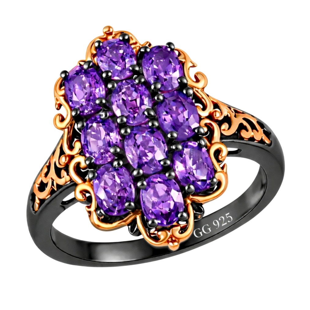 A dense cluster of purple sapphires forms a rich field of color, reading deep and regal rather than bright. The stones are framed by ornate openwork filigree, with flowing scroll details and pierced metal that introduce shadow, depth, and visual movement throughout the design.