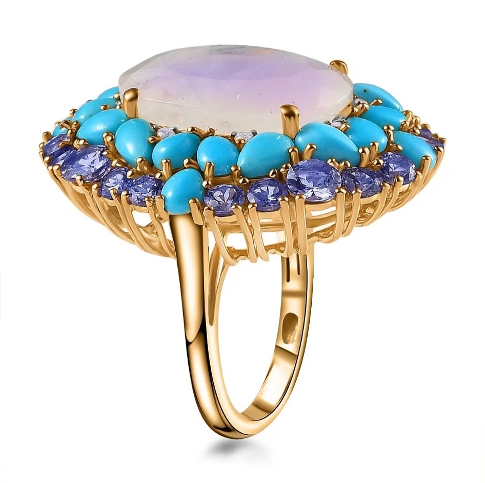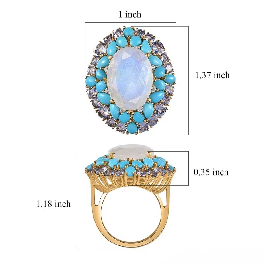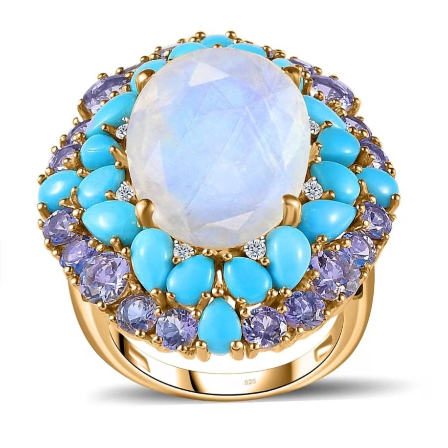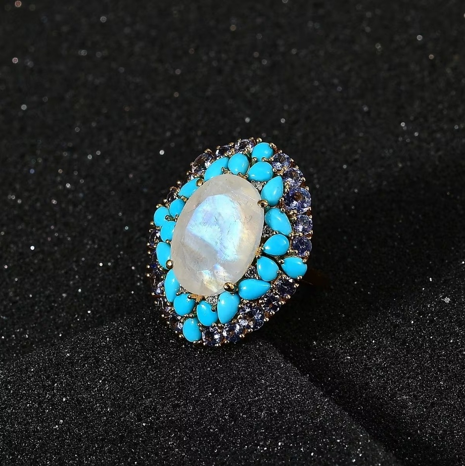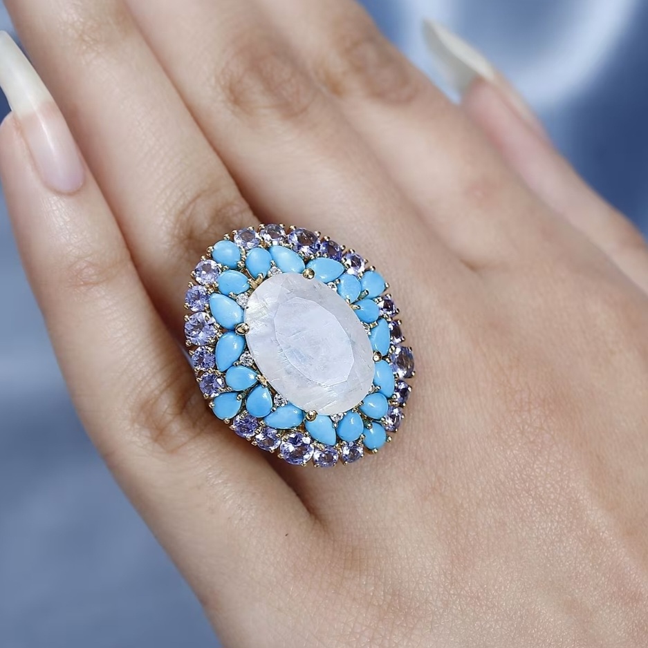 Surrounding the moonstone is a bold, multi-layered arrangement of gemstones. A ring of Sleeping Beauty turquoise adds a bright, saturated blue, while an outer halo of tanzanite introduces deeper blue-violet tones for contrast. Small white zircon accents are set between sections, adding pinpoint flashes of light that help separate and define each layer.