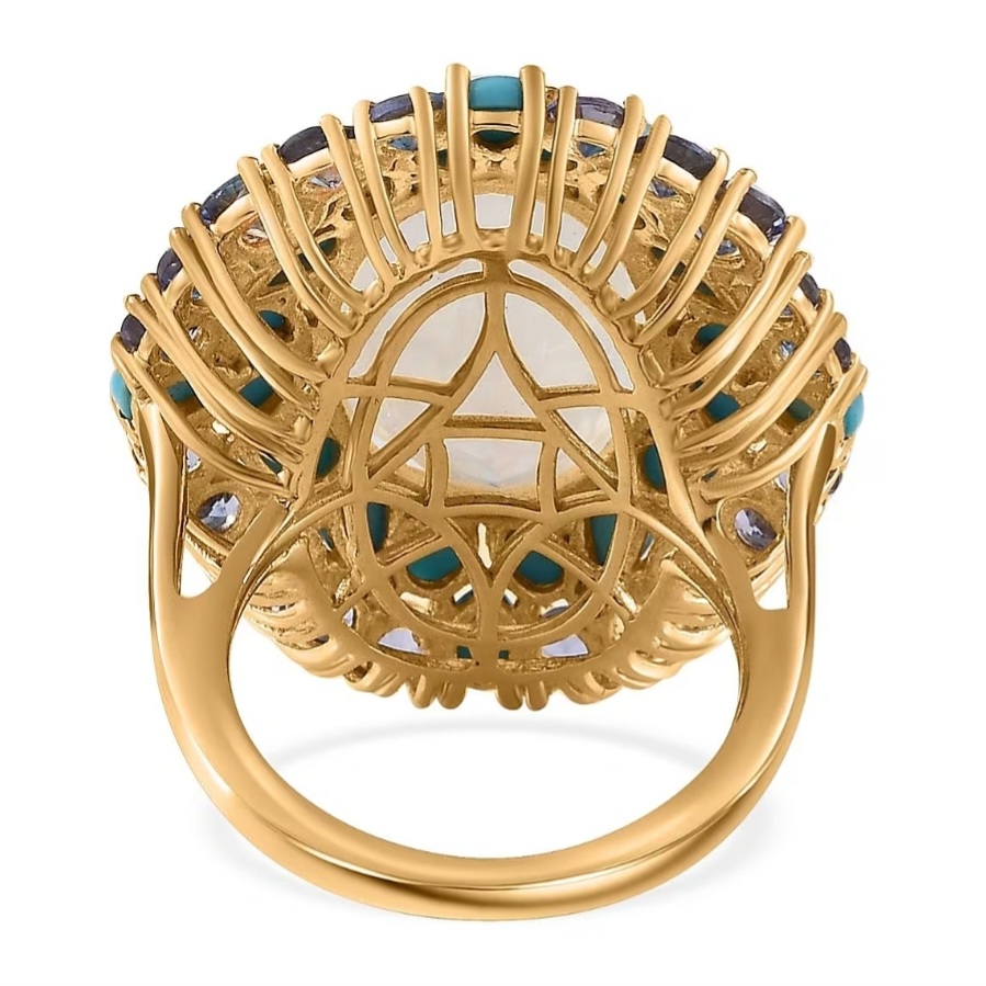The setting is finished in 18K yellow gold vermeil over sterling silver, bringing warmth to the overall palette and tying the different gemstone colors together. The elevated top and wider build give the ring a strong presence on the hand, supported by a smooth, structured band.
