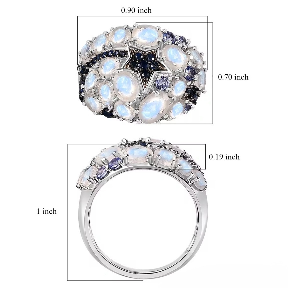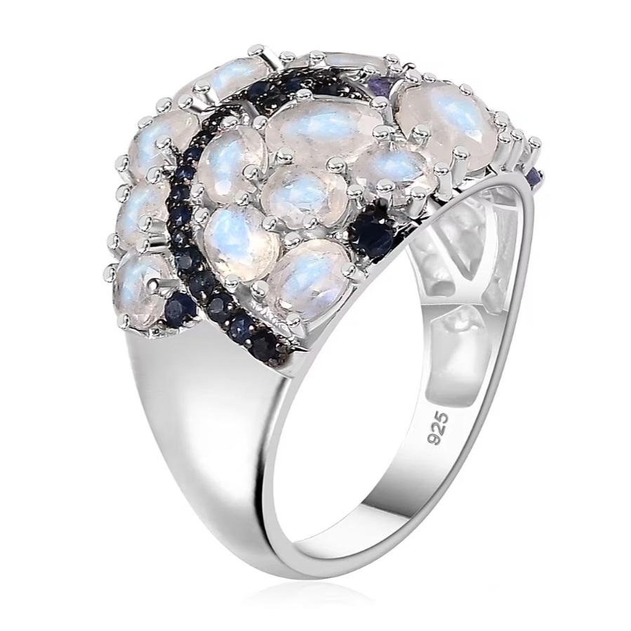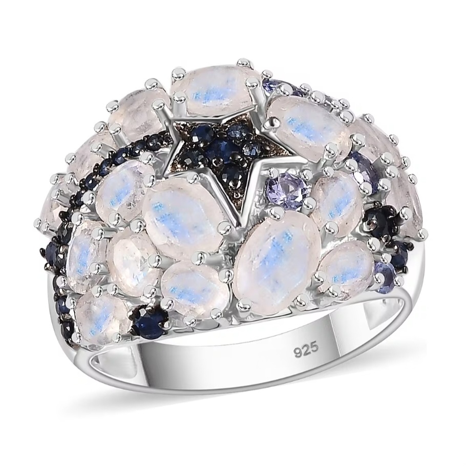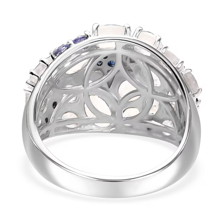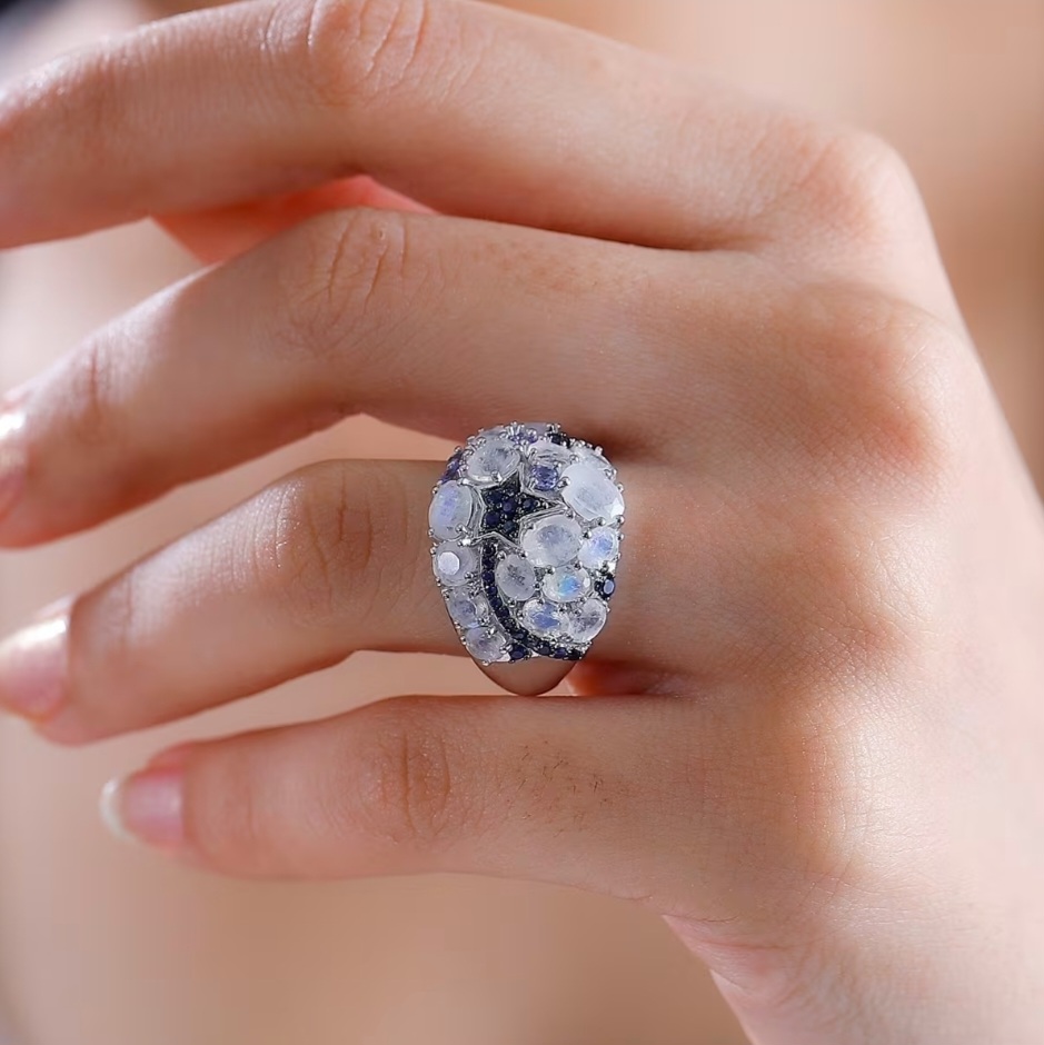 The design is arranged in an asymmetrical cluster, with moonstones placed at varying angles to give a more natural, flowing look. Between them, deep blue sapphire and tanzanite accents add contrast and help define the overall pattern, breaking up the lighter tones of the moonstone and adding depth throughout the design.