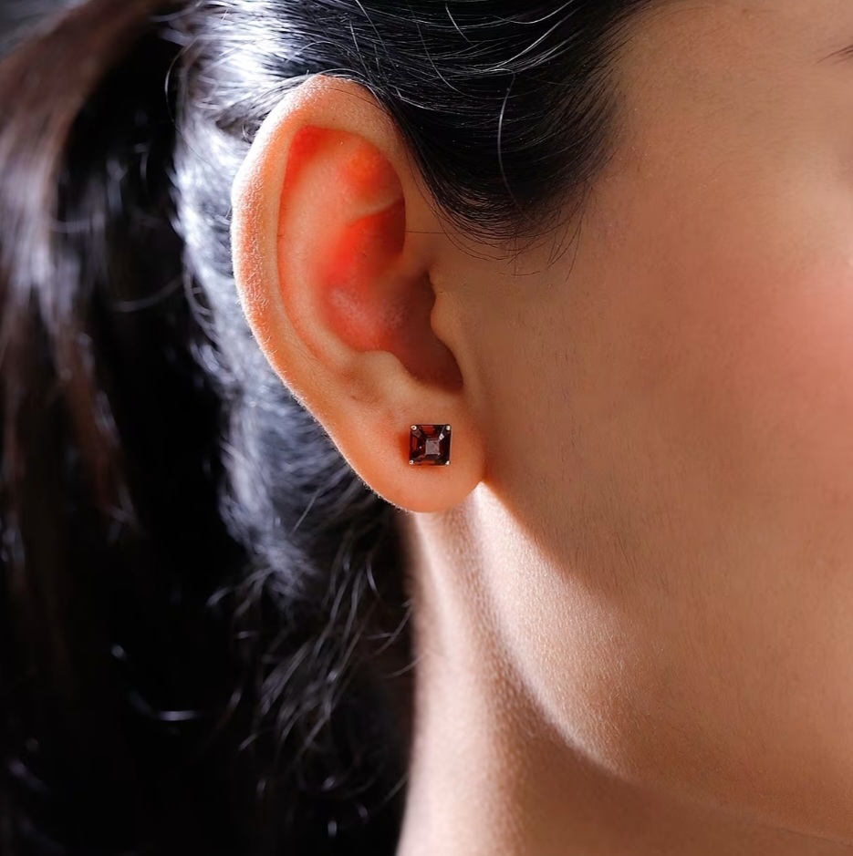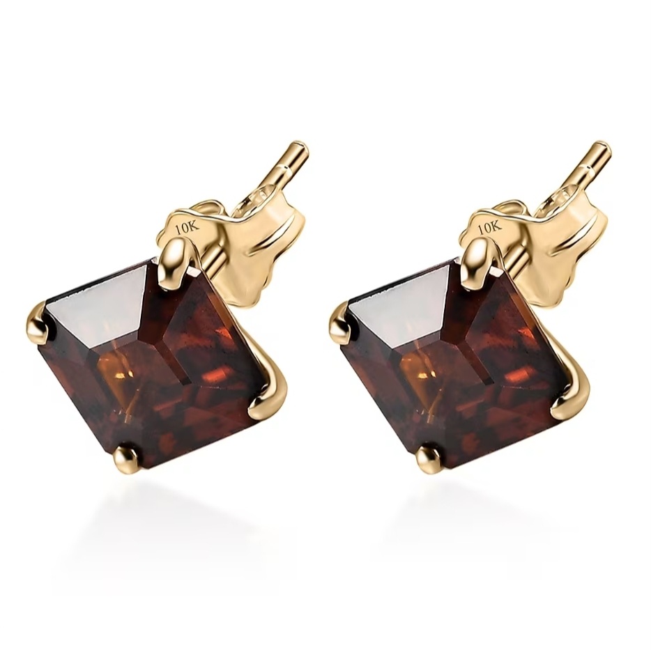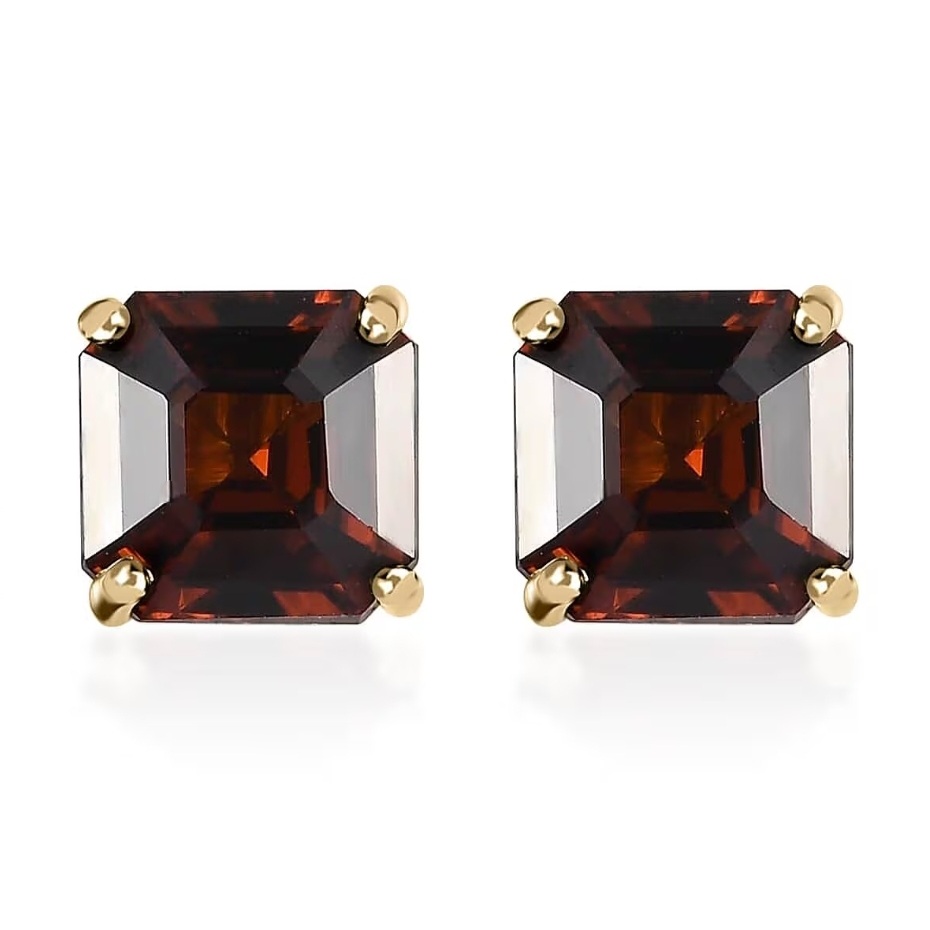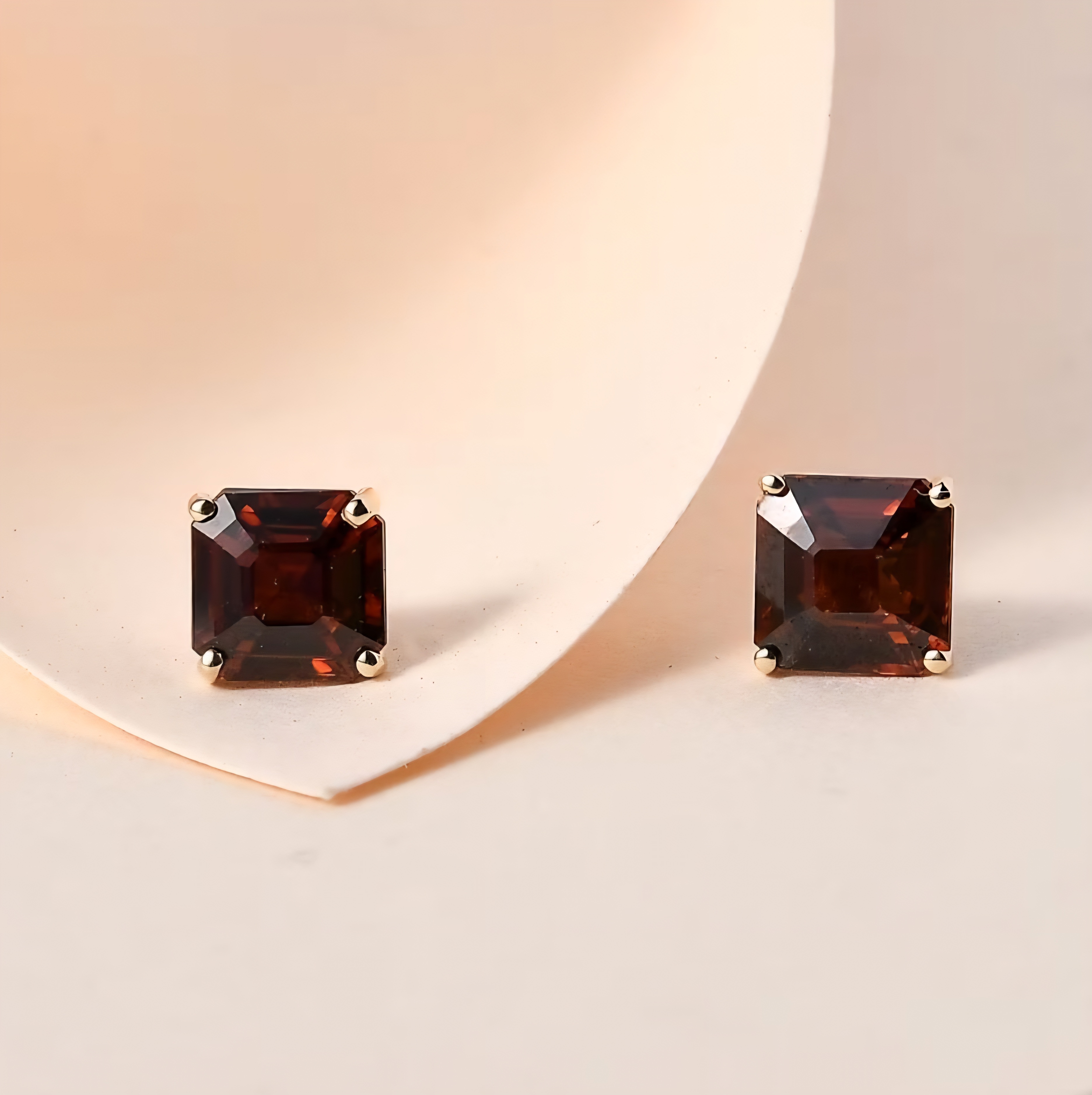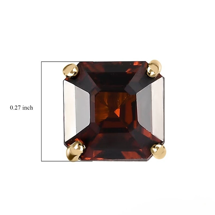 Elegant and refined, these Asscher-cut Red Zircon studs radiate warmth and precision. The 6mm gems showcase a fiery crimson depth with mirror-like step facets that draw light inward, giving a rich, dimensional glow. Each stone is securely set in solid 10k yellow gold four-prong mountings, balancing strength and simplicity. Finished with post and friction butterfly backs, these earrings offer everyday wearability with timeless sophistication.