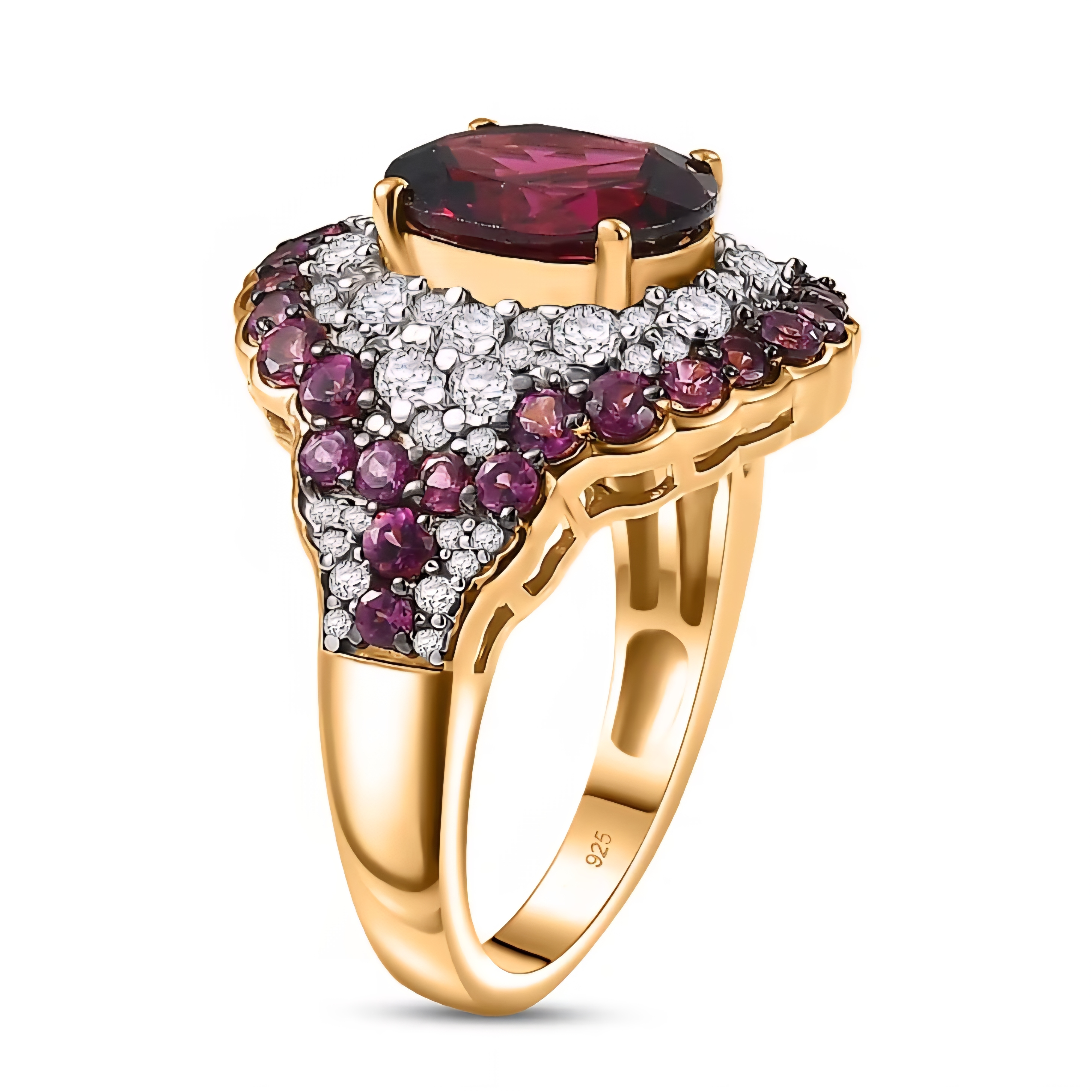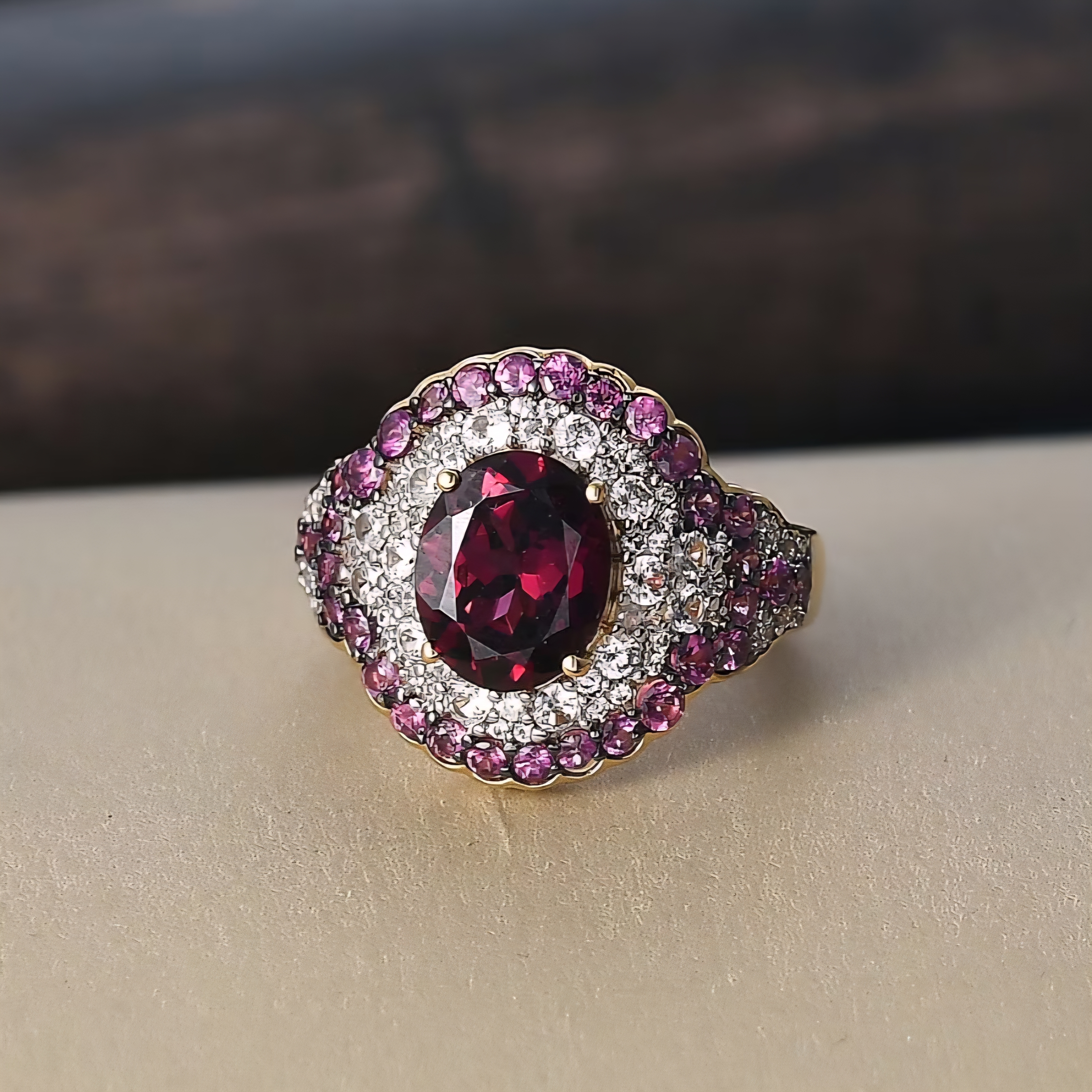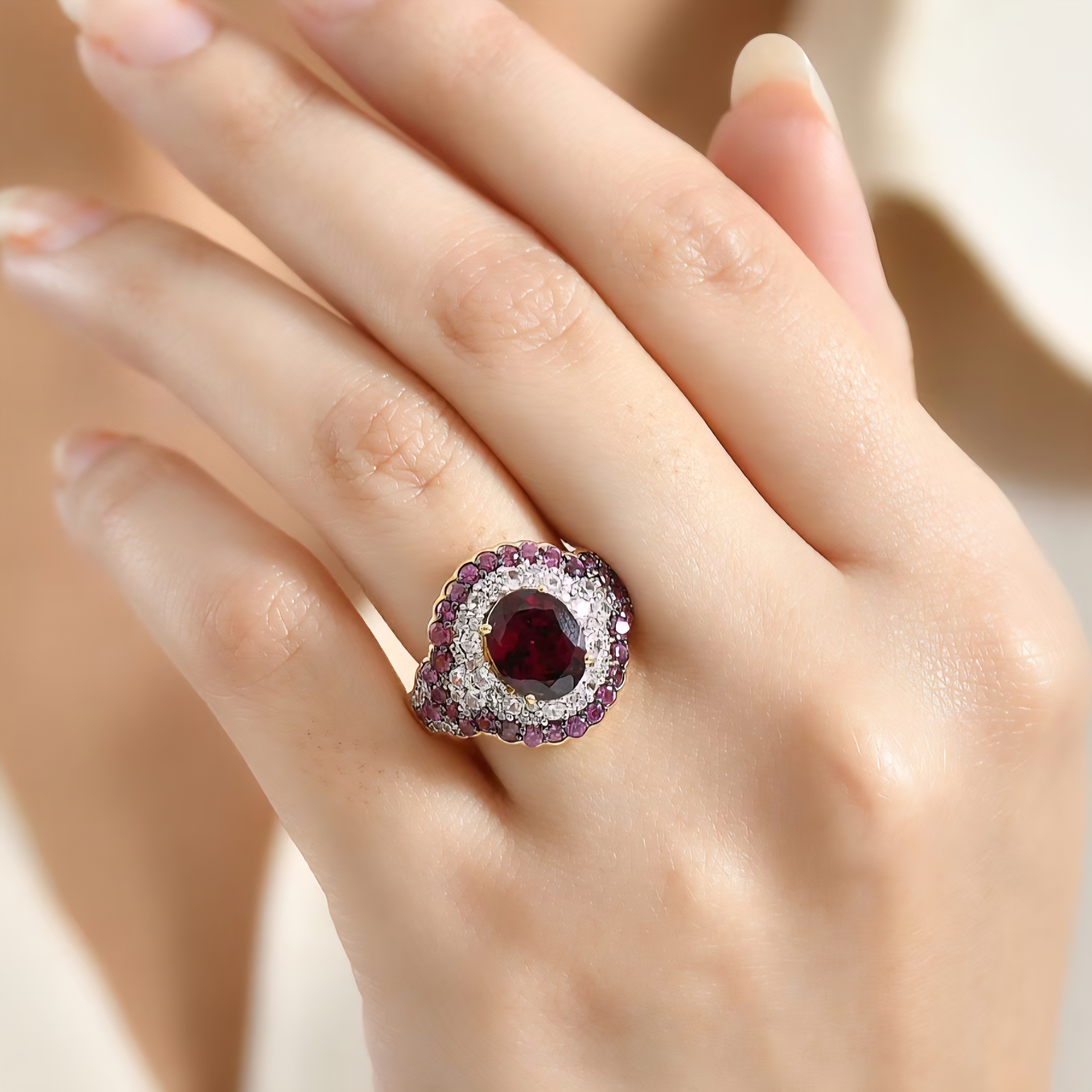 The inner halo is packed with bright white zircon for sharp brilliance. The outer halo is loaded with matching rhodolite rounds, creating a double-layered frame that amplifies the center stone instead of competing with it. The result is bold, rich, and dimensional, with contrast that makes the whole ring look bigger and more intense.