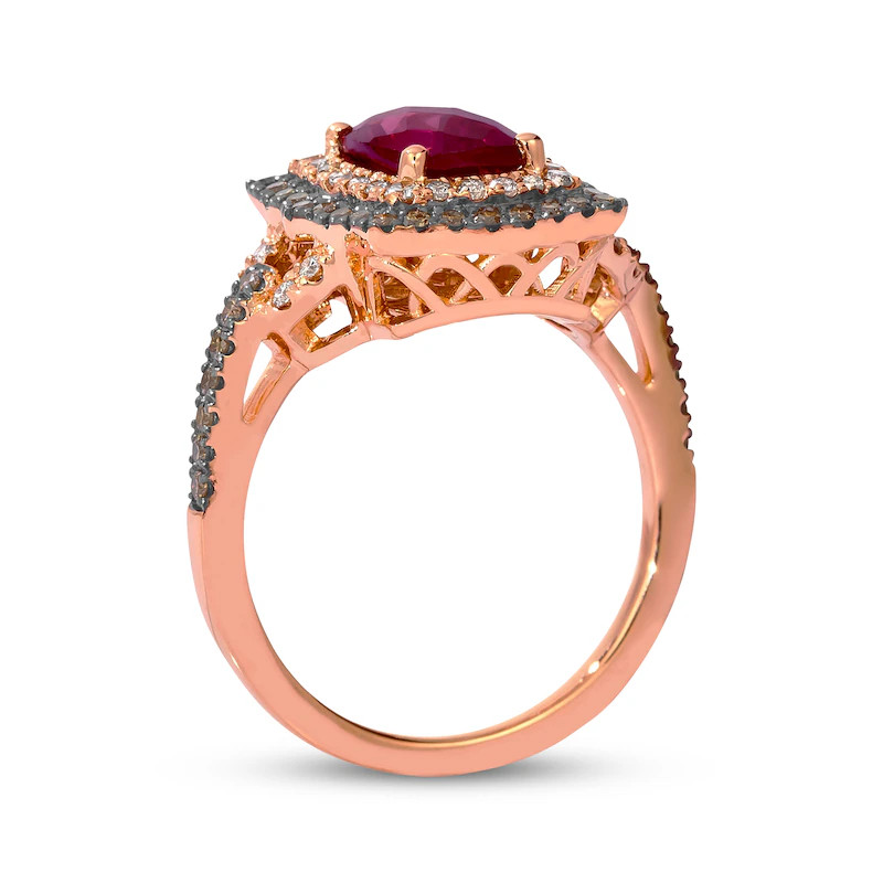 This luxurious halo ring centers on a rich 8x6mm cushion-cut rhodolite garnet (1.75ctw), checkerboard faceted to reveal its deep purple-red brilliance. Surrounding the garnet is a dual halo of sparkling brown diamonds (0.35ctw) and shimmering champagne diamonds (0.15ctw), creating a bold contrast of tones that radiates warmth and fire. The split shank design continues the diamond accents along the shoulders, finished with black rhodium detailing to heighten the drama. Crafted in solid 14K rose gold (3.90g), this 2.25ctw design combines richness, sophistication, and striking modern elegance.