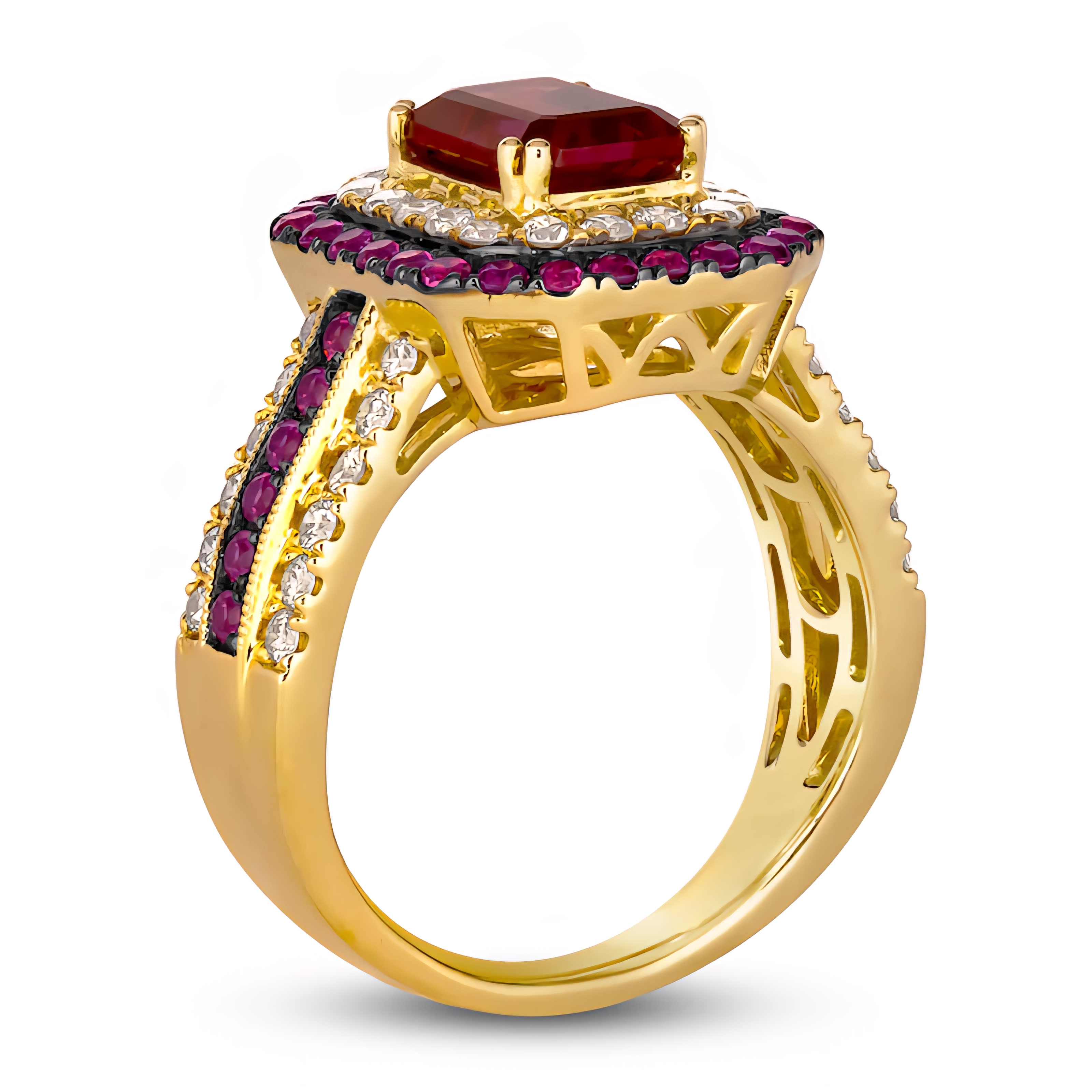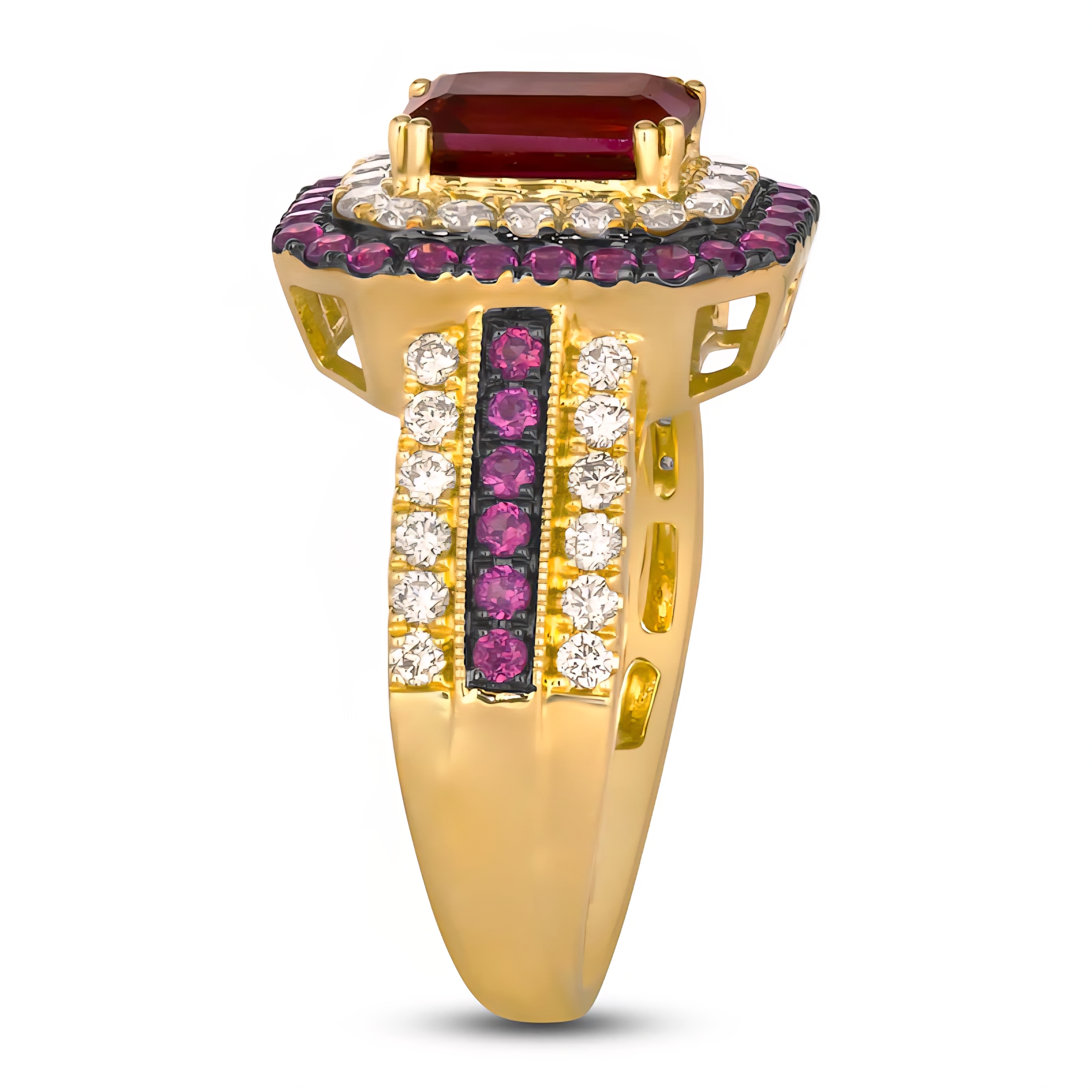 A bold and regal design, this statement ring features a richly hued 8x6mm emerald-cut rhodolite garnet at its center. The garnet is framed by a double halo of sparkling white diamonds and additional rhodolite accents, creating layers of brilliance and contrast. The split shank continues the luxury with alternating rows of diamonds and garnets, all set in warm 14K yellow gold with black rhodium details to emphasize depth. With its vibrant purple-red centerpiece and diamond fire, this 3.25ctw ring delivers both elegance and drama.