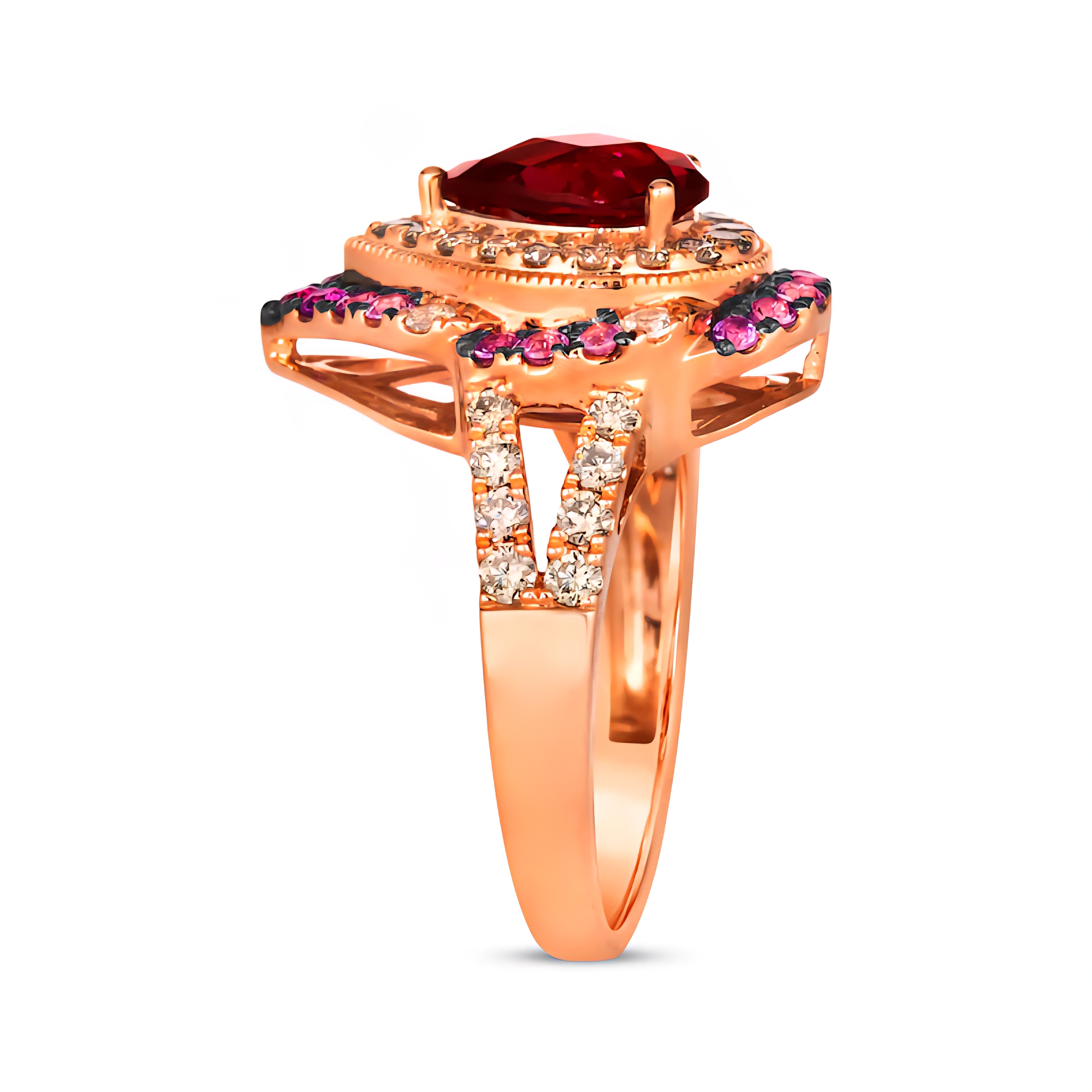 This isn’t some watered-down, cookie-cutter halo. This ring is a full-blown color storm — a checkerboard-cut pear Rhodolite lit up in deep crimson, framed twice over. First, a crisp halo of champagne diamonds with four sharp white sapphire accents to pop the fire. Then, an outer frame of pink sapphires shifting from blush to magenta, turning the whole piece into a gradient explosion. The split shank is loaded with more champagne diamonds, keeping the heat alive from every angle. Crafted in solid 14K rose gold, this ring doesn’t whisper luxury — it shouts it.