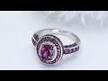 An exquisite oval rhodolite garnet, radiating a deep, captivating hue, takes center stage in this uniquely designed ring. It's embraced by a halo of brilliant white zircon, followed by a second, outer halo of rich rhodolite garnet, creating a mesmerizing layered effect. Further enhancing its allure, rhodolite garnets are meticulously set along the ring's band and mount, forming a seamless, continuous flow of color and sparkle. The striking contrast of black and white rhodium-plated sterling silver amplifies the gemstones' brilliance, making this 3.40ctw ring a testament to sophisticated artistry and contemporary design.
