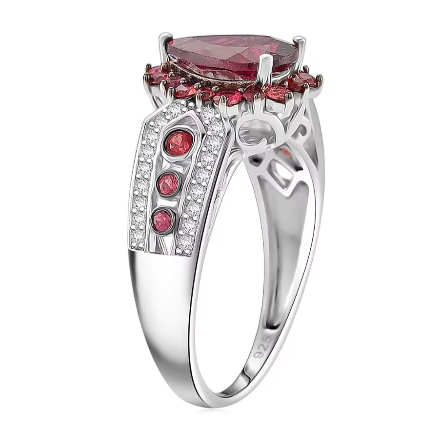 This rhodolite garnet ring is centered on a pear-shaped stone with a rich red-purple tone, creating a strong, saturated focal point. The shape adds direction to the design, giving the ring a clear top-to-bottom flow on the hand.