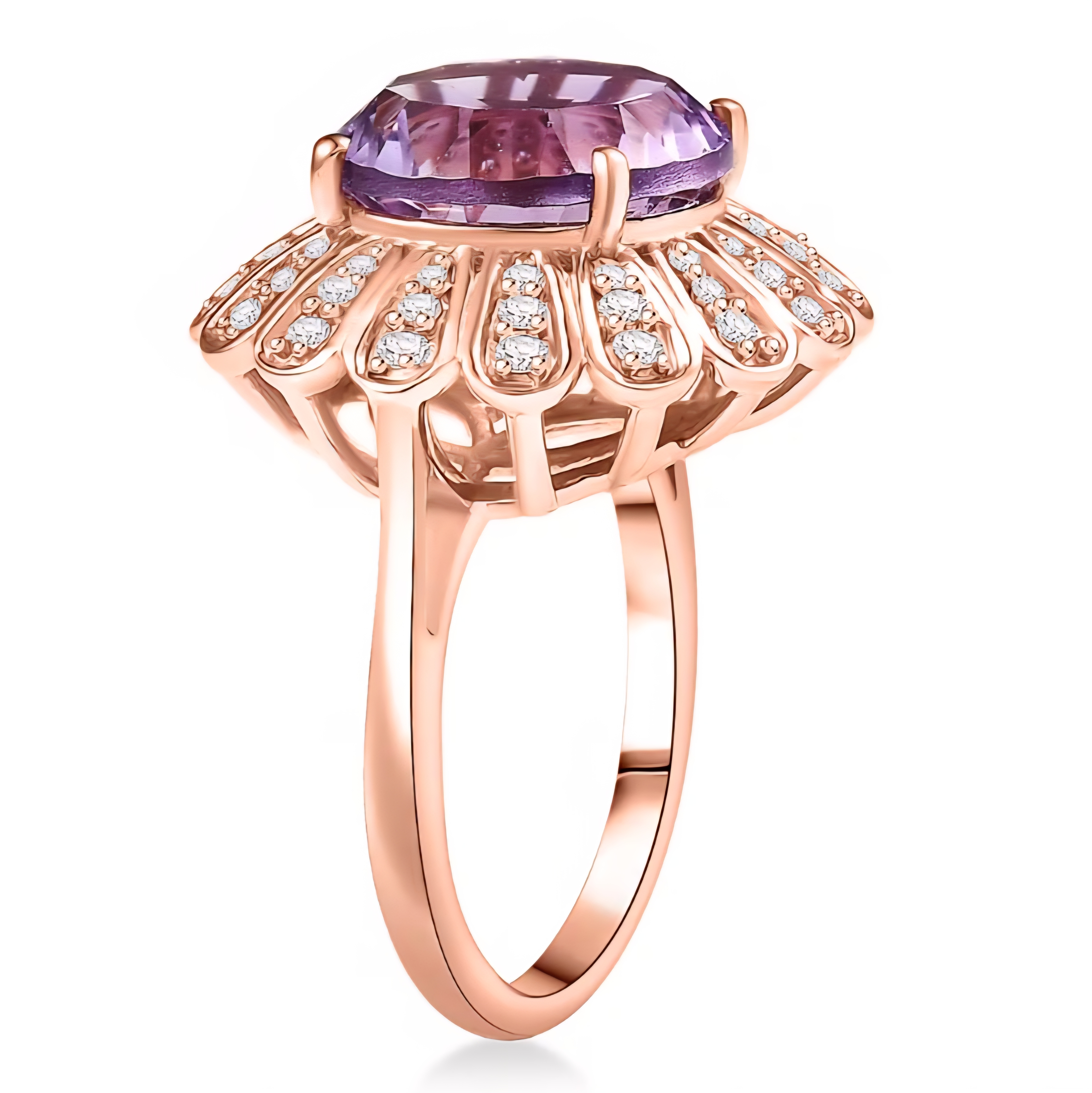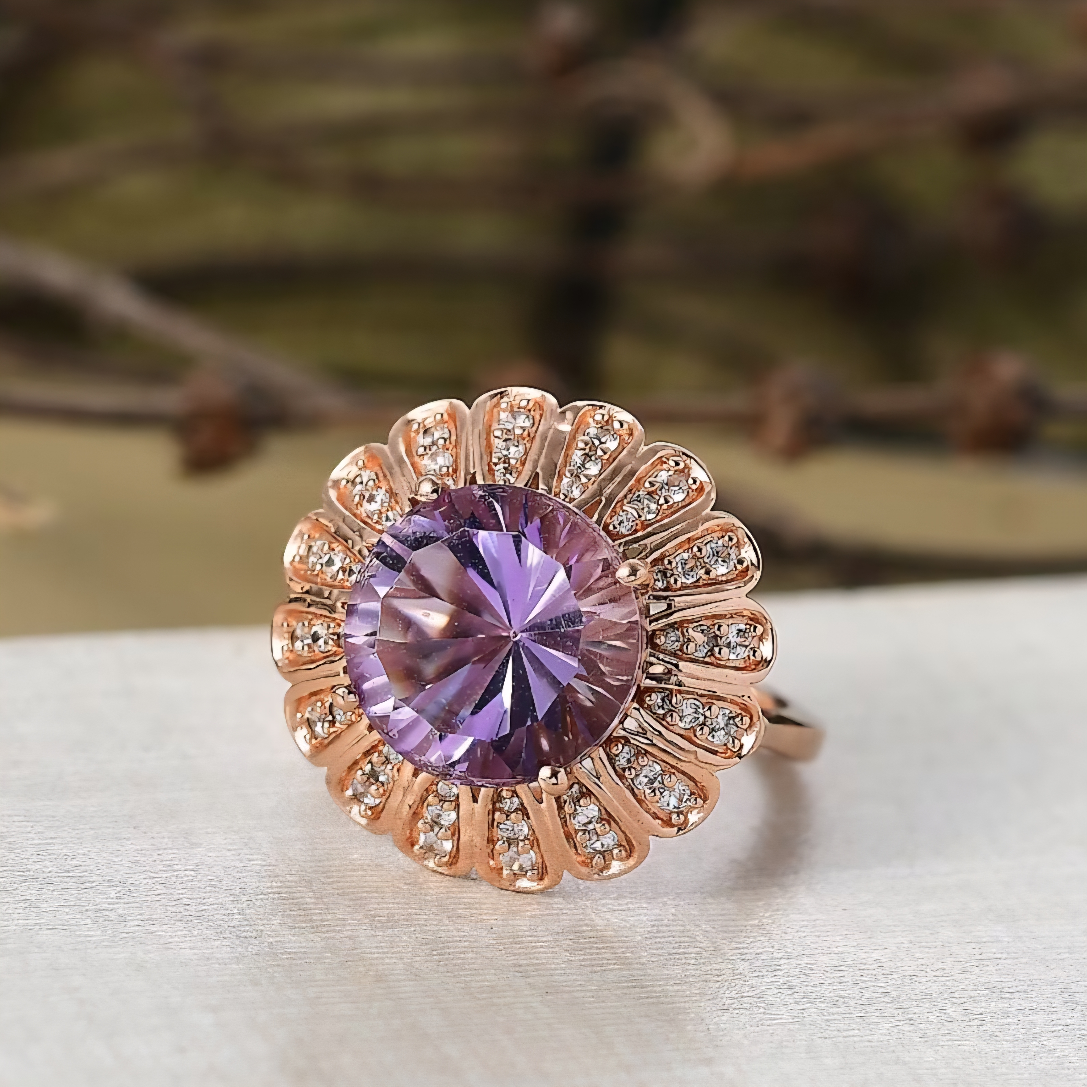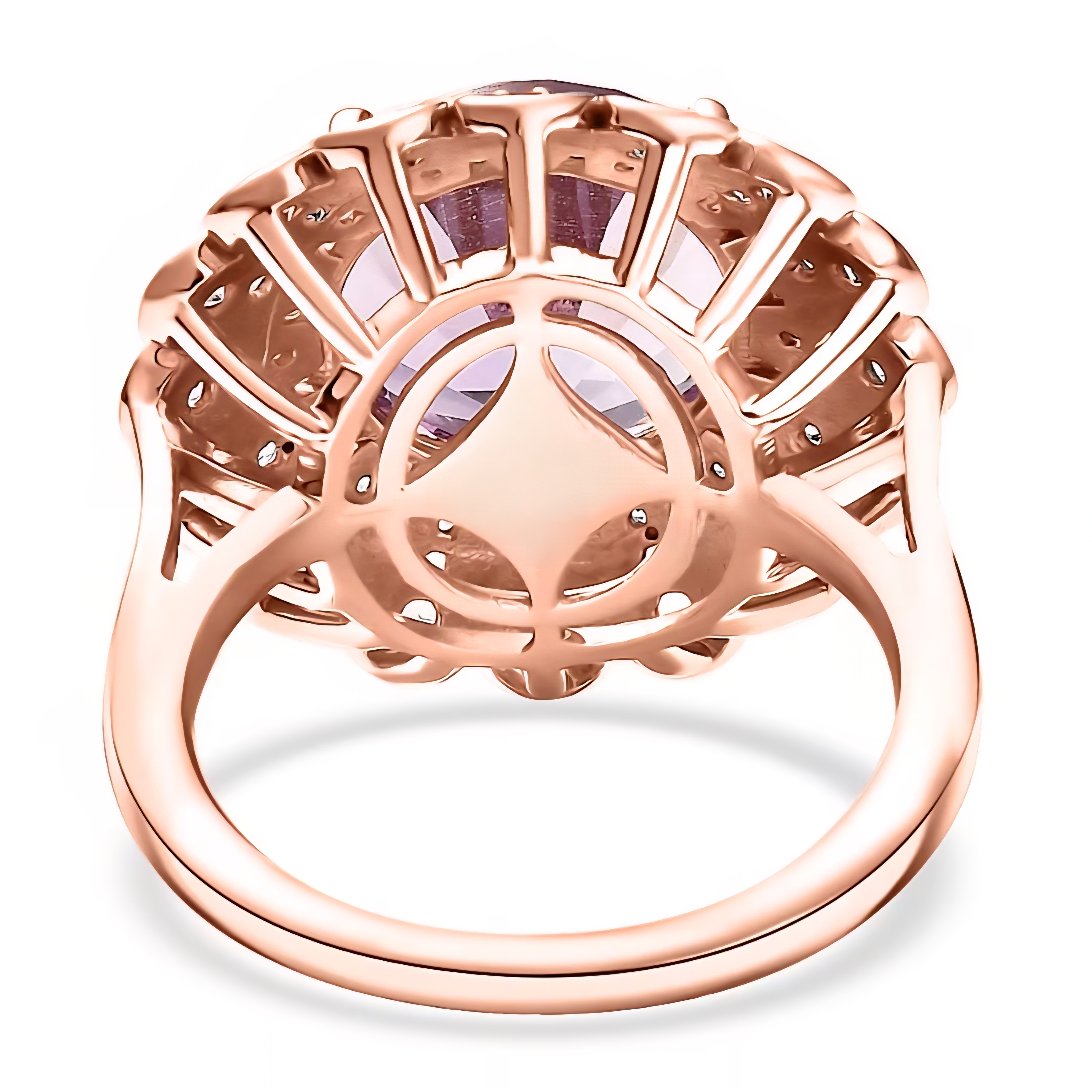 The setting fans outward in a sculpted sunburst design, finished in rich 18K rose gold plating. Each petal is set with white zircon, adding crisp sparkle and clean contrast against the warm metal and pastel center stone. The effect is dramatic without being heavy. Bold without being loud.