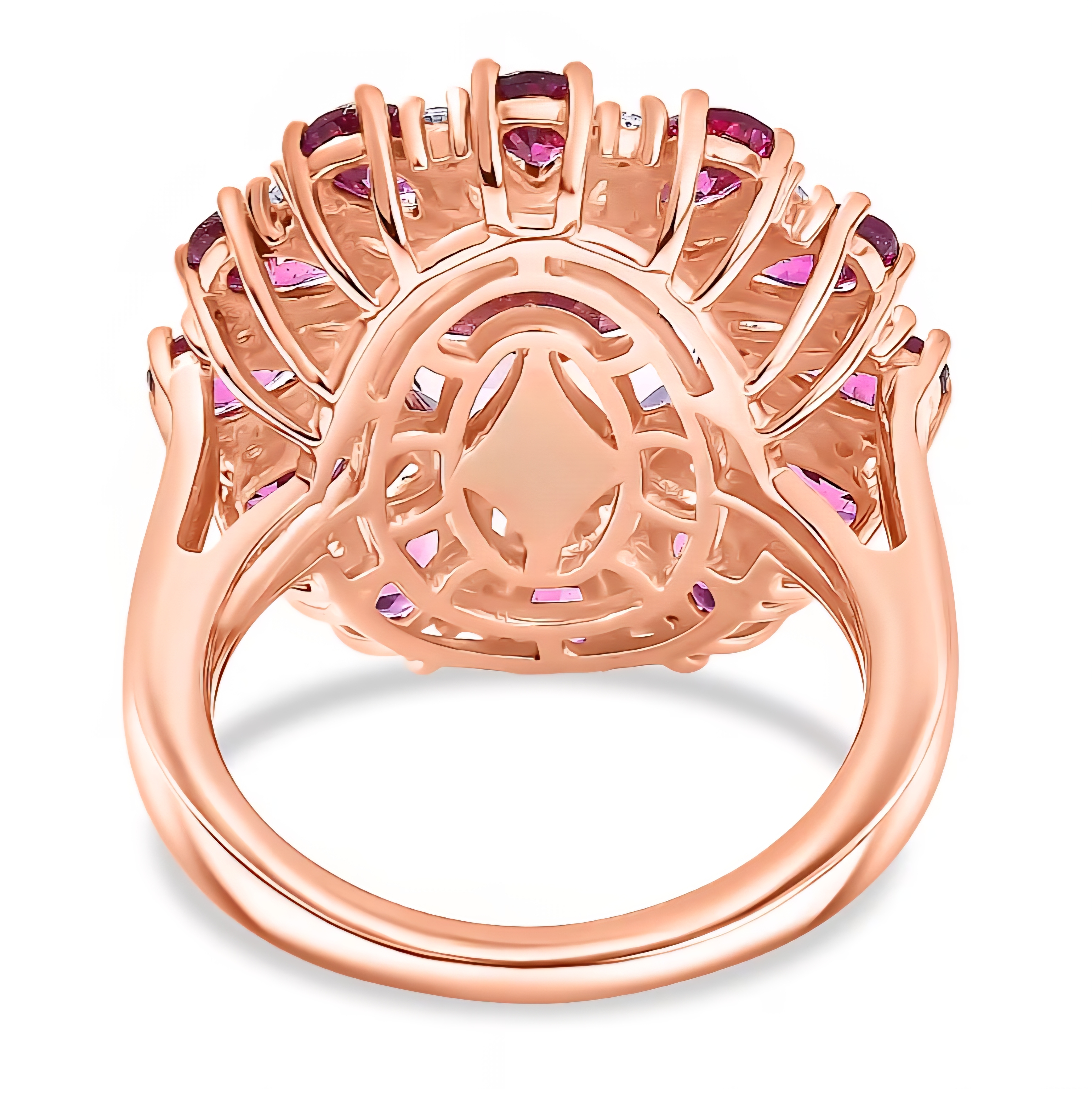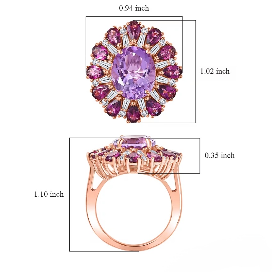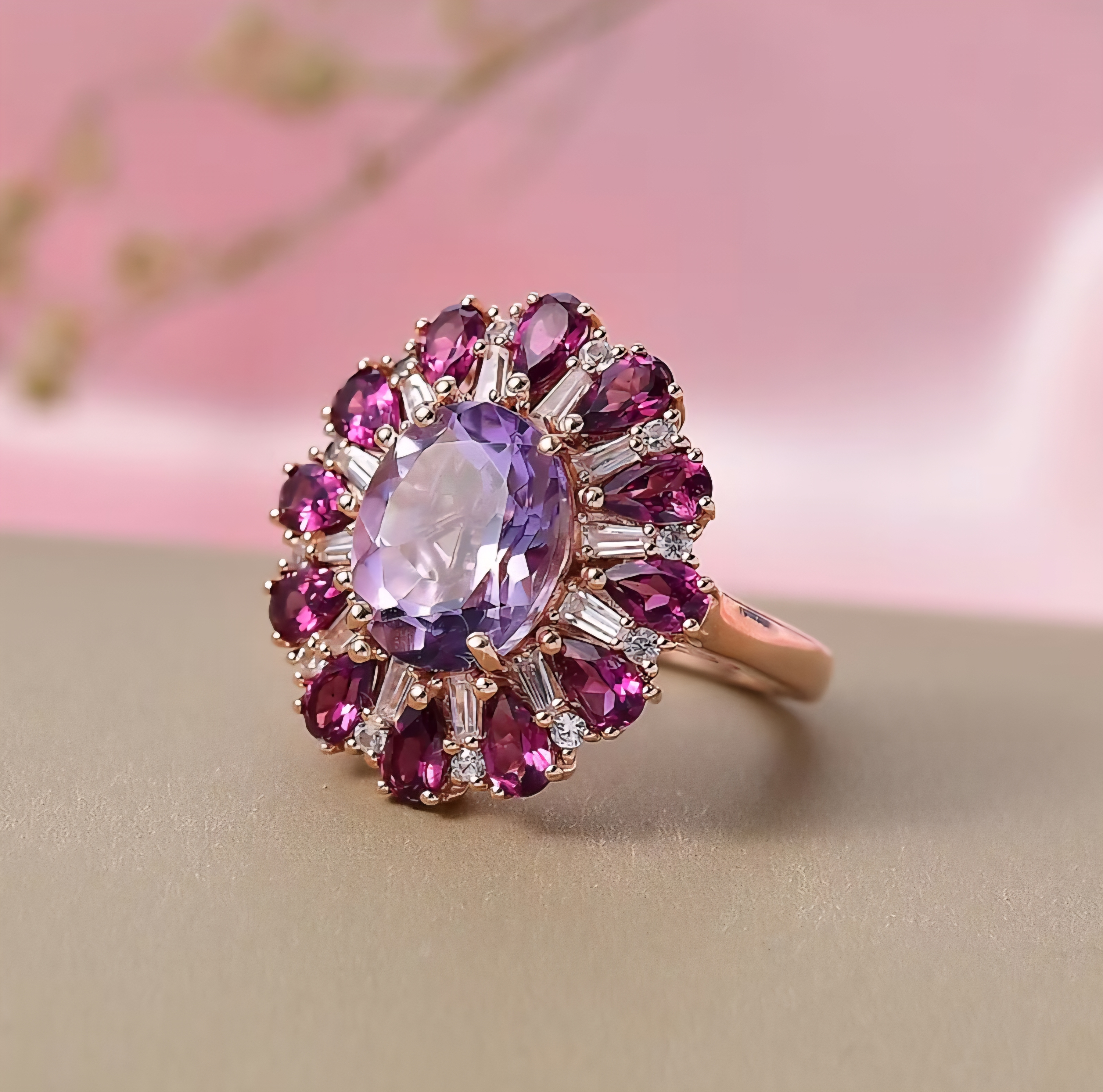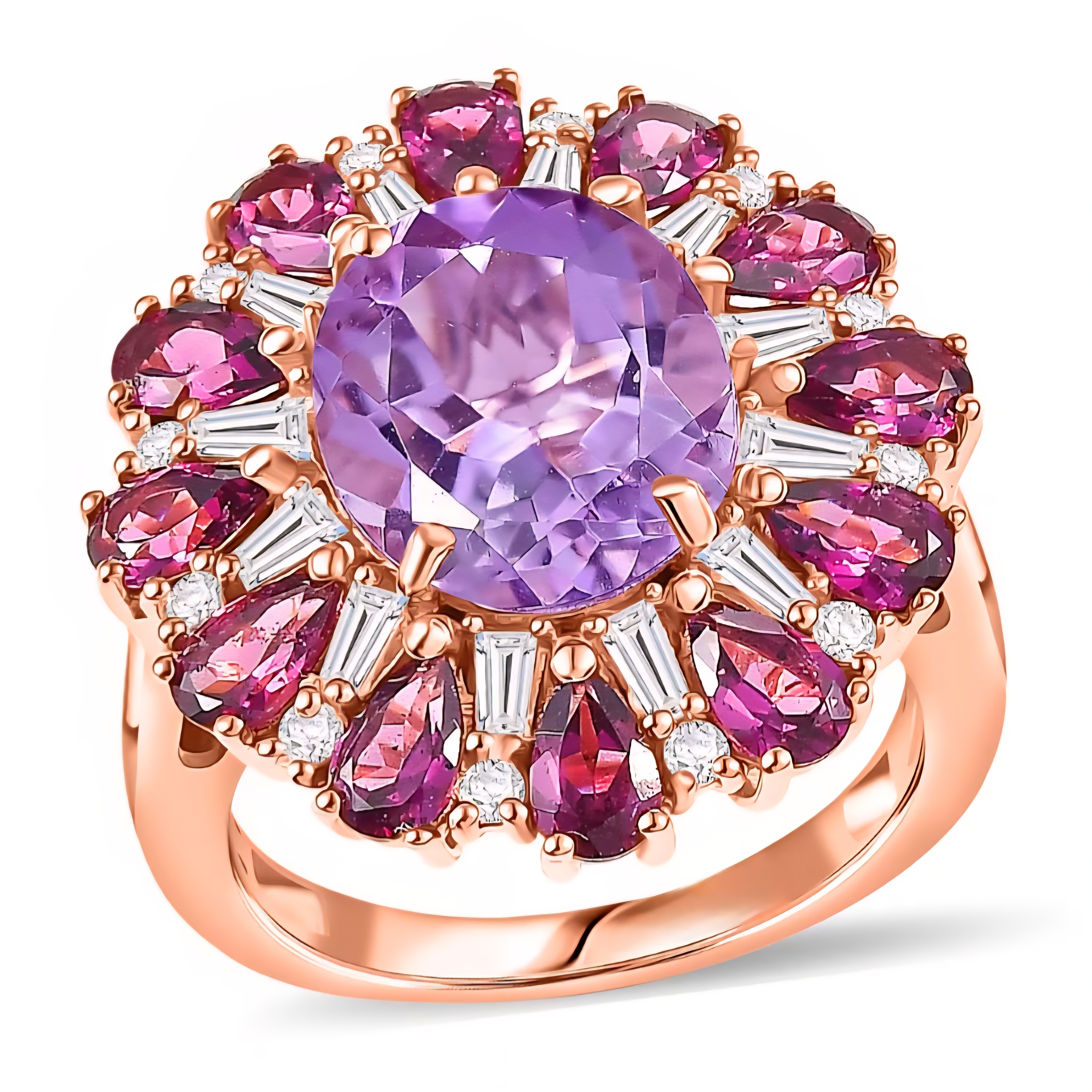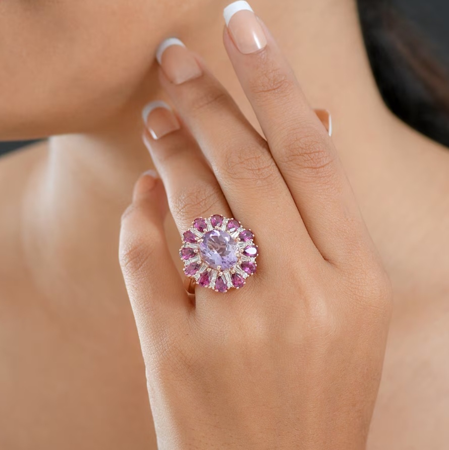 This ring is built like a gemstone firework. At the center is a 12x10mm Rose De France amethyst weighing 4.28 carats, prized for its soft blush-lavender tone and clean, romantic brilliance. It’s the lighter, more refined side of amethyst and it looks incredible in rose gold.
