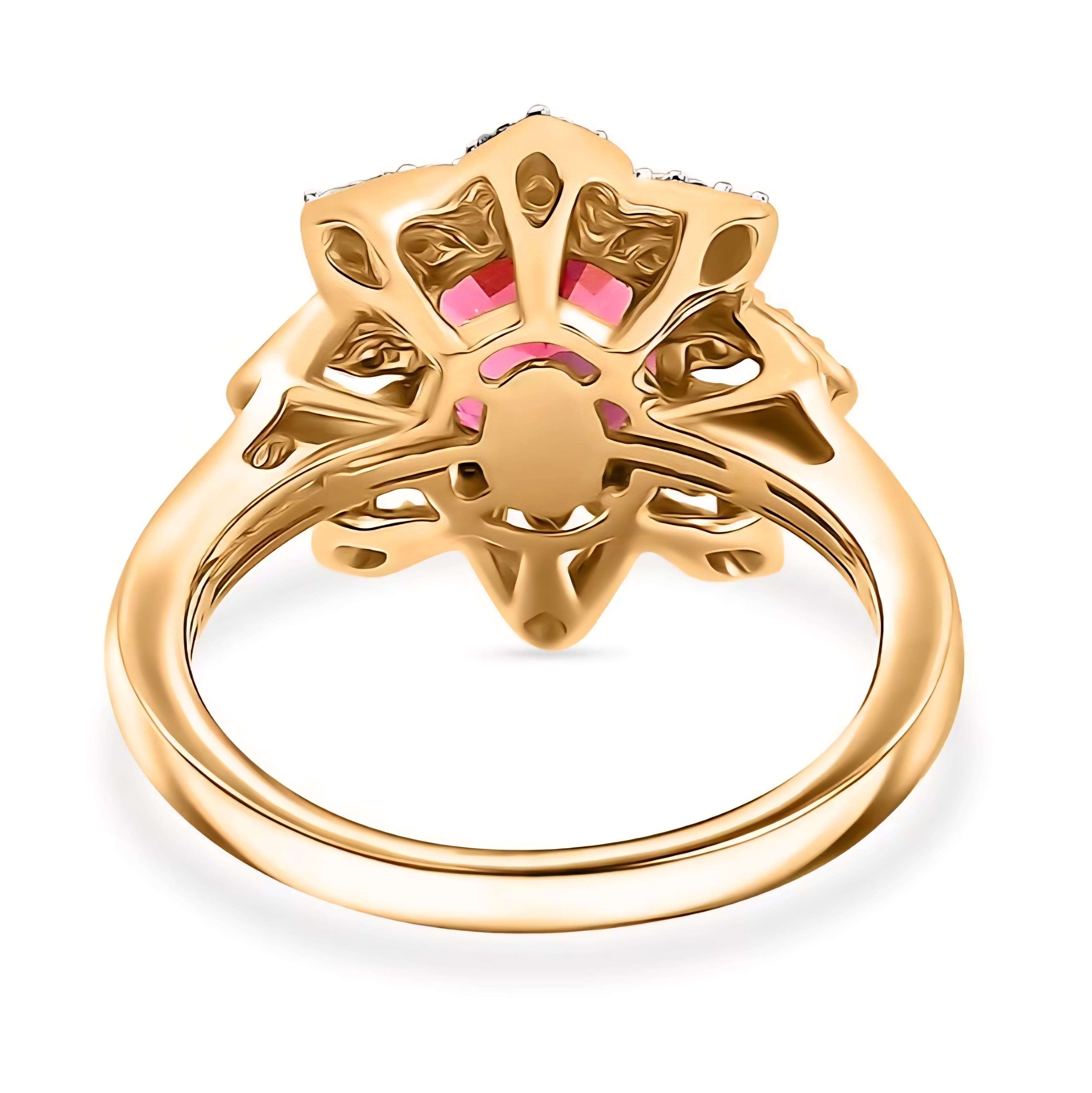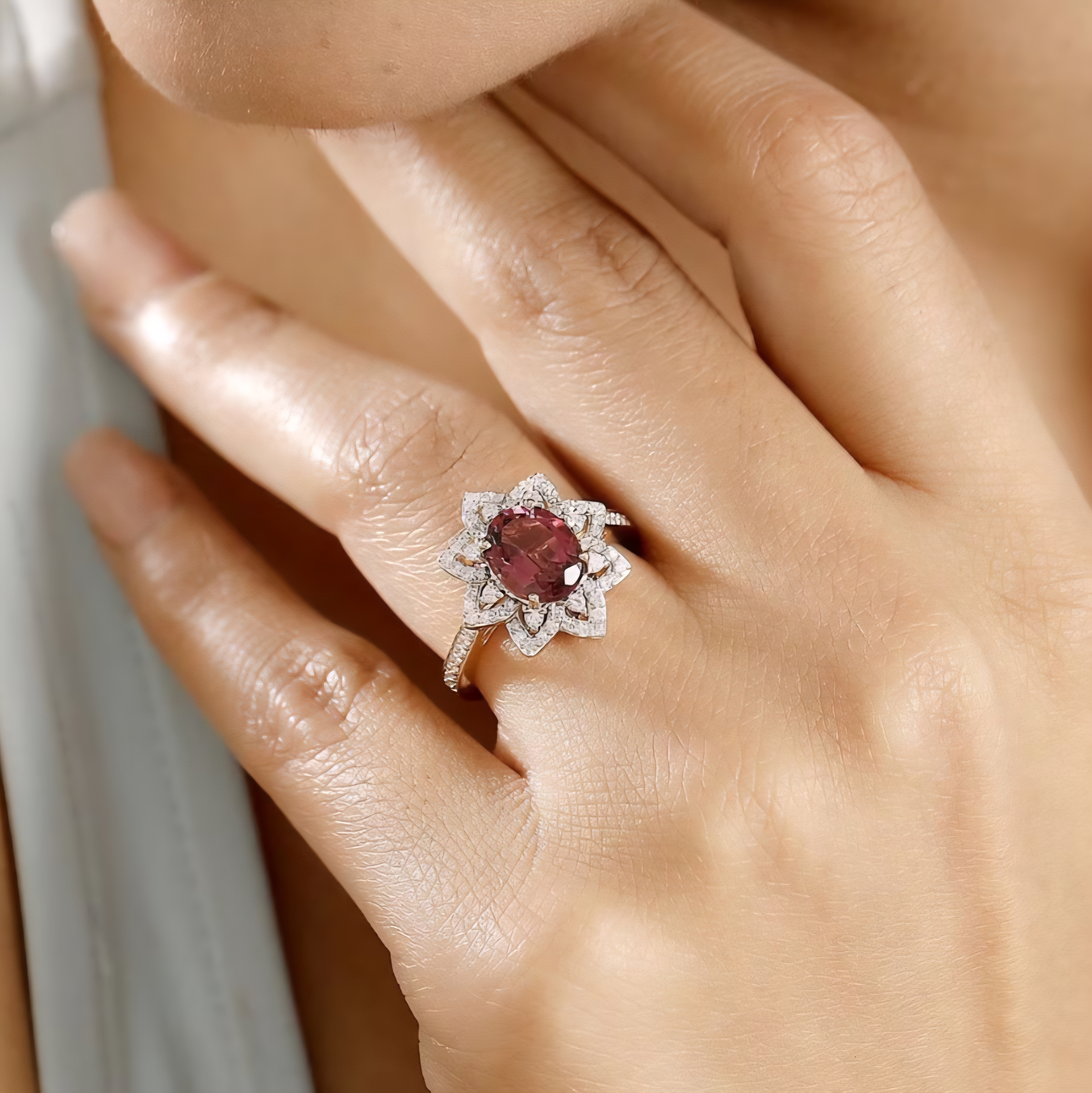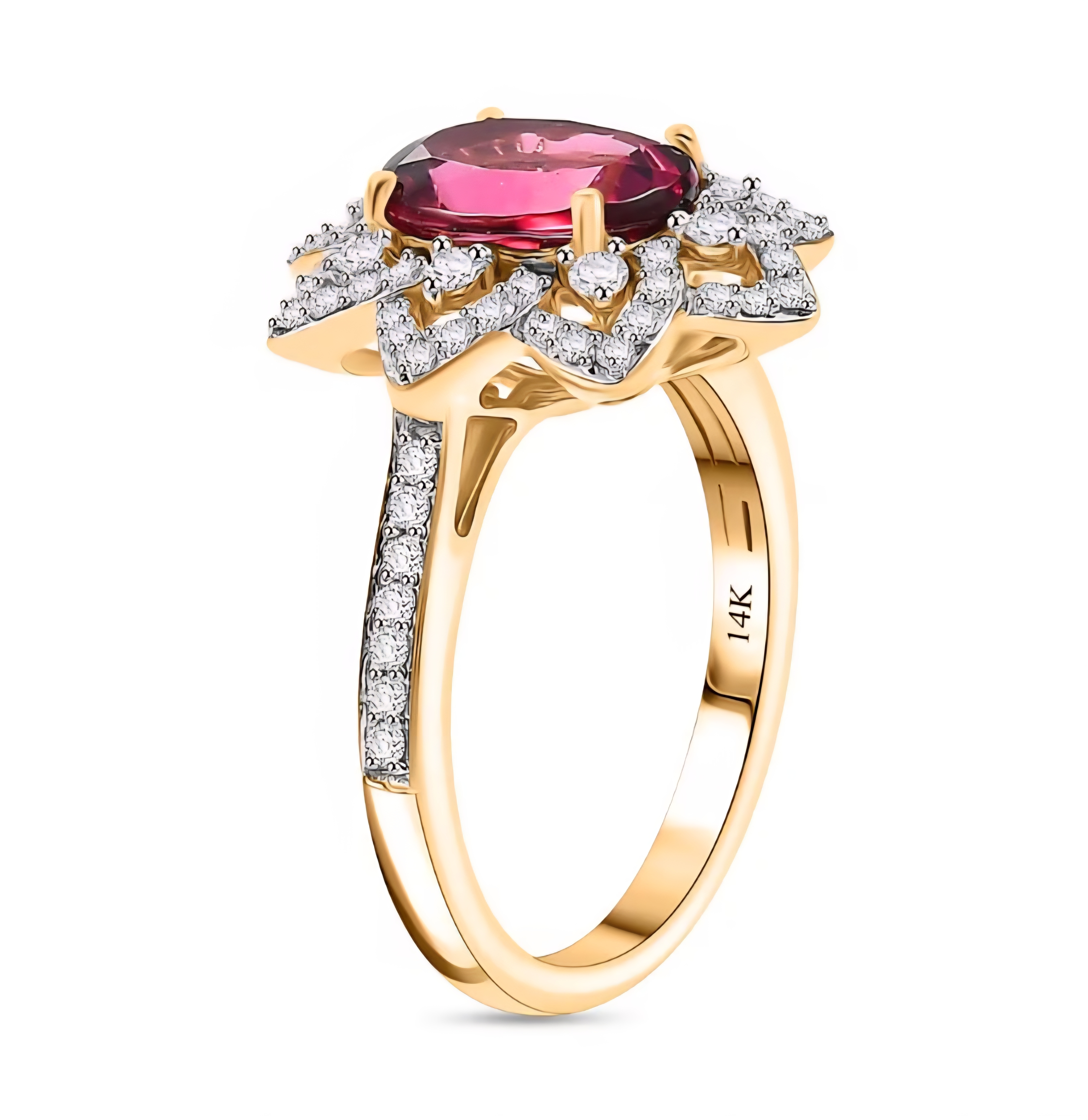 Bold color meets fine detail in this rubellite tourmaline and diamond halo ring, crafted in solid 14K yellow gold. At the center is a vivid 2.20 carat oval rubellite tourmaline with a rich pink red hue, chosen for its saturated color and unmistakable presence.