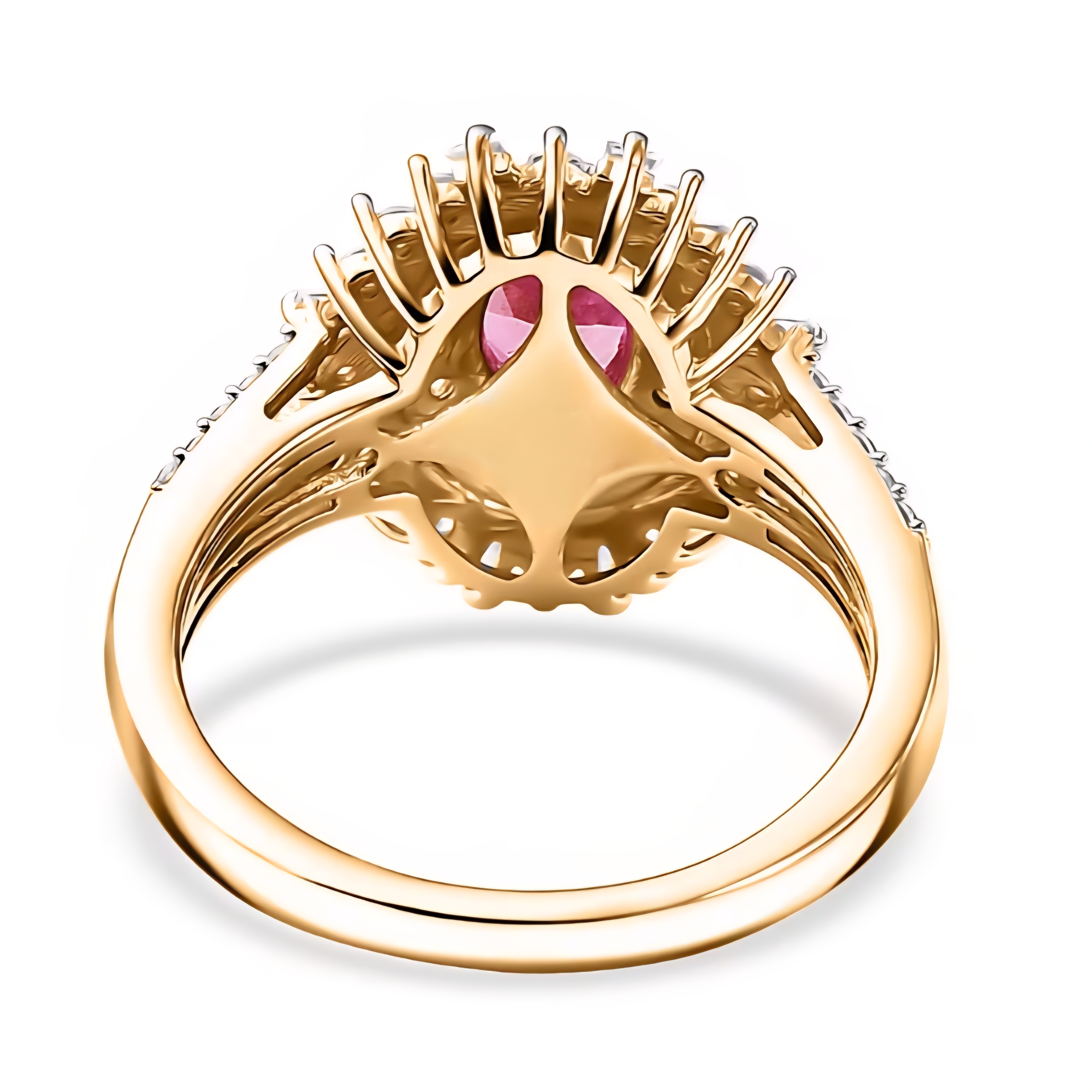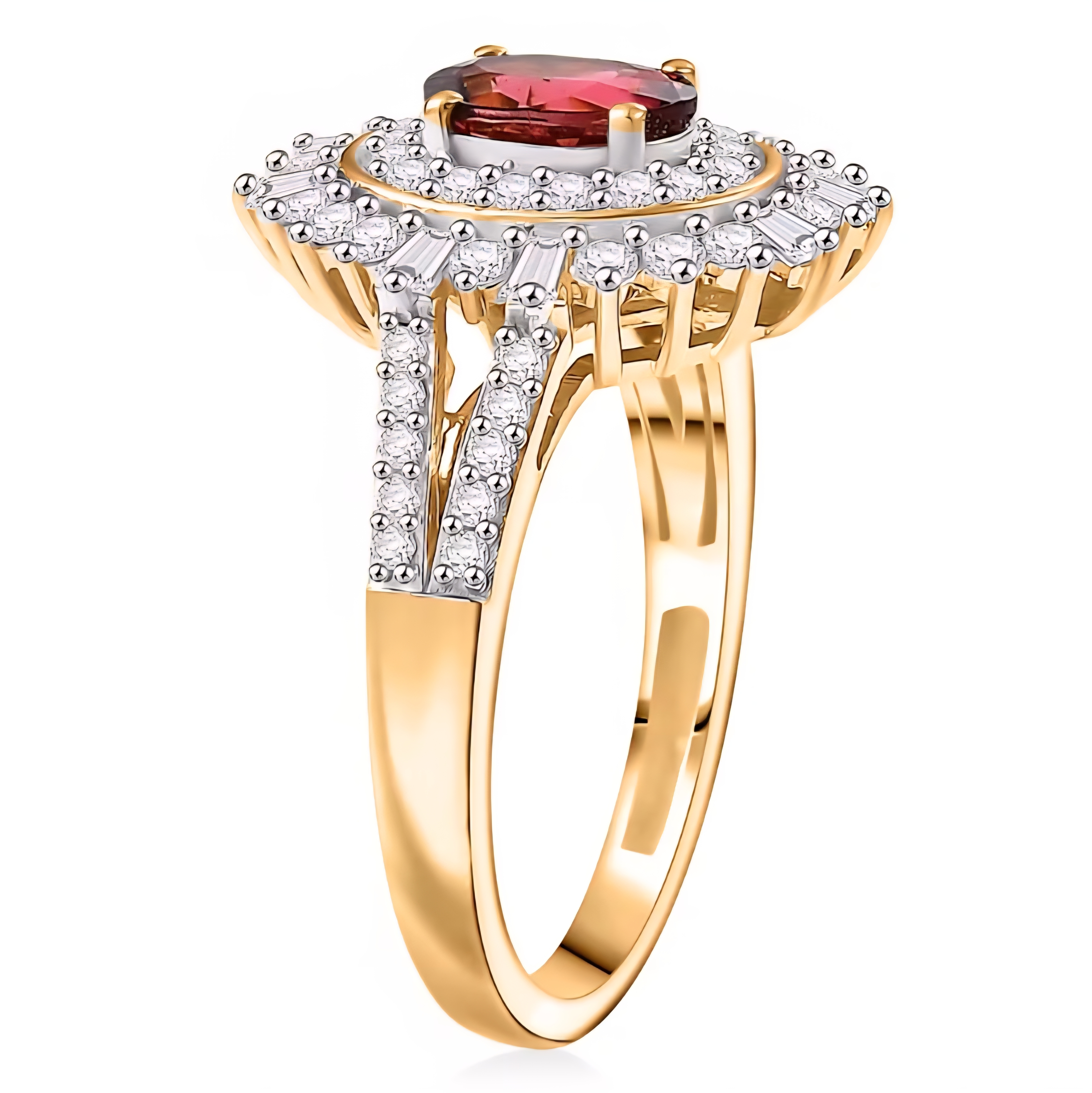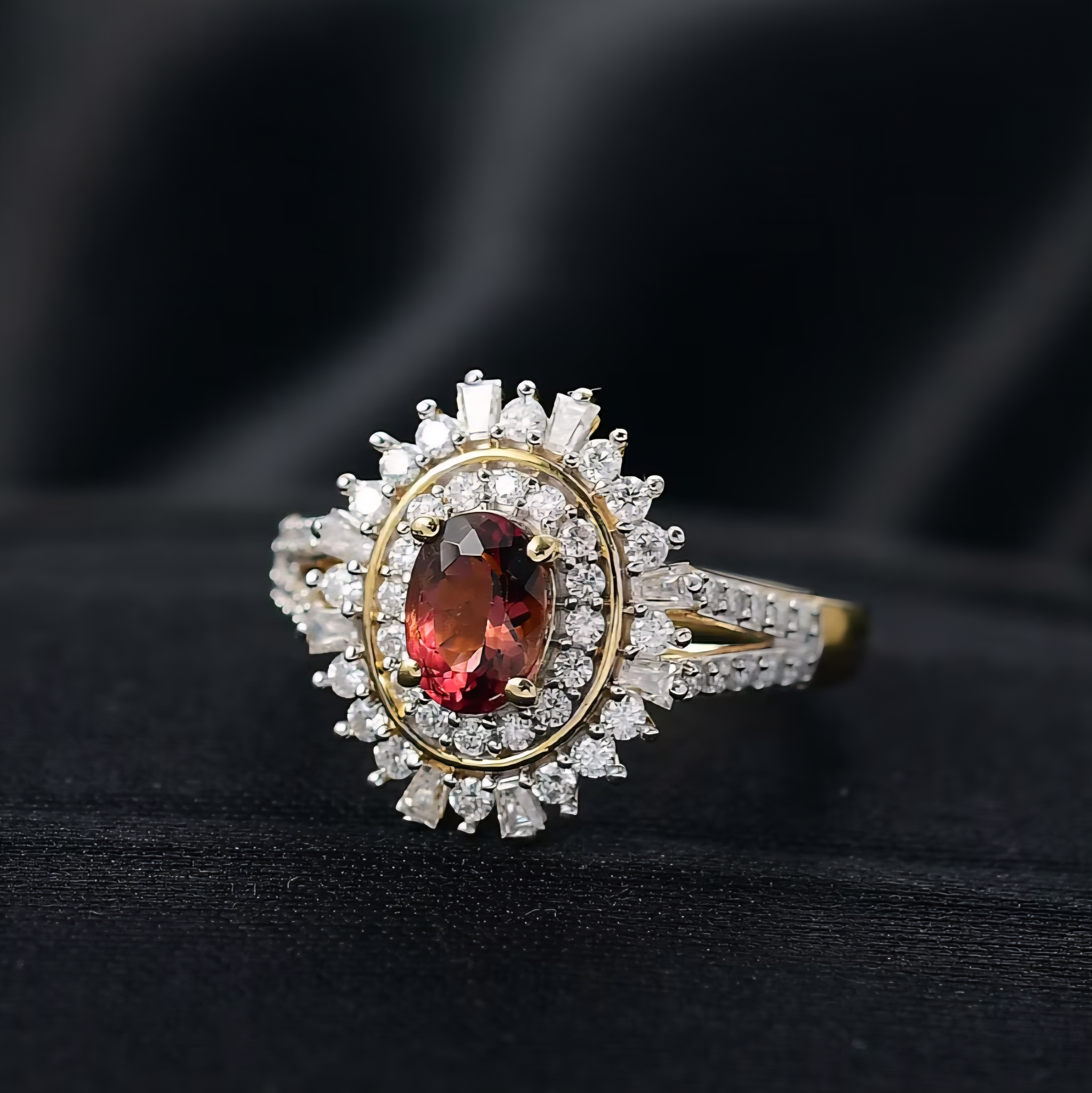 Then the design goes full power mode. The rubellite is wrapped in a double halo of moissanite, mixing brilliant round stones with tapered baguettes for that sharp, high end flash you normally only see in diamond-heavy pieces. The baguettes create a starburst effect, while the round stones keep the sparkle constant from every angle. Finished in rich 18K yellow gold over solid sterling silver, this ring hits hard. It is bright, fiery, and impossible to ignore.